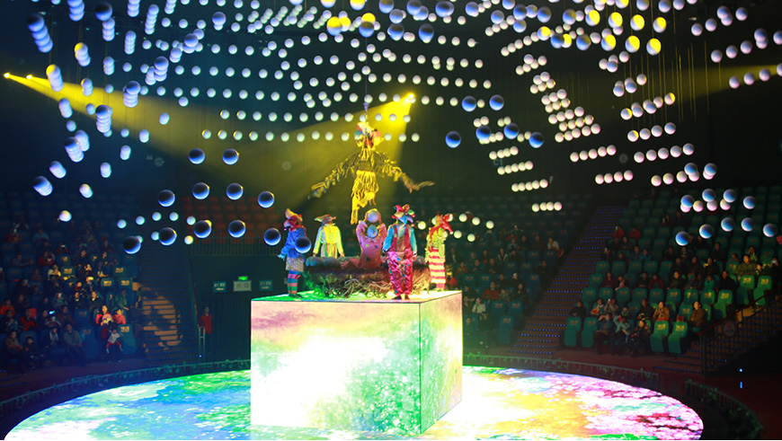 大型魔幻秀——《飞翔之歌》,通过讲述鸟与小丑的喜剧故事,表达了保护生态环境对所有生命都具有积极意义的主题。该项目将文化内涵和高科技手段巧妙结合,拥有超强LED铺就的高清视觉台面和上千个魔球组成的立体表演空间,色彩绚丽,场景宏阔,魔幻般地创造了一种新颖时尚的娱乐视野。
