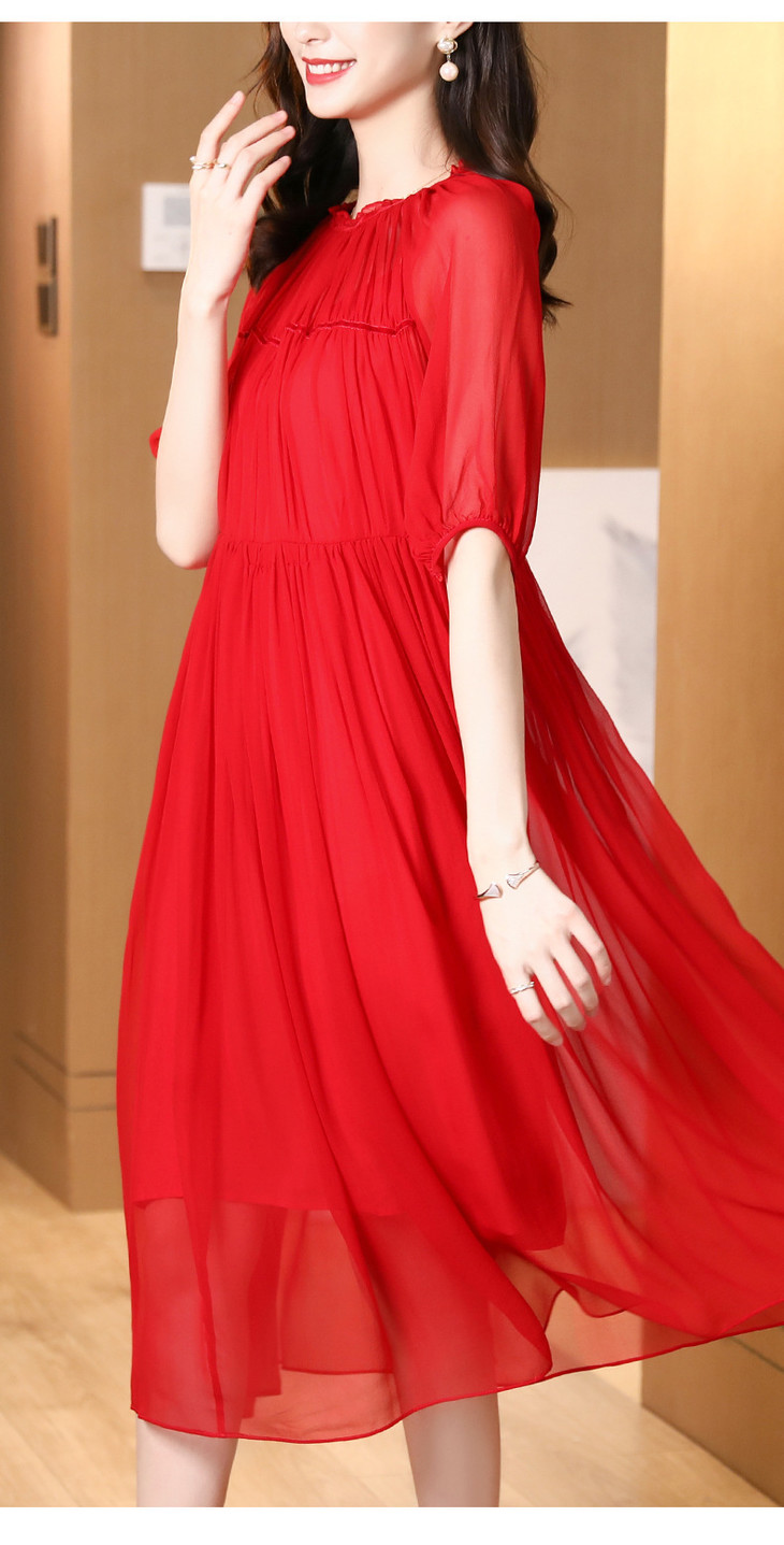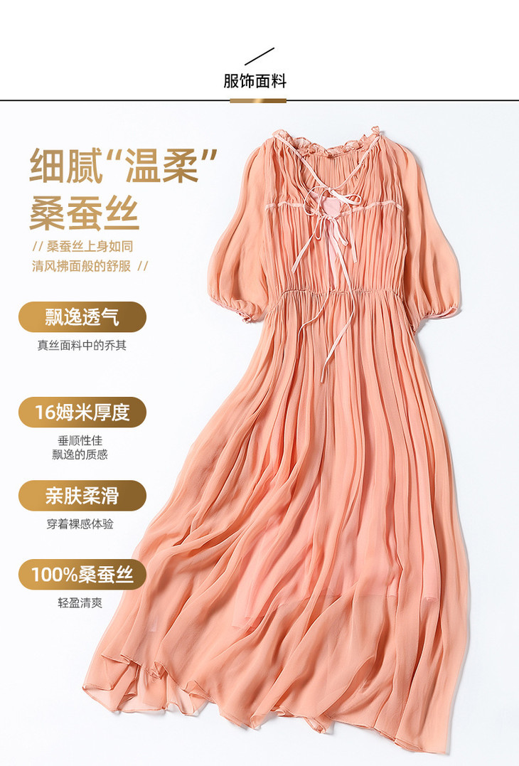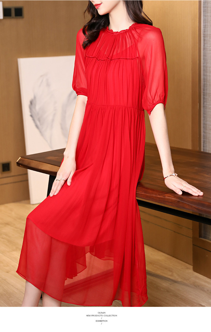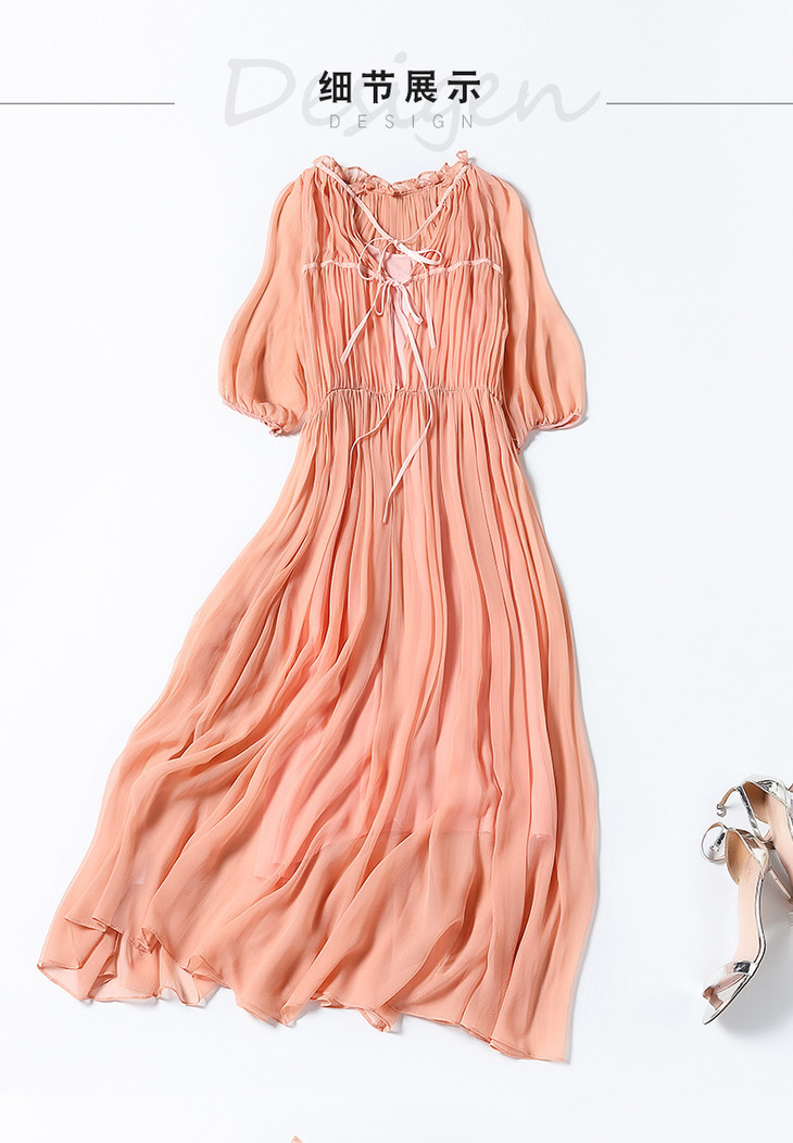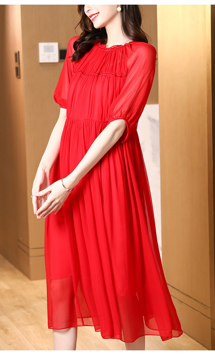 NYT- 2021_48-2021夏季新款圆领木耳边宽松a版系带纯色气质通勤真丝乔其连衣裙