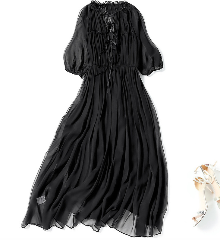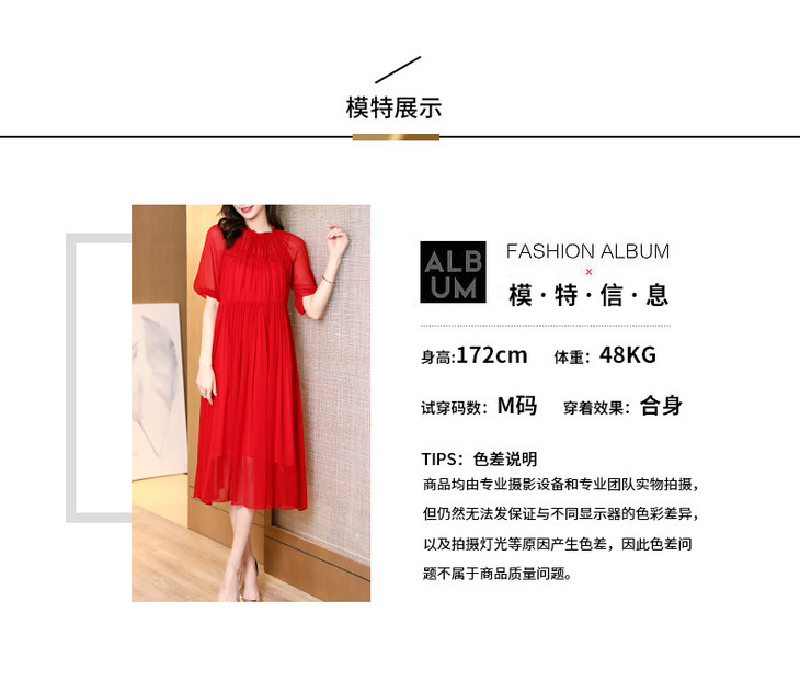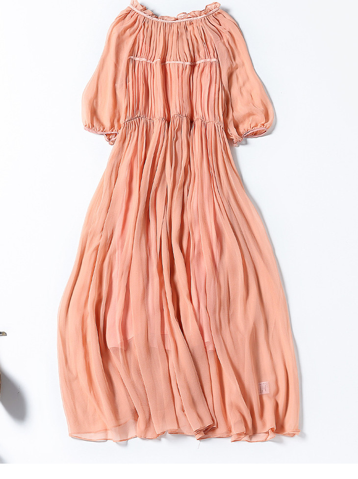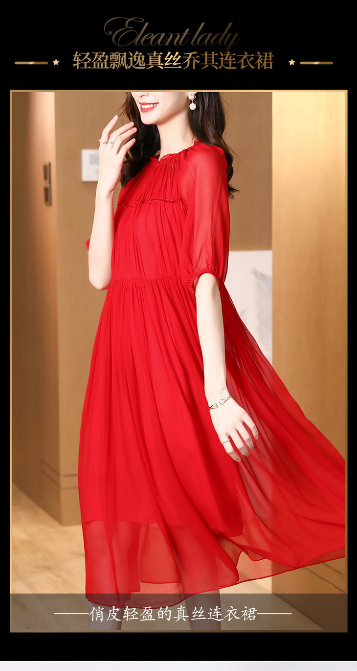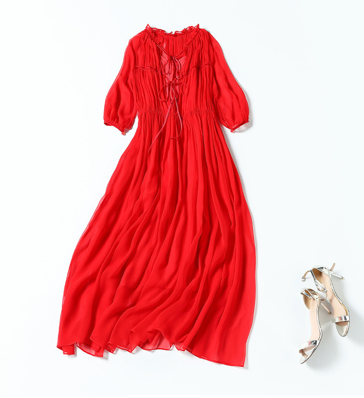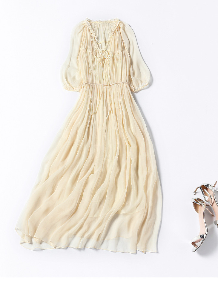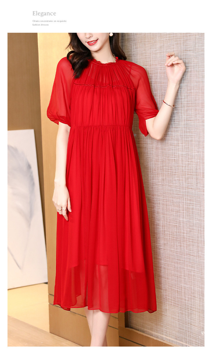 NYT- 2021_48-2021夏季新款圆领木耳边宽松a版系带纯色气质通勤真丝乔其连衣裙