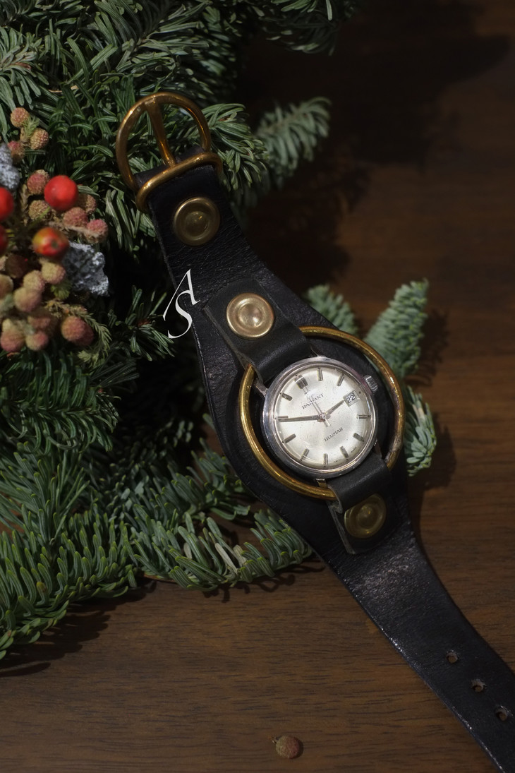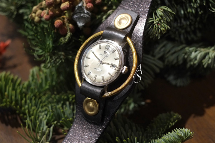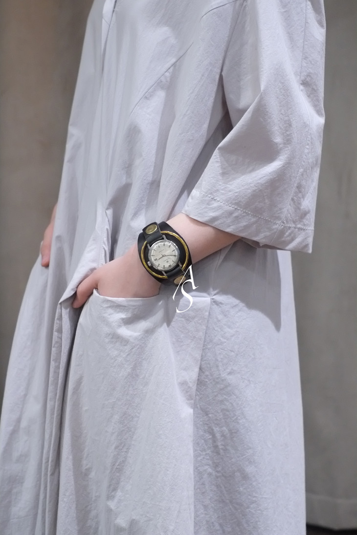 中间古董石英表源自1948年于西班牙创立的手表品牌Radiant。其手表为瑞士制造(Swiss Made),历经近半个世纪依然可以上弦走针。设计师加上植糅小牛皮与金属铜等配件进行再创作,呈现蒸汽朋克风格的新貌。