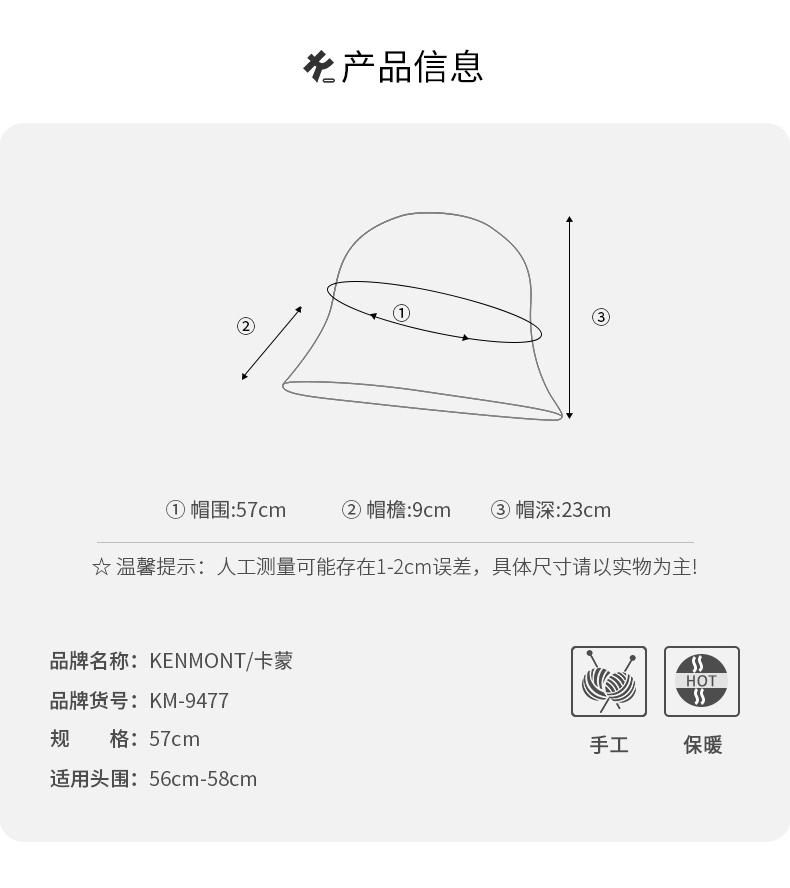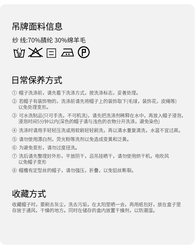 【其他注意事项】注意帽子的洗涤方式,每顶帽子都有吊牌