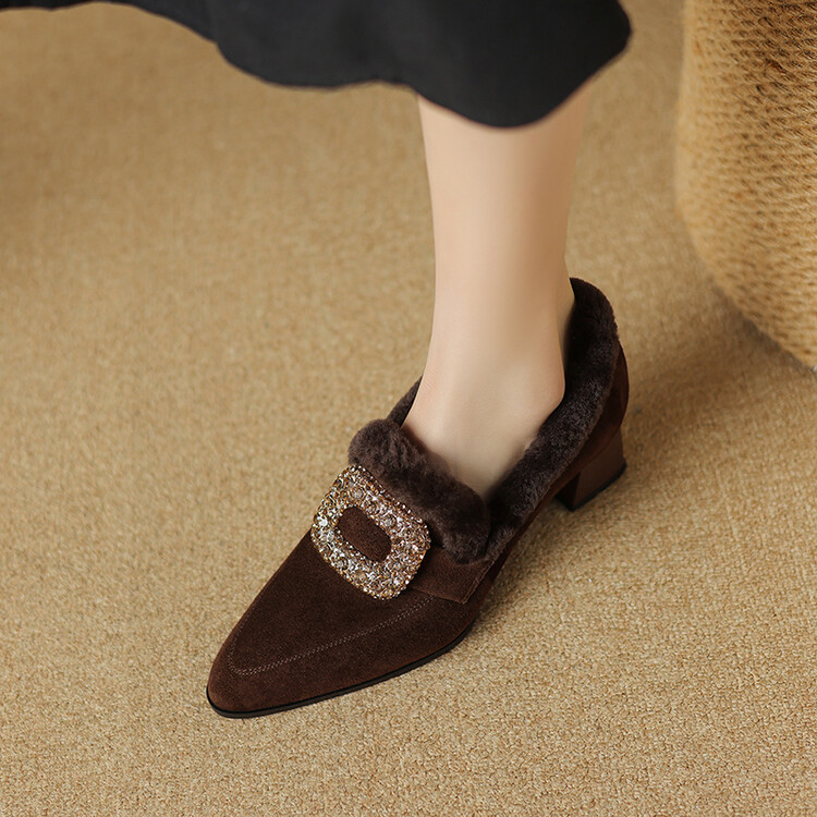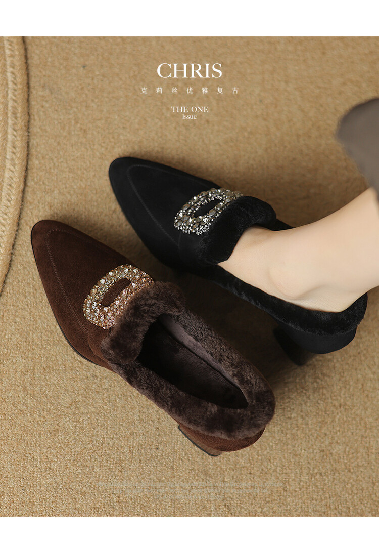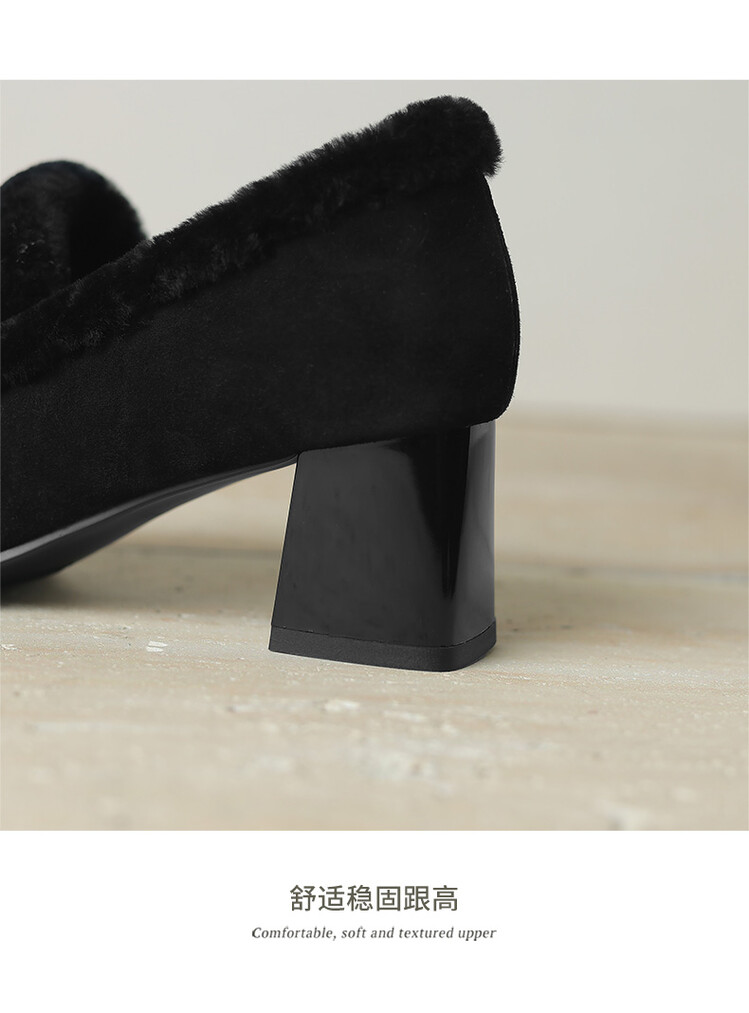 【预售5天】秋冬季尖头复古粗跟羊羔毛深口乐福鞋女加绒翻毛皮粗跟高跟鞋DB&M5756R-1