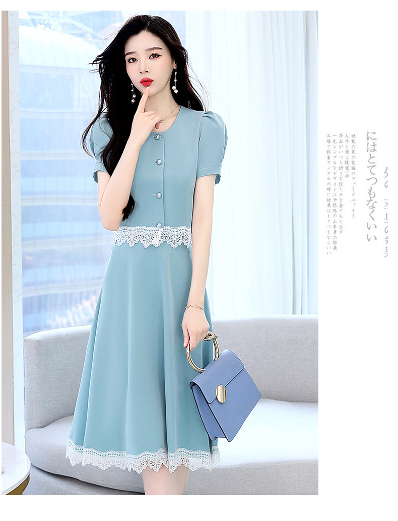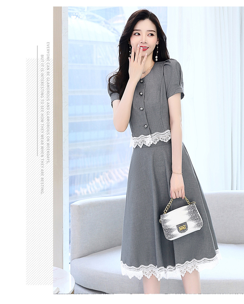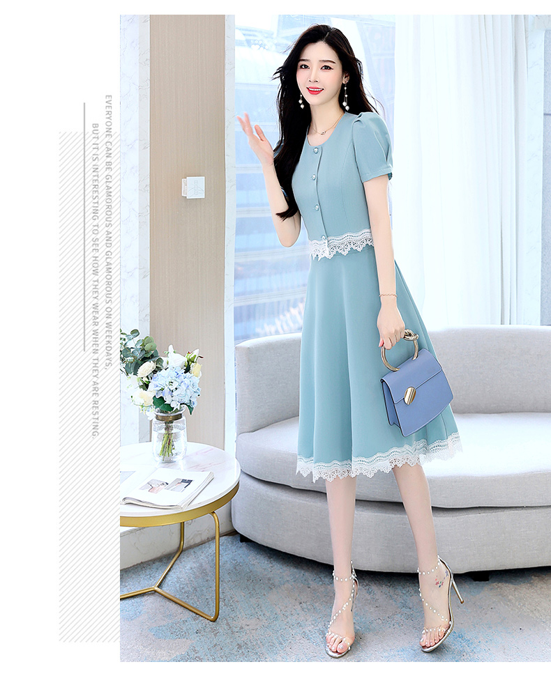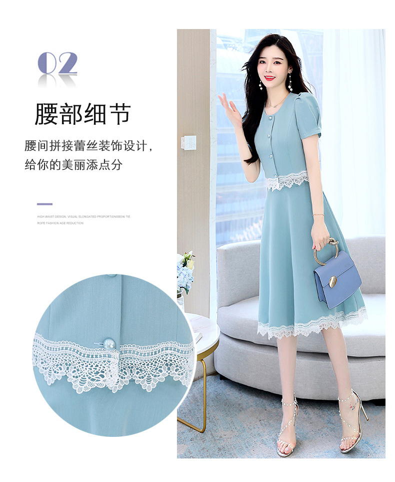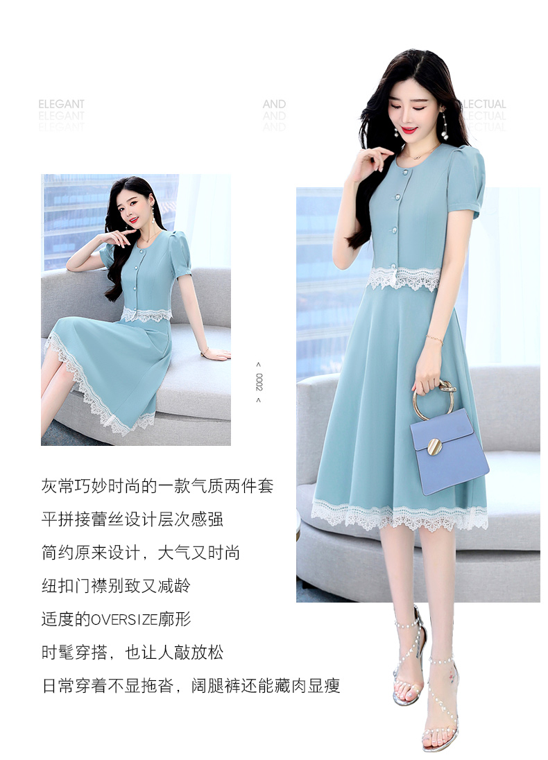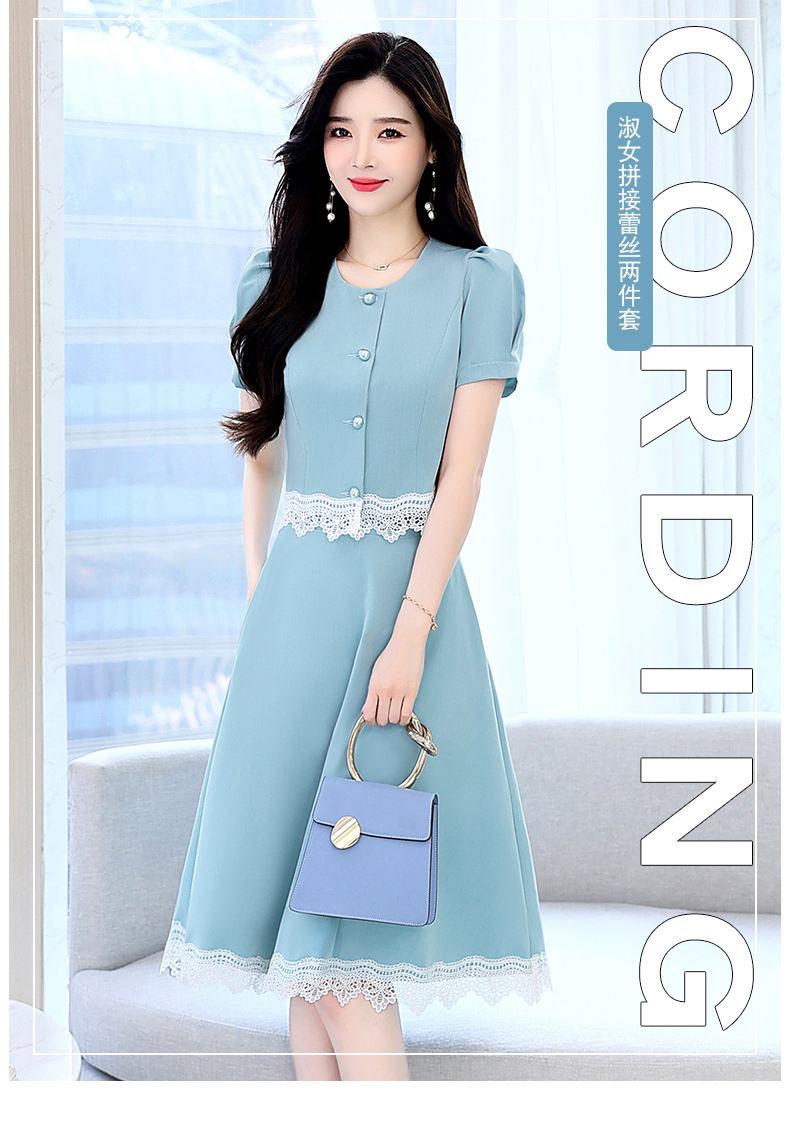 气质新款,淑女拼接蕾丝圆领单排扣短袖两件套HR-LT8186-1