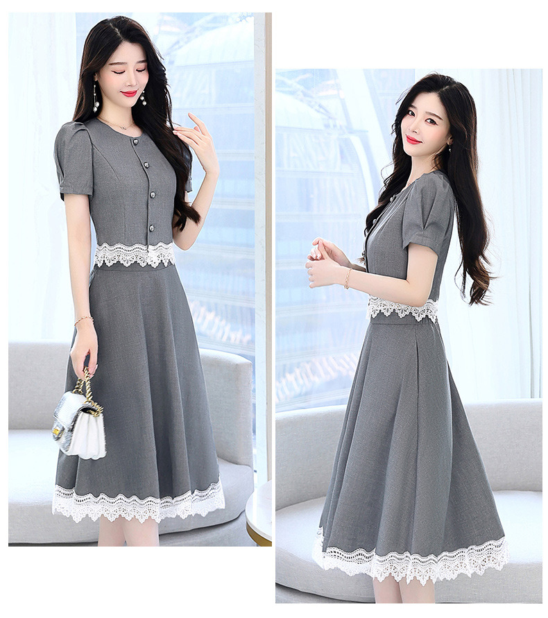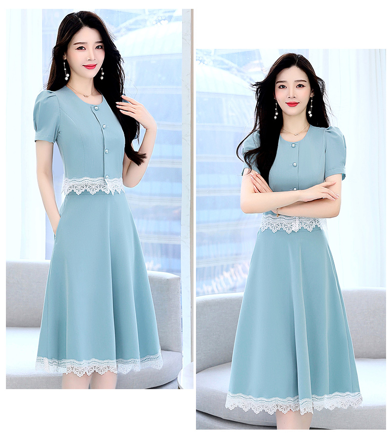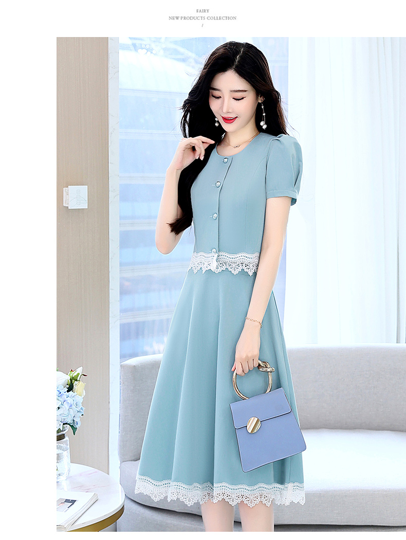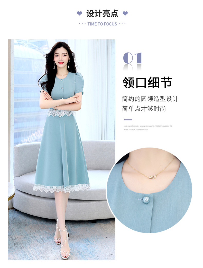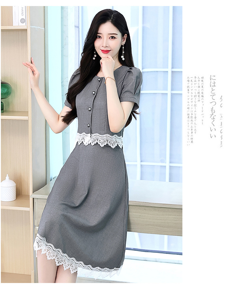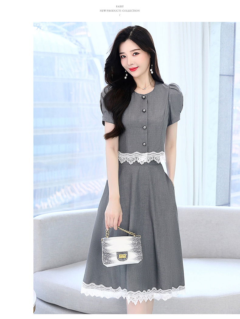 气质新款,淑女拼接蕾丝圆领单排扣短袖两件套HR-LT8186-1