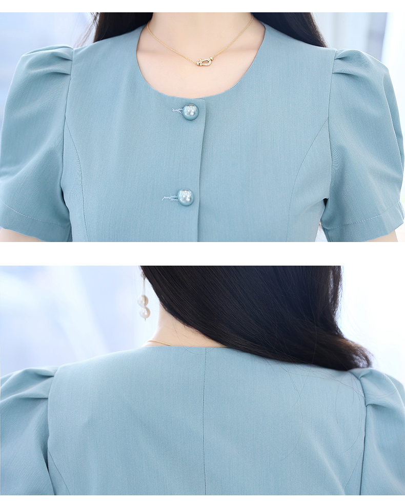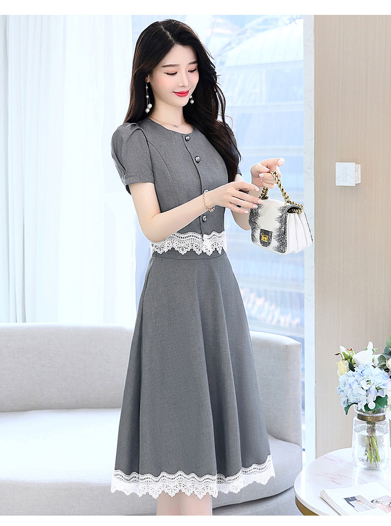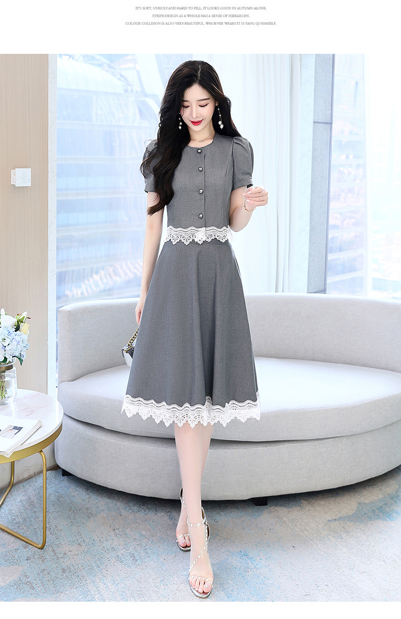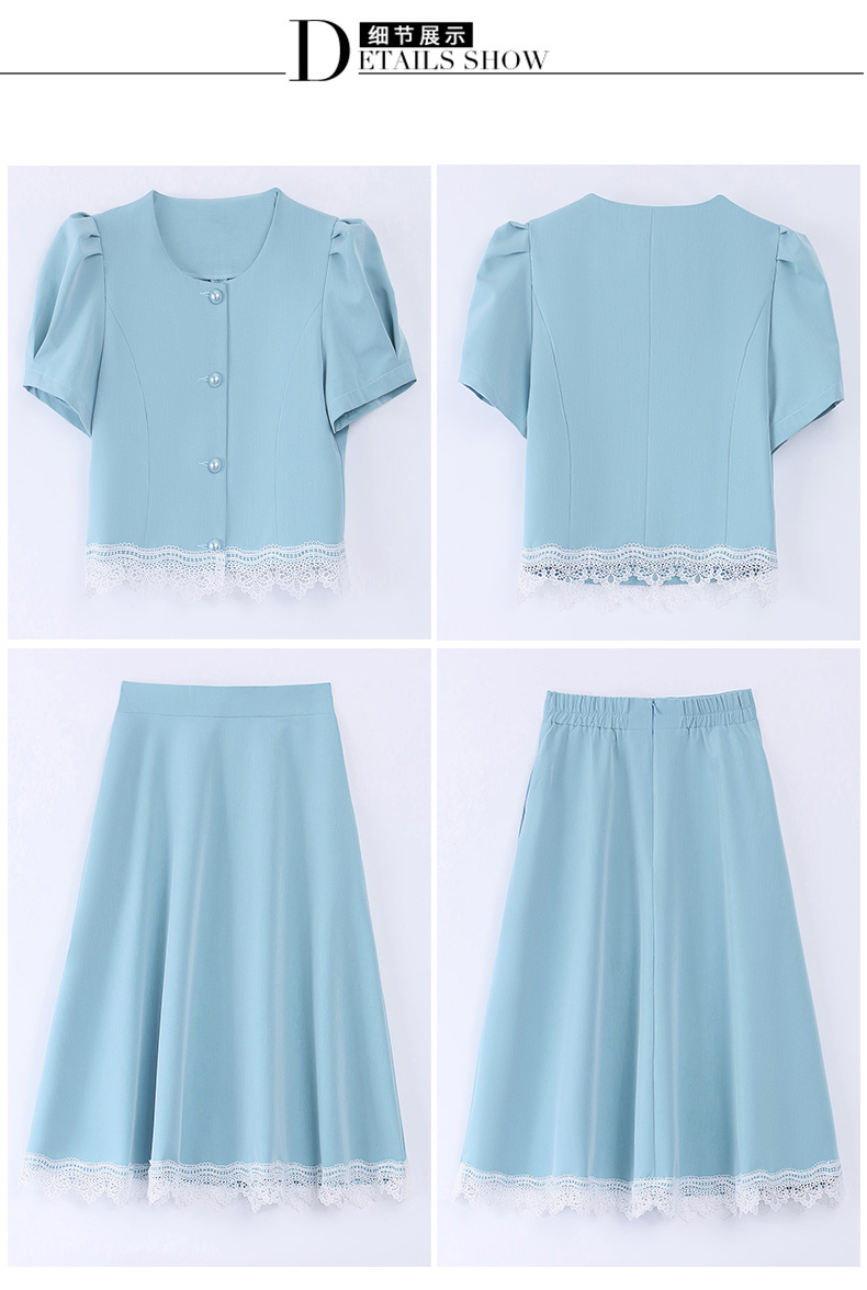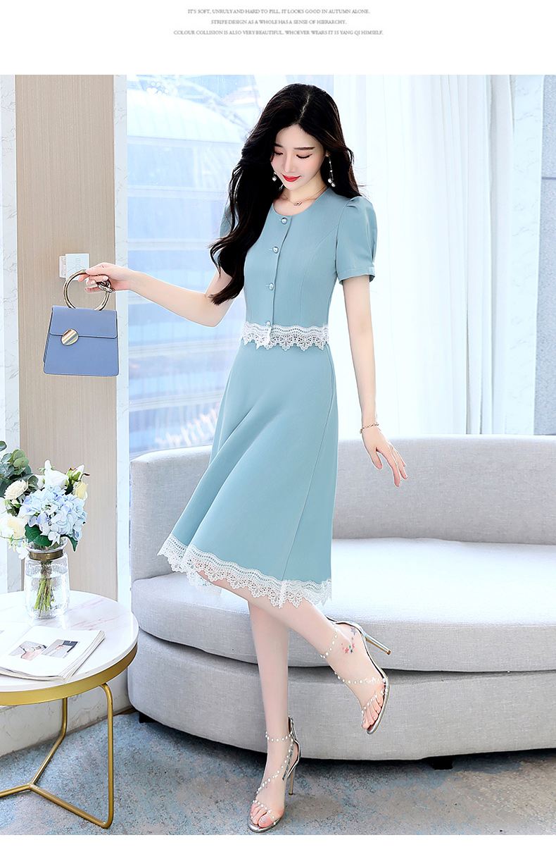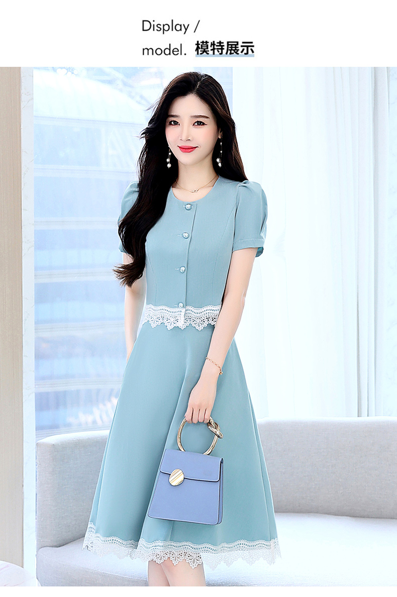 气质新款,淑女拼接蕾丝圆领单排扣短袖两件套HR-LT8186-1