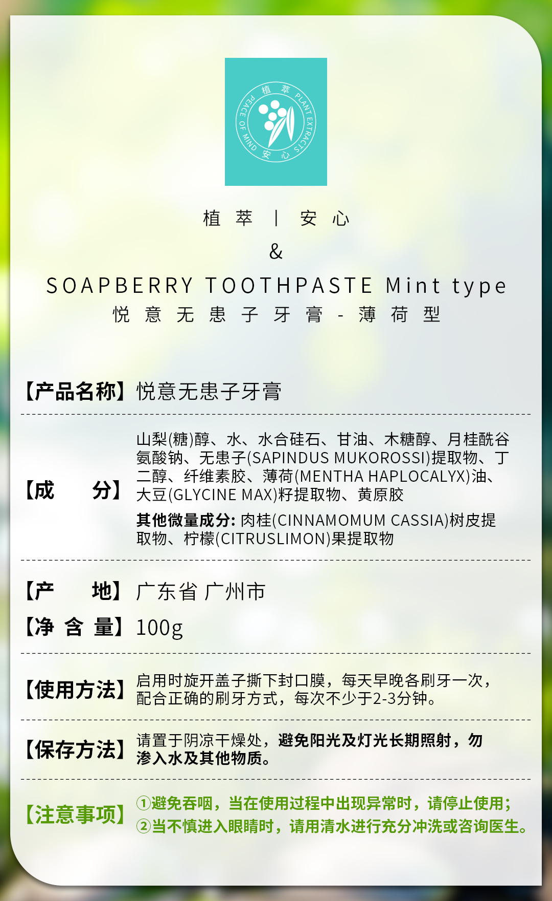 悦意无患子牙膏 薄荷型 100g*2 植物清洁护口腔 清新口气全家享