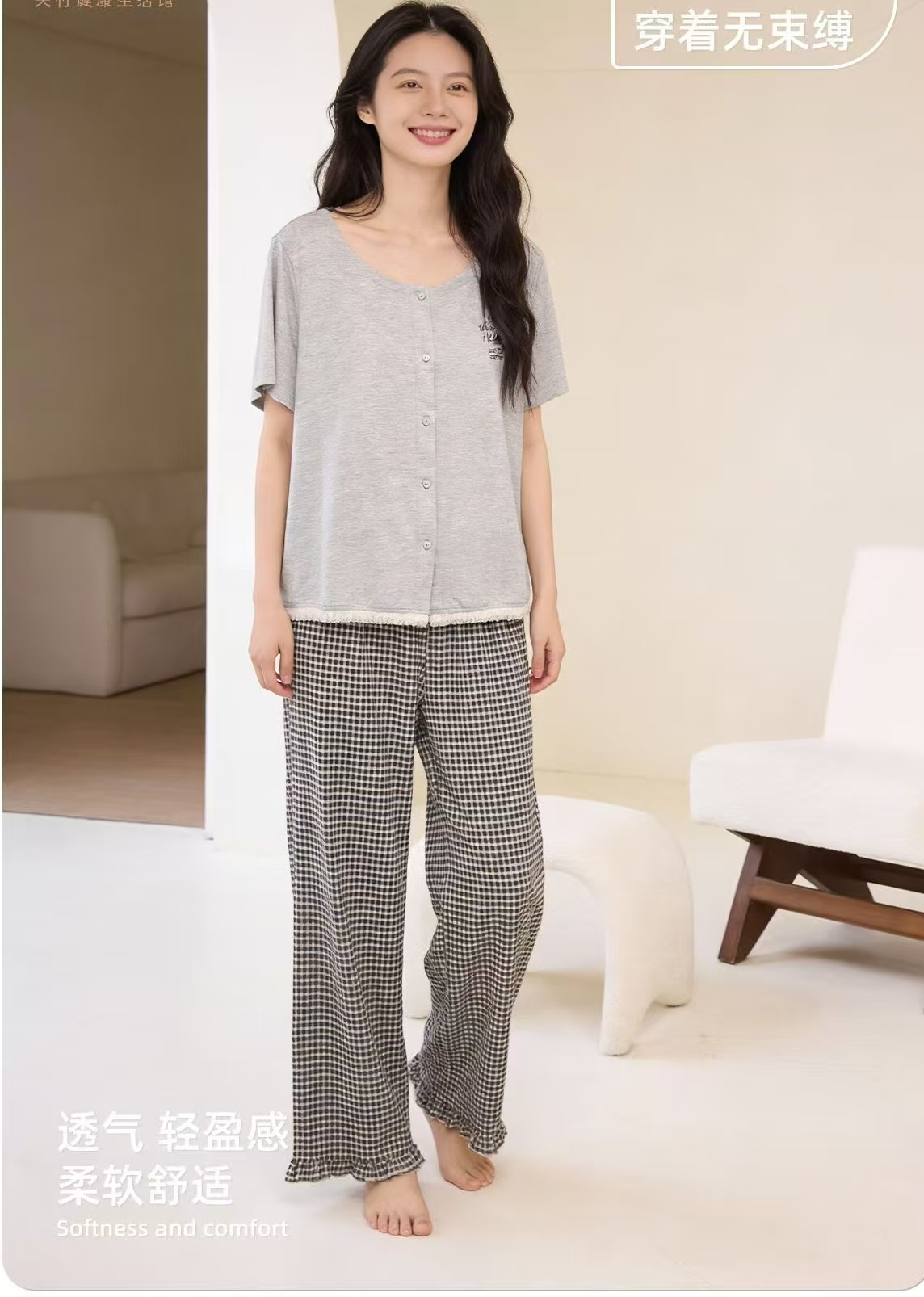 【品名】TZ竹纤维女士圆领开衫短袖长裤家居套2412