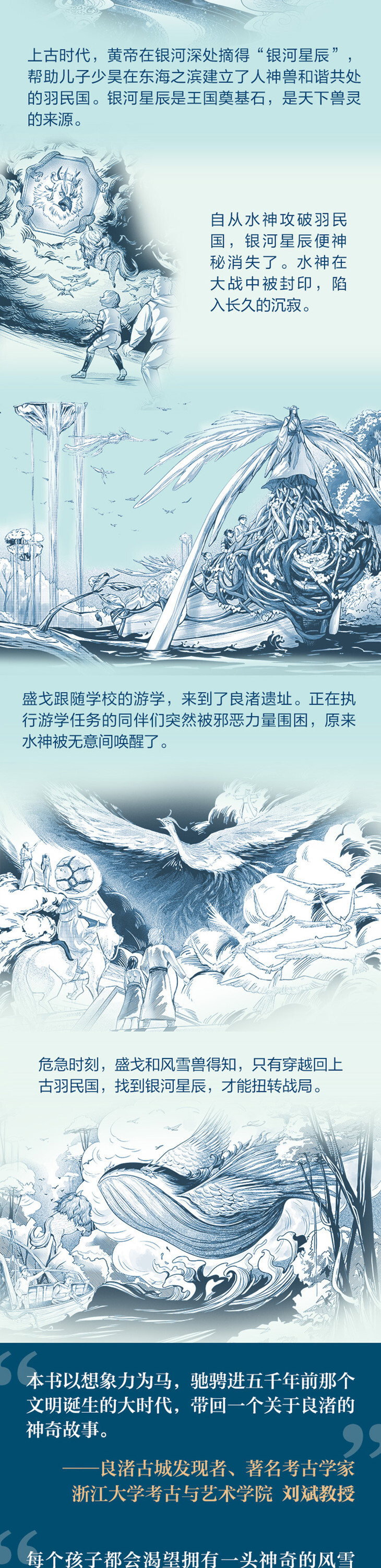 盛戈参加学校的游学活动,来到了良渚遗址——数千年前羽民国的所在地。起初执行课程任务顺利的同伴们,突然被一股邪恶力量围困,脱身不得,连强大的风雪兽也无计可施。原来,水神竟然被无意间唤醒,挣脱了封印。危急关头,盛戈和风雪兽得知,只有穿越回上古羽民国找到银河星辰,才能扭转战局。