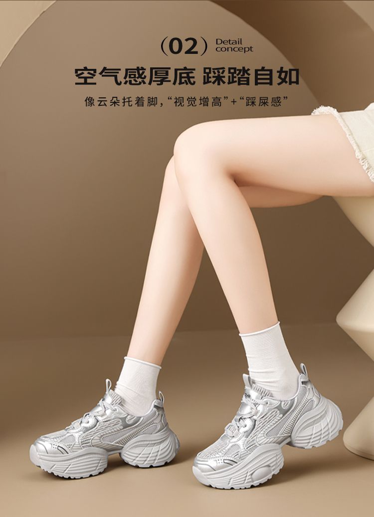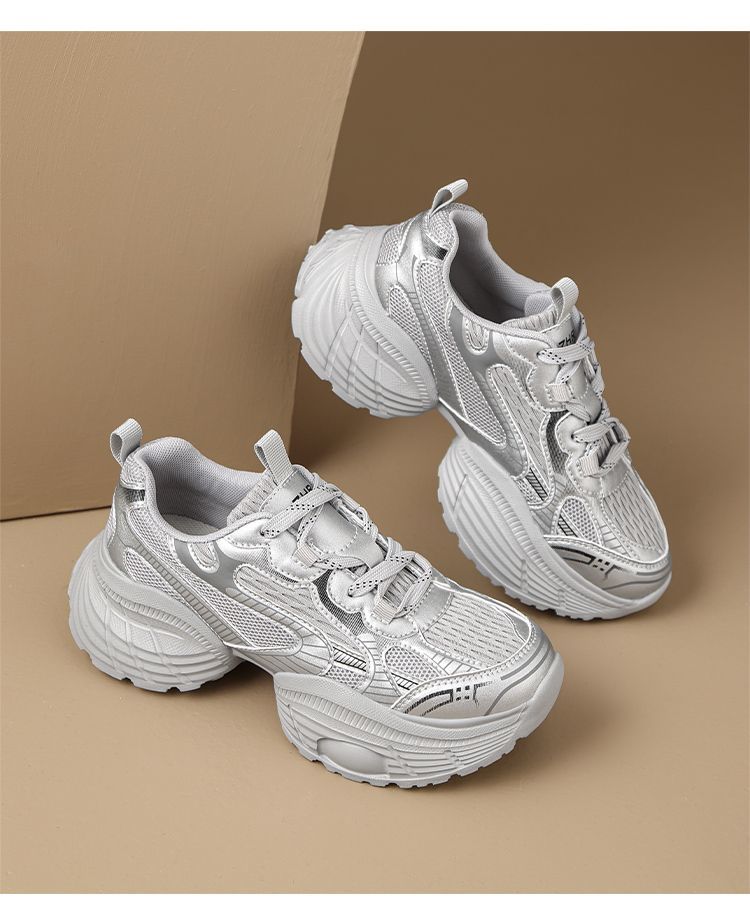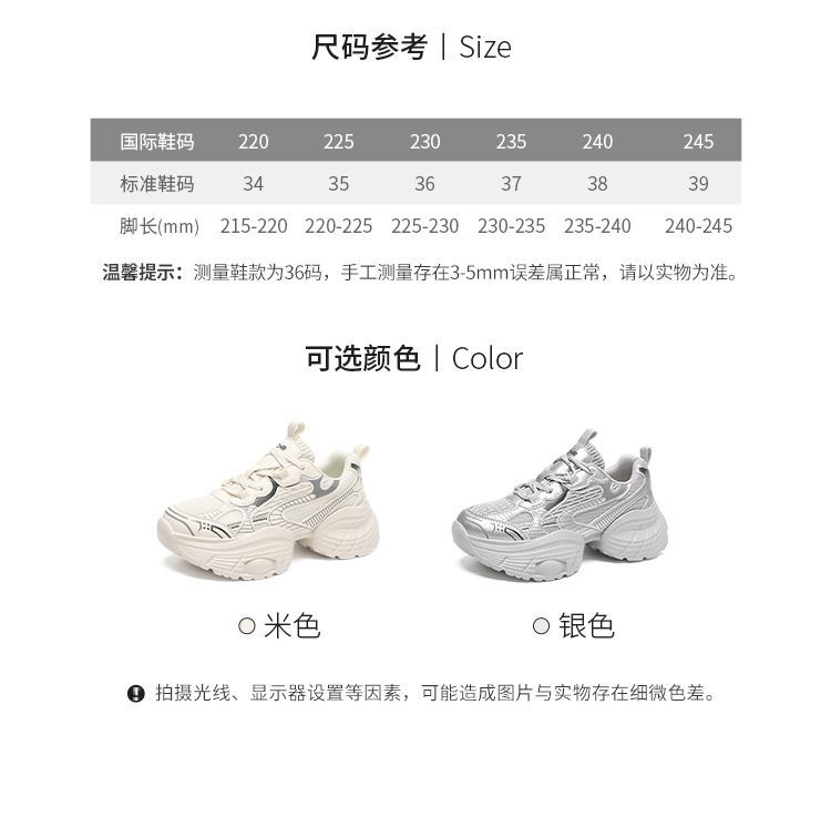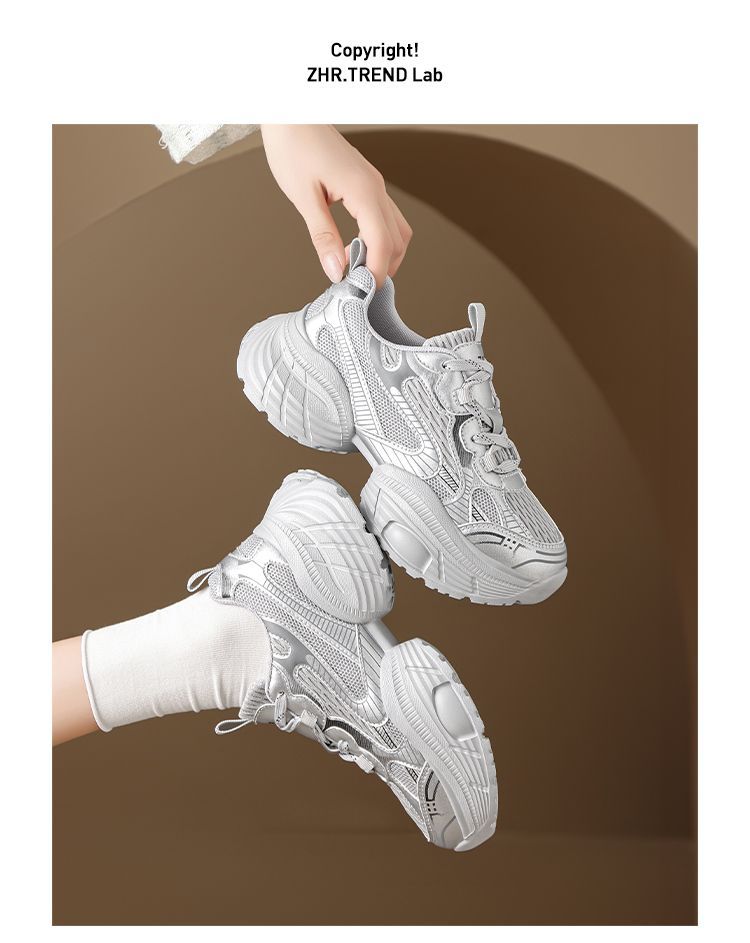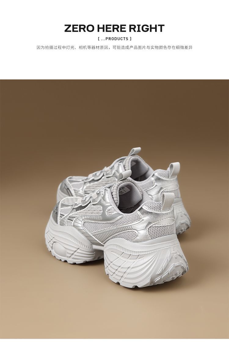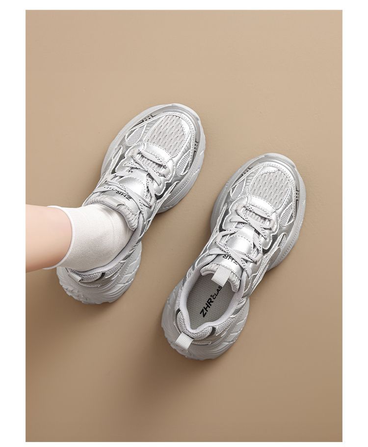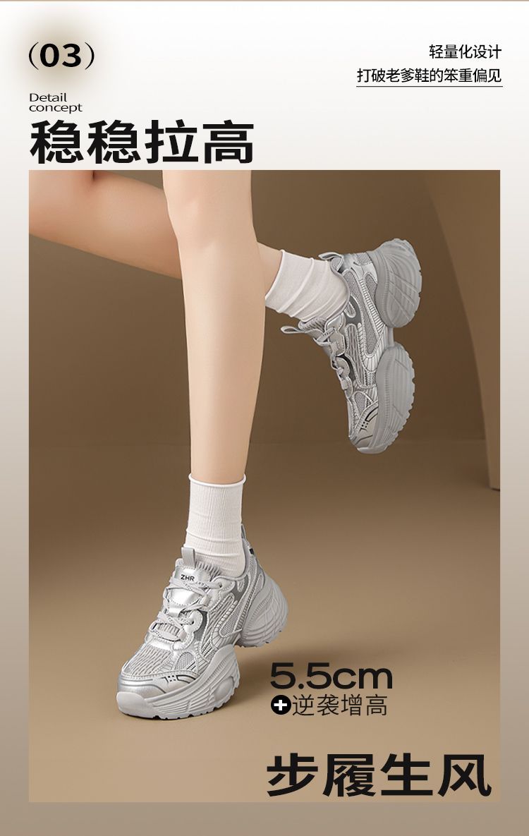 ZHR【增高5.5CM】银色厚底老爹鞋女网面透气运动鞋超软轻便休闲鞋