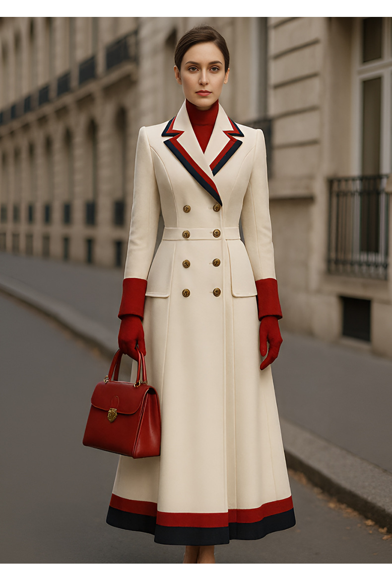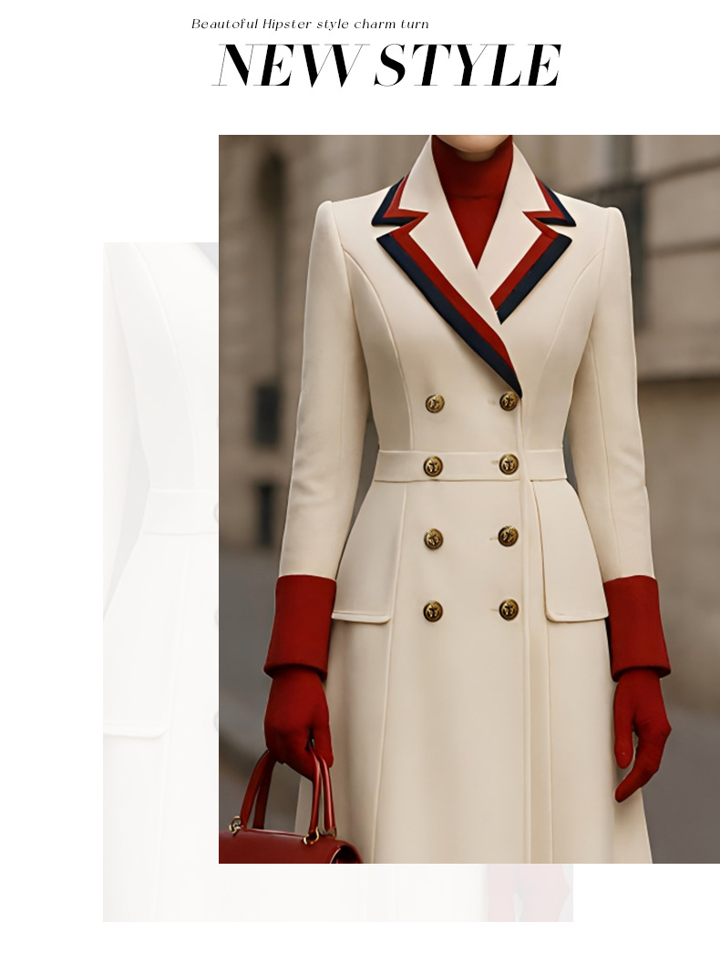 2025新款秋冬拼色毛呢大衣,法式金属双排扣长款风衣外套OY250480