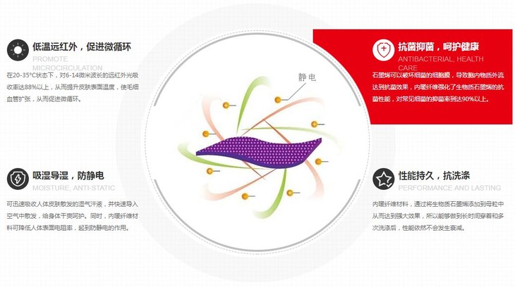 具有远红外理疗、吸湿导湿、抗抑菌、抗静電、抗紫外线、持久不衰减等多种功能!