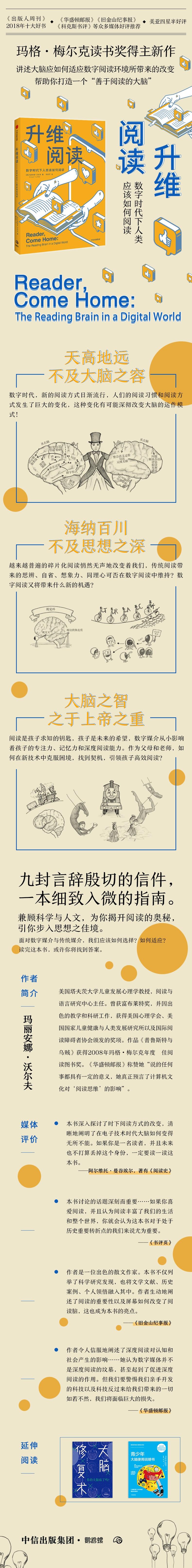 面对数字媒介和传统媒介这两种阅读方式,我们应如何应对?下一代人从小就深受数字媒介的侵染,这是否会影响他们的专注力和深度阅读的能力?儿童应如何整合大脑的深度学习过程,从而提高专注力和阅读能力?新时代应如何高效地阅读?在作者看来,新的阅读方式给我们带来困境和挑战的同时,也提供了发展的契机。数字阅读的影响不全是负面的。相反,适应了这种阅读方式的大脑将具有极强的处理繁杂信息的能力,这是传统阅读模式下的大脑所不具备的。