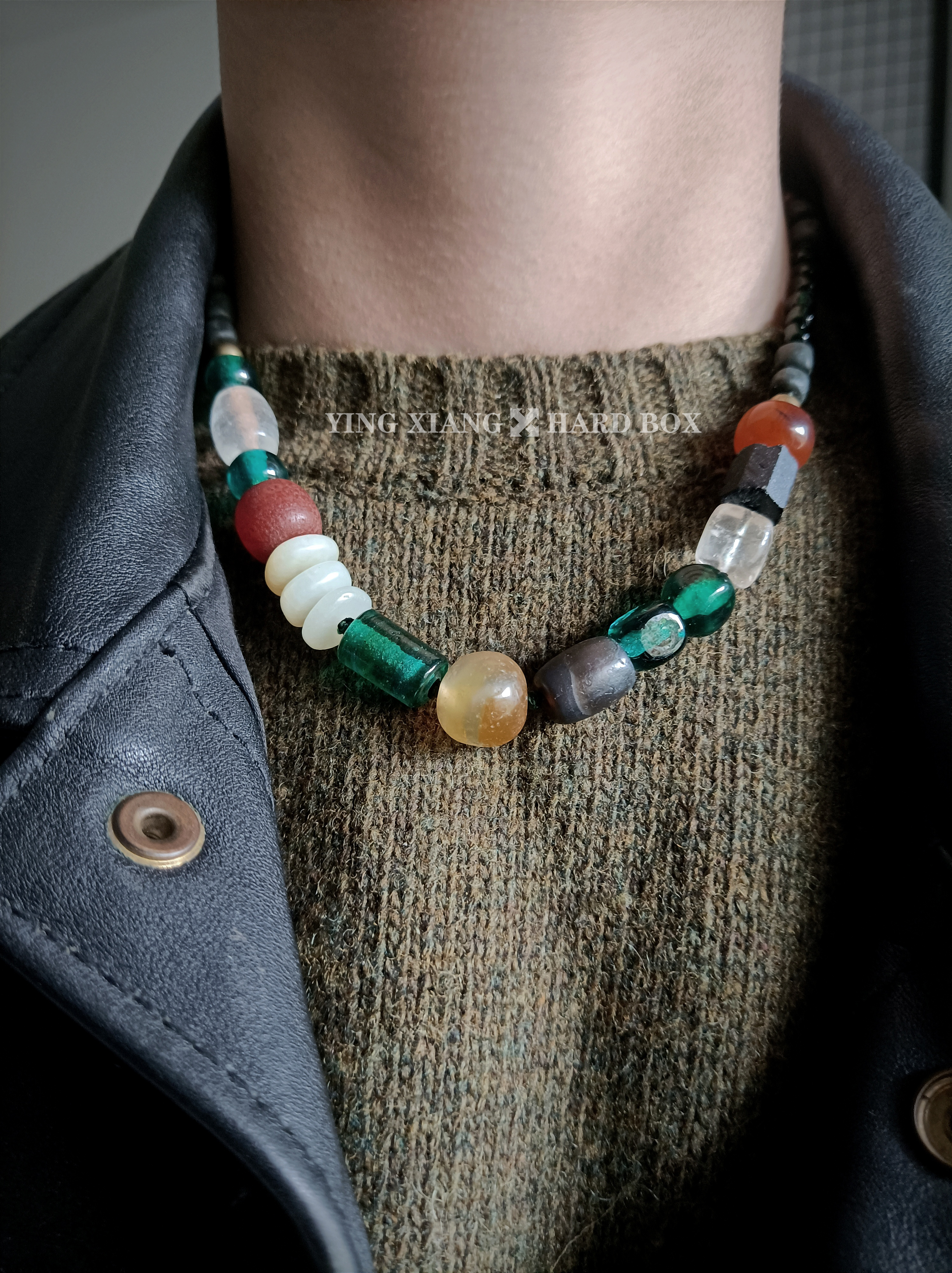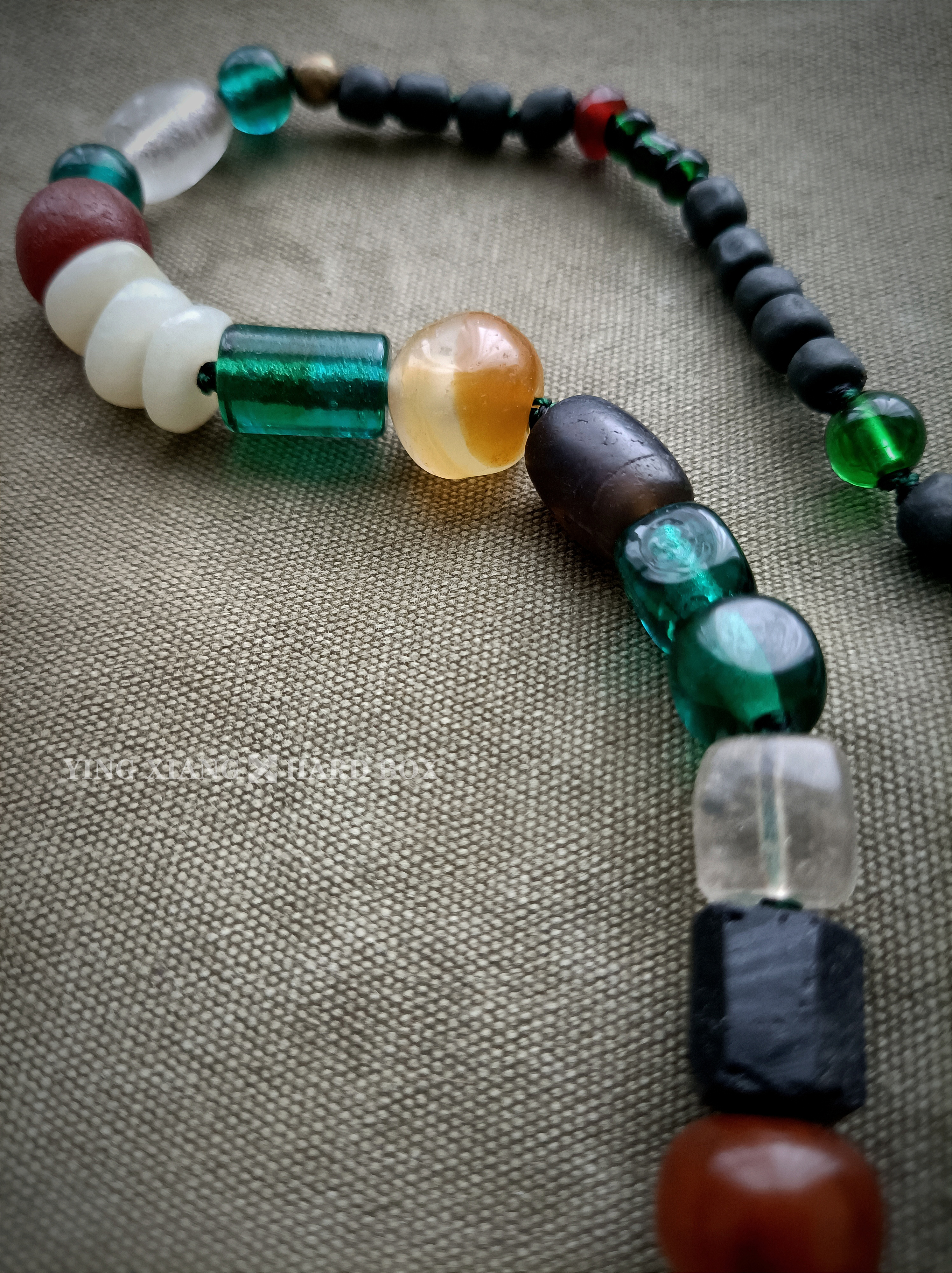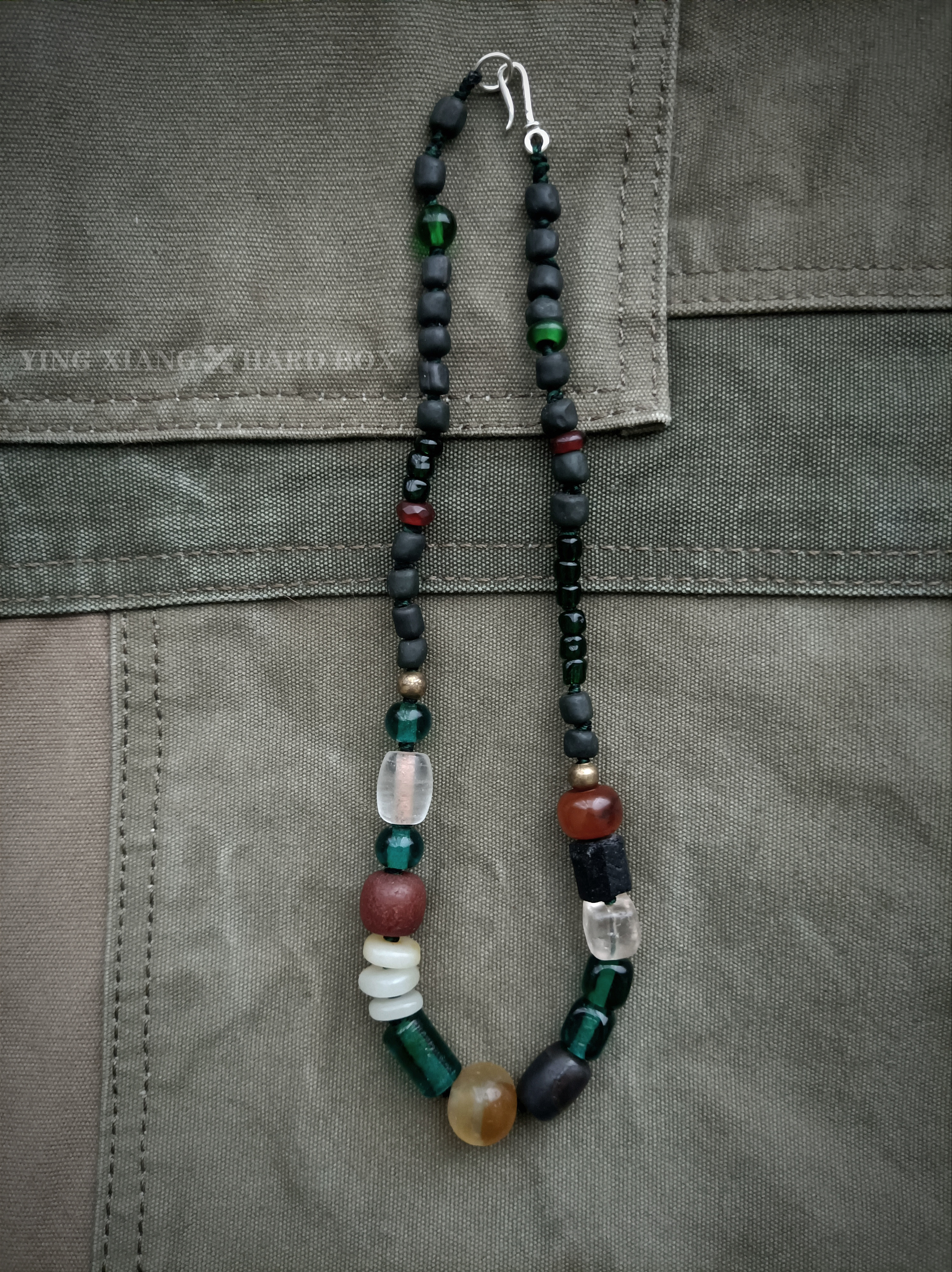 西亚老玛瑙珠 老琉璃珠+管 天然黑碧玺粗面不定型 西亚老水晶 和田玉隔片 老铜珠 925银连接扣