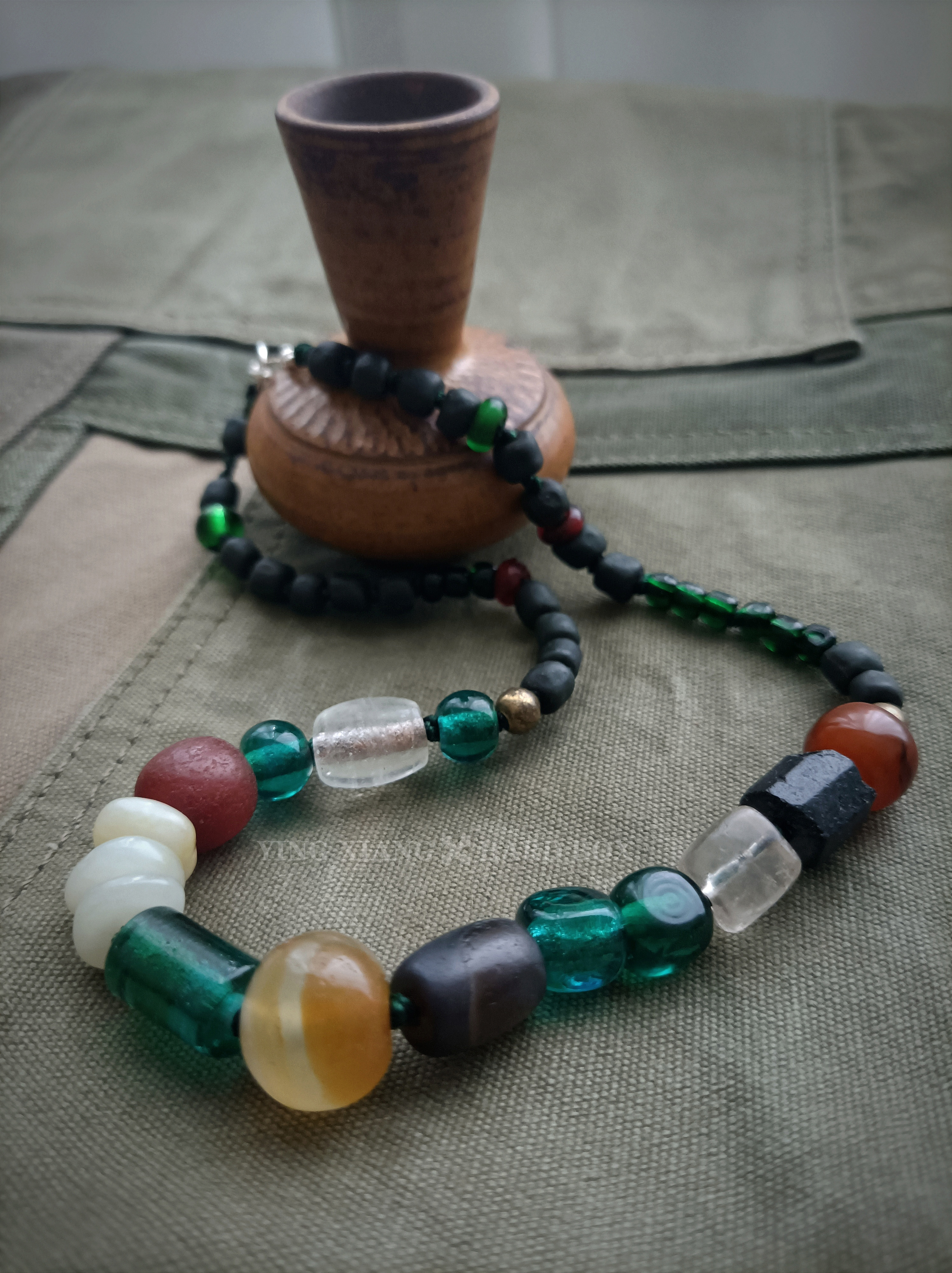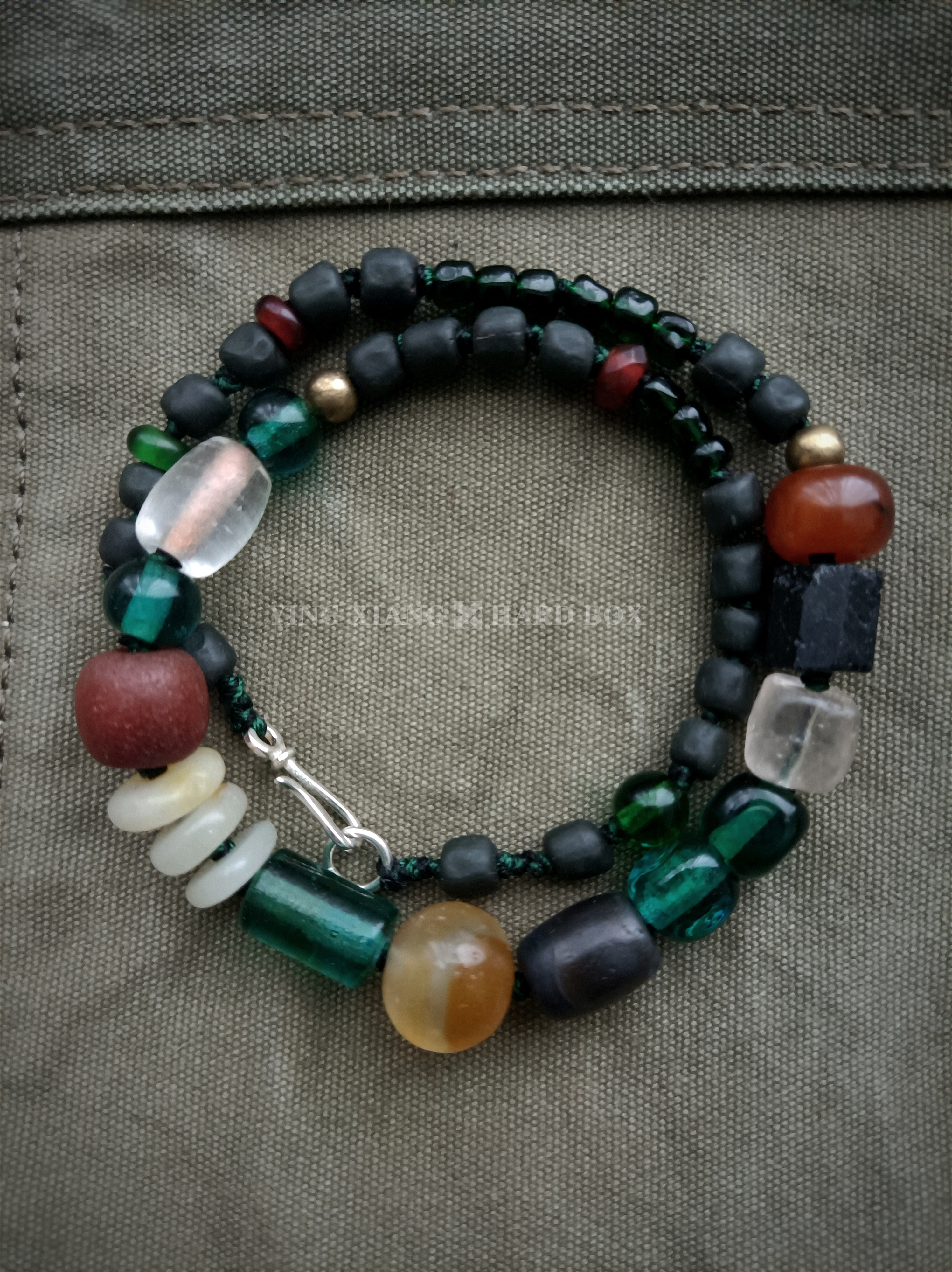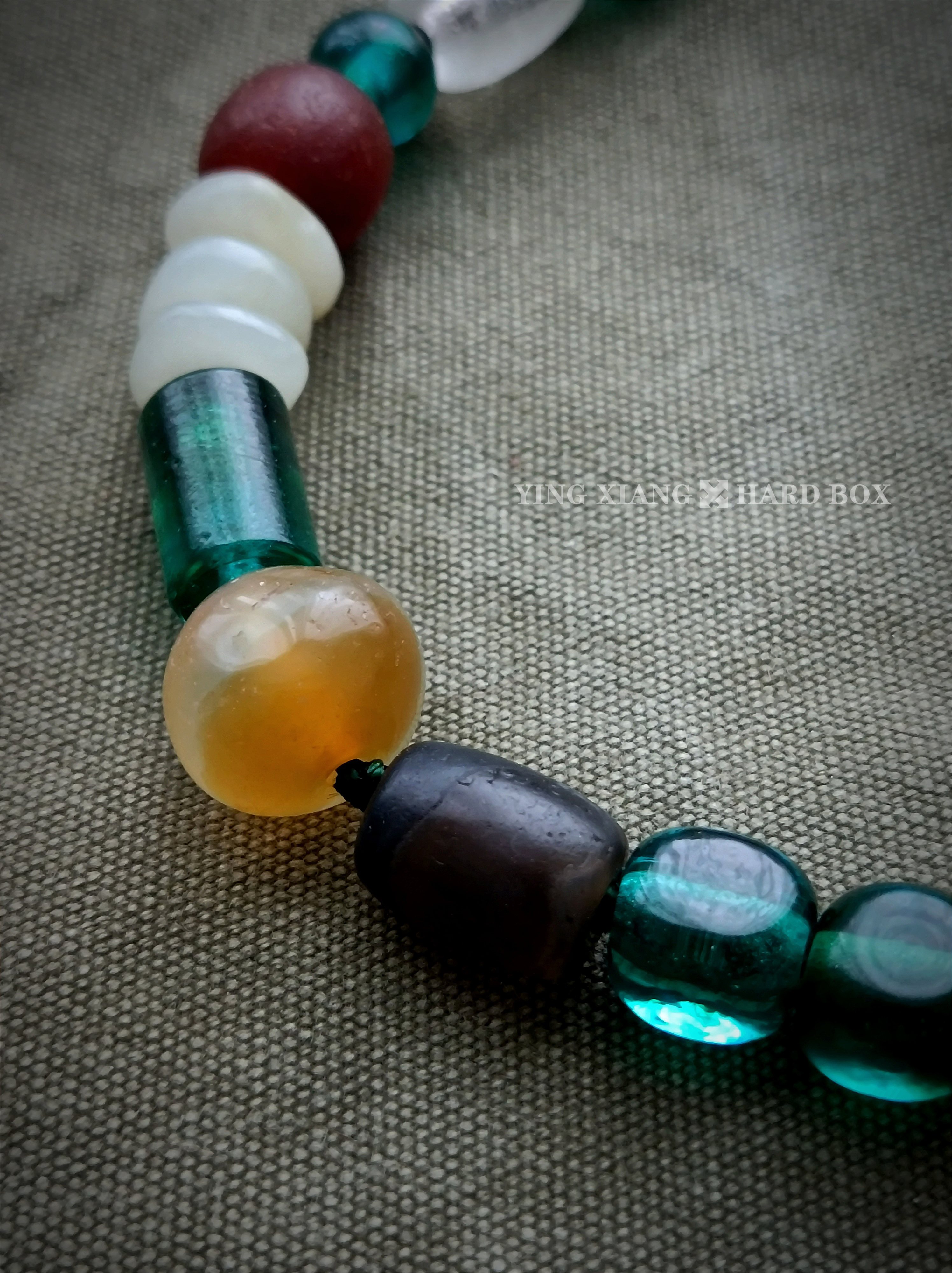 西亚老玛瑙珠 老琉璃珠+管 天然黑碧玺粗面不定型 西亚老水晶 和田玉隔片 老铜珠 925银连接扣