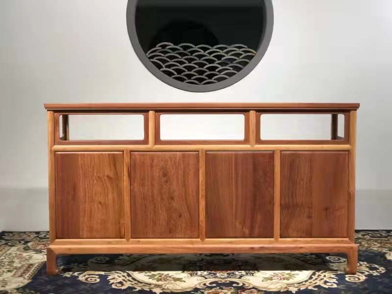 餐边柜类似传统万历柜形态的变体,下有几座,内翻直马蹄形式,上部亮格,三面做券口,既通透又起到矮栏杆的作用。