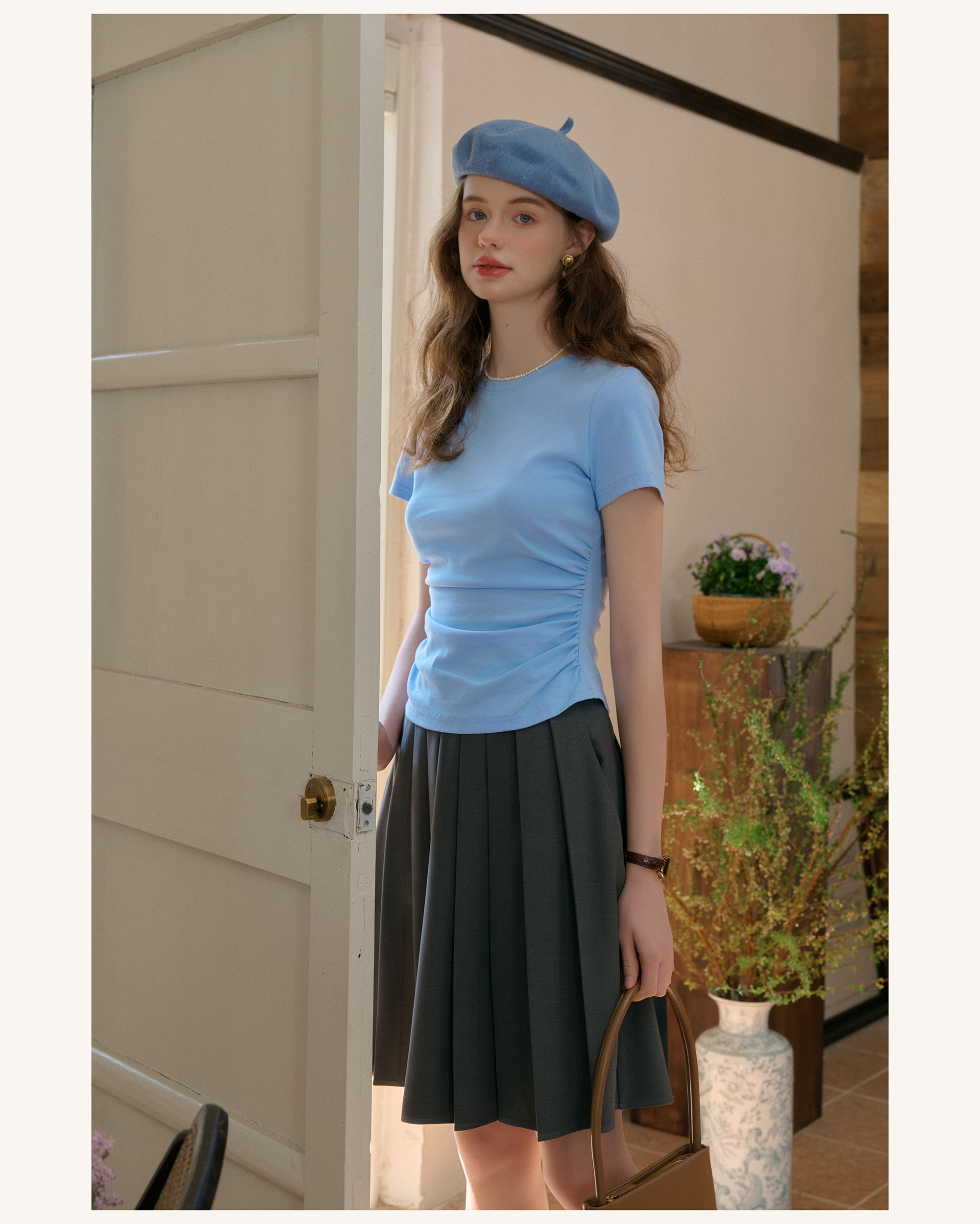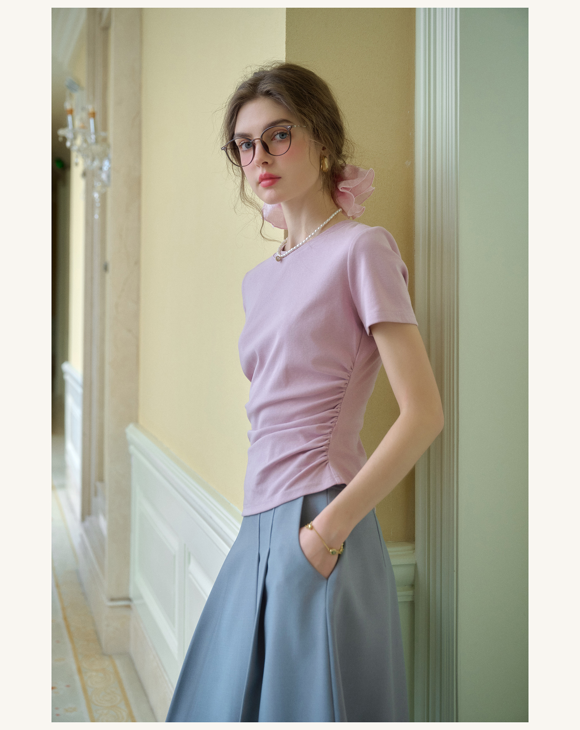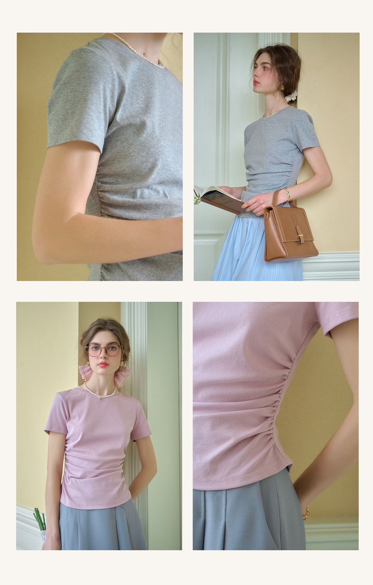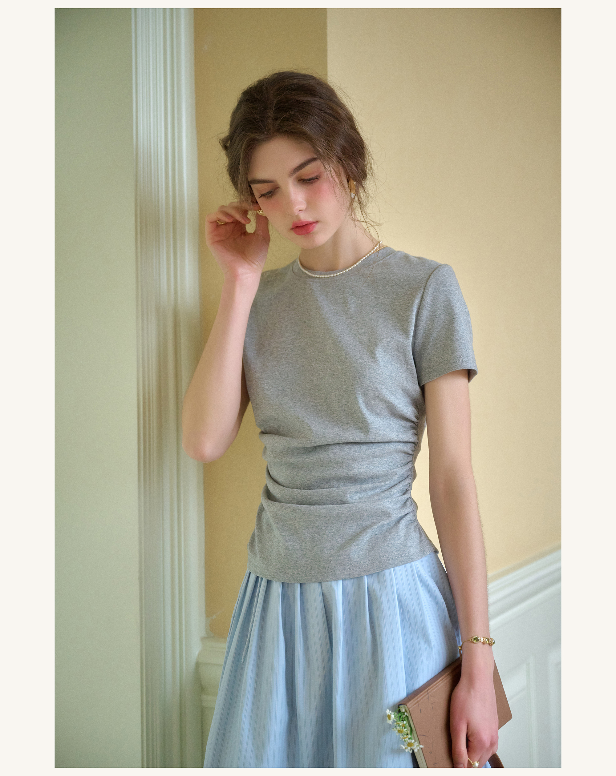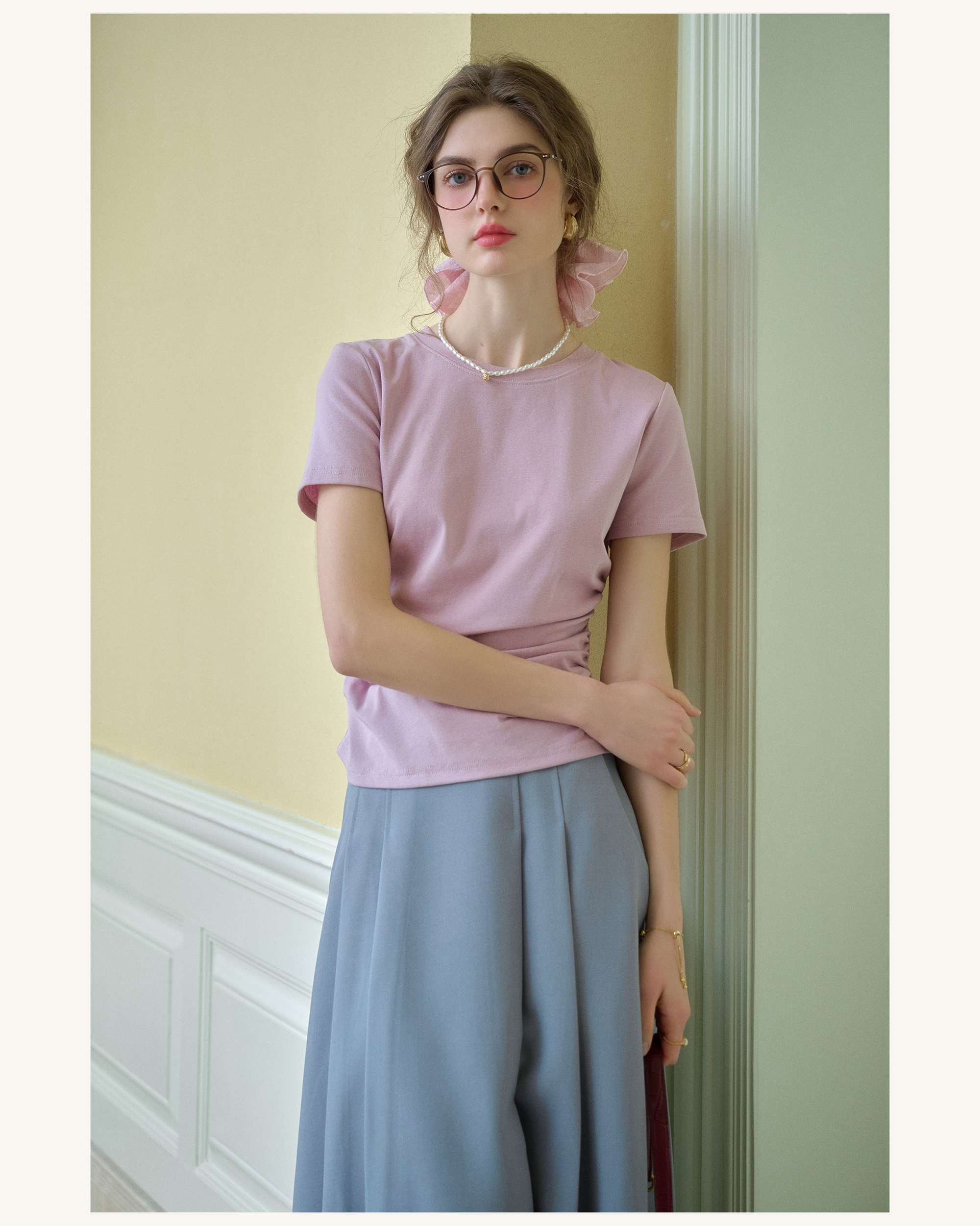 SimpleRetro可可布雷 3色腰部立体收褶短款T恤女圆领百搭显瘦上衣
