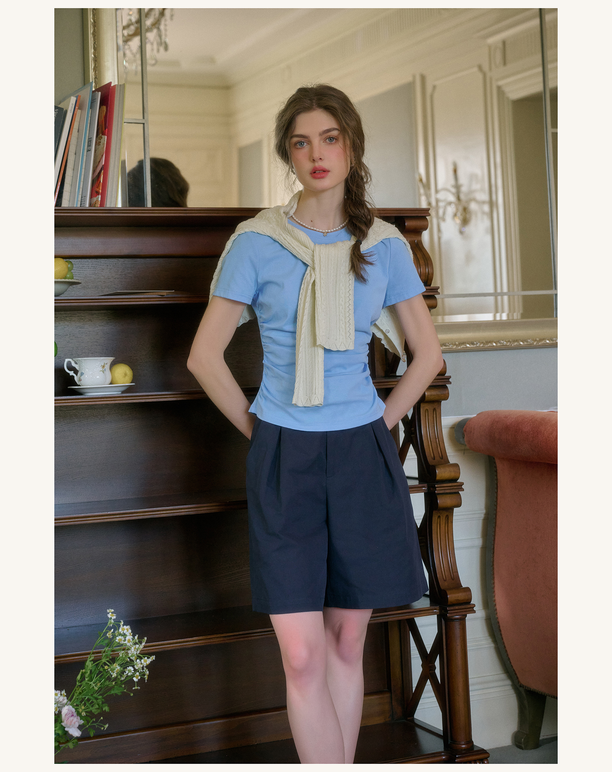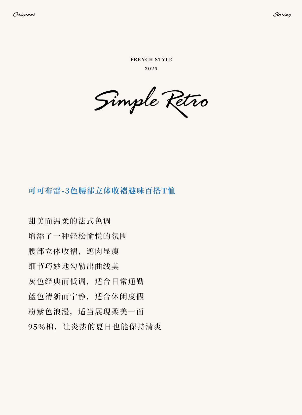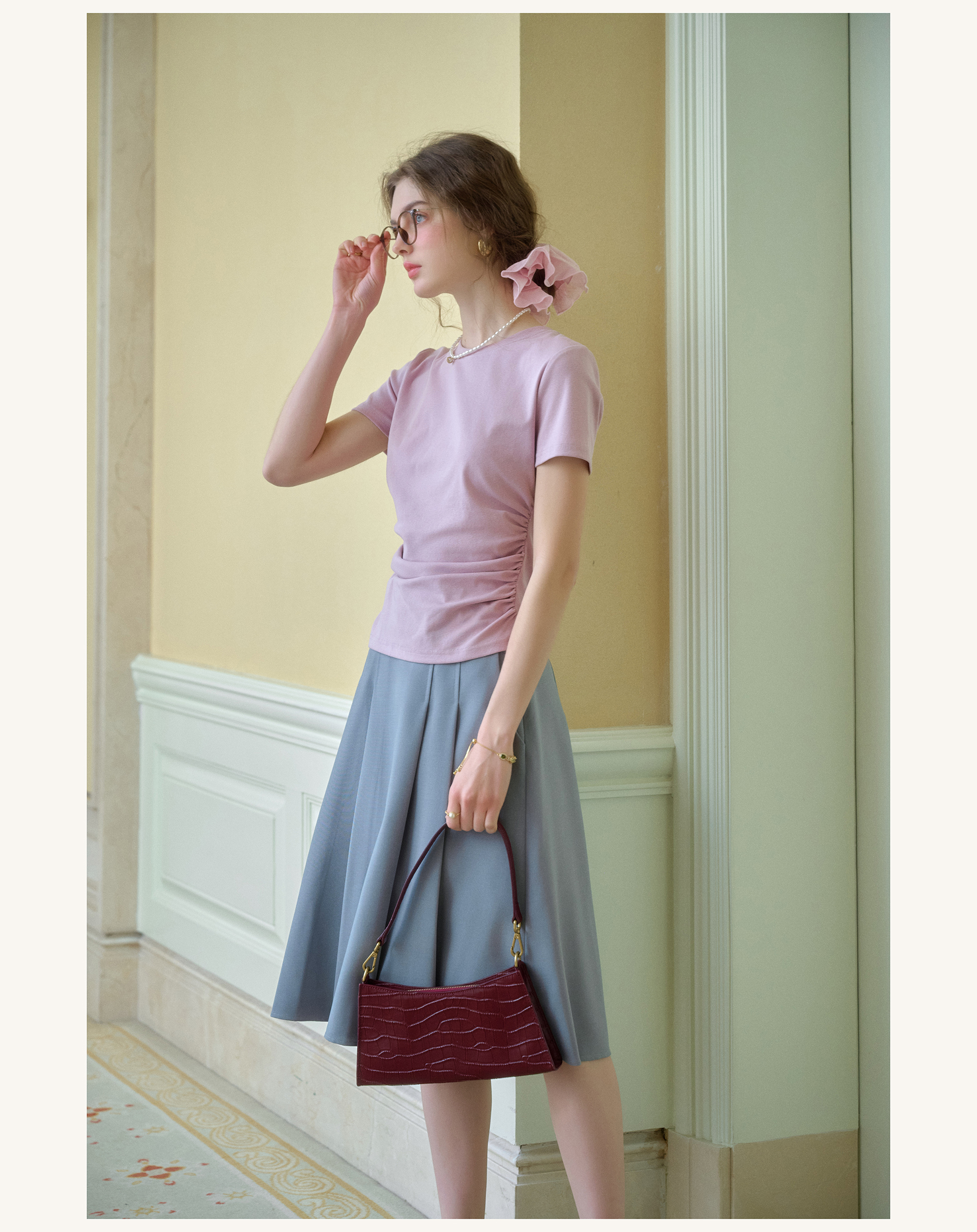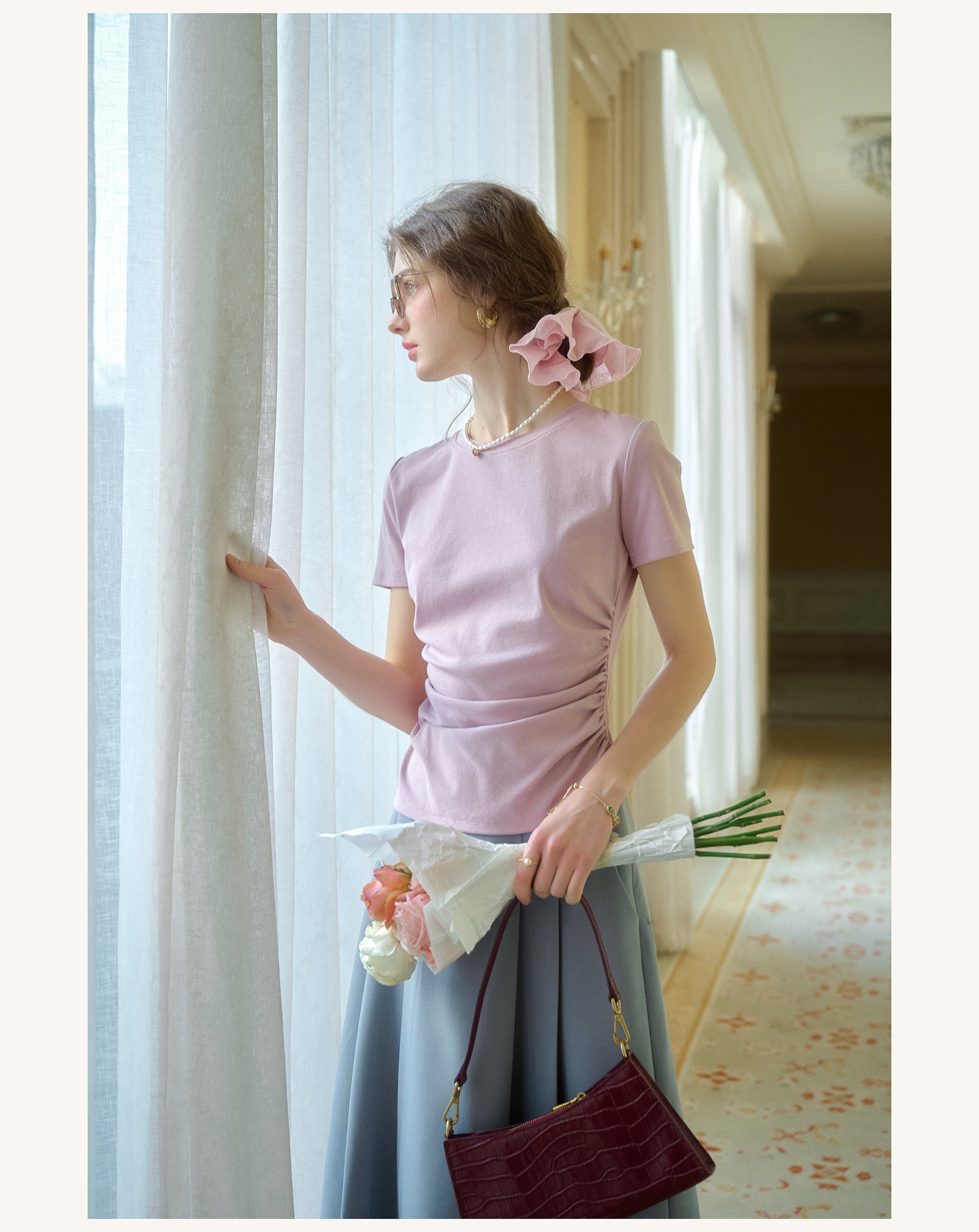 SimpleRetro可可布雷 3色腰部立体收褶短款T恤女圆领百搭显瘦上衣