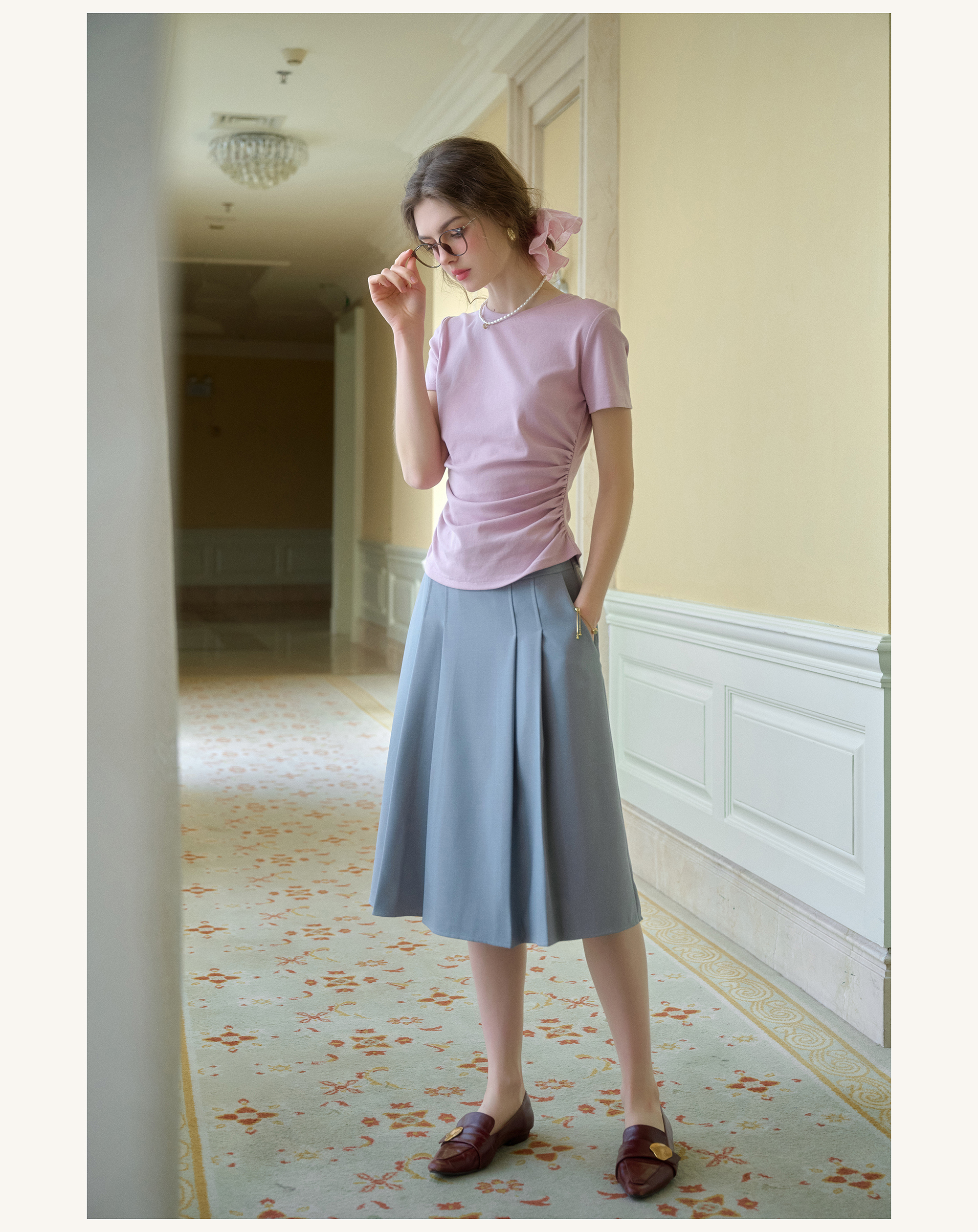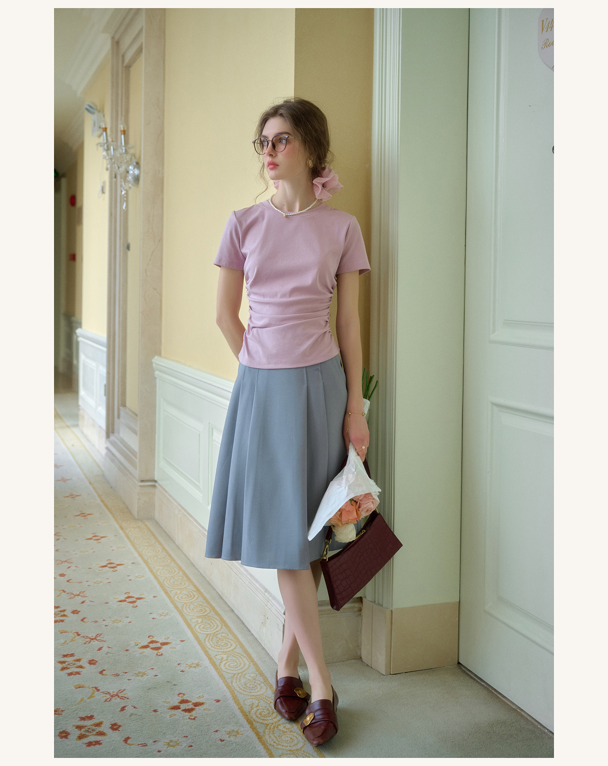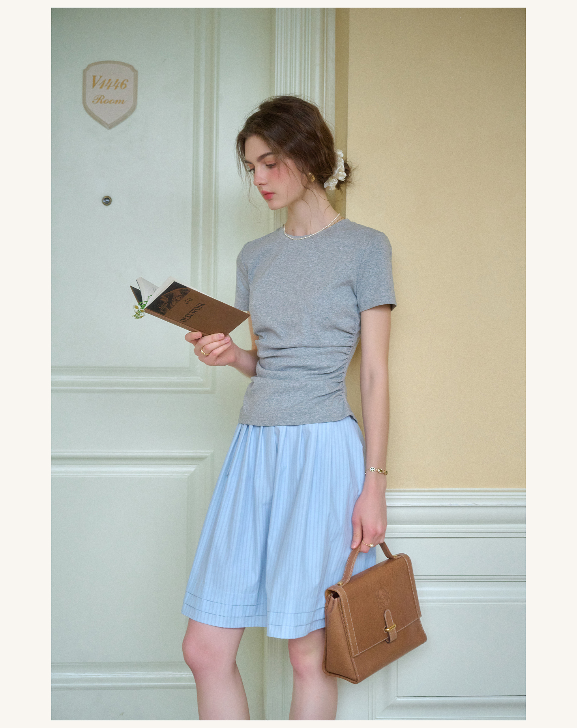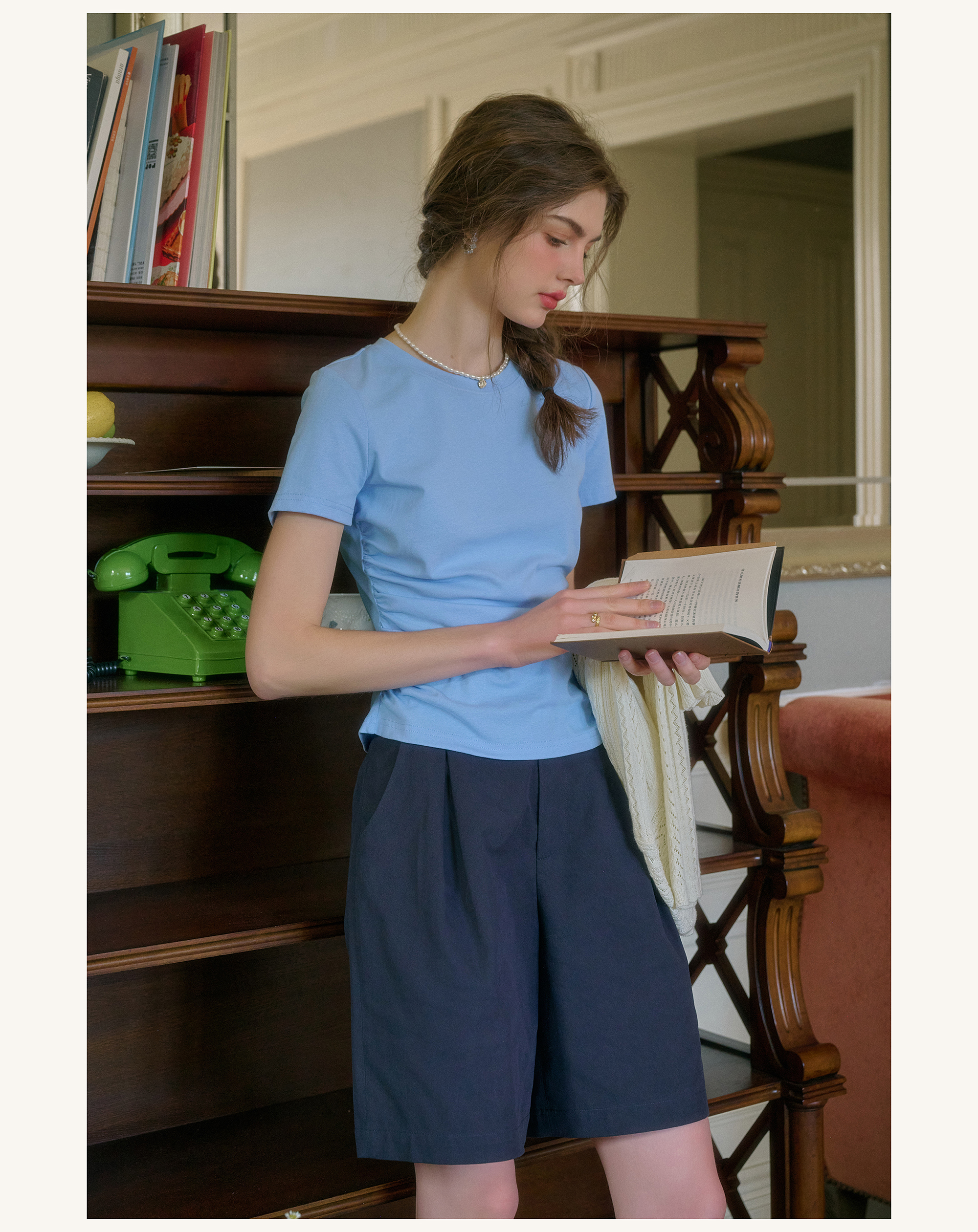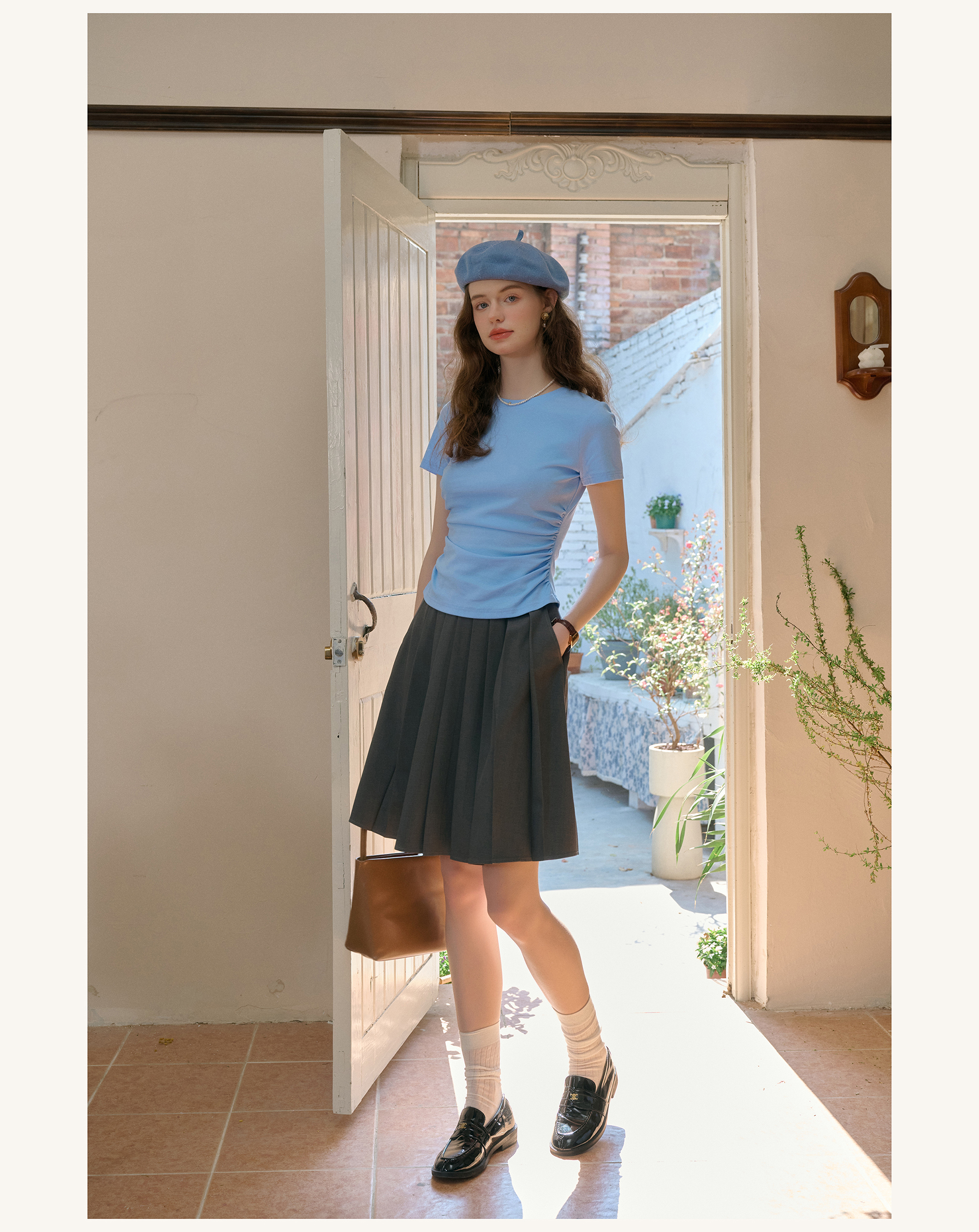 SimpleRetro可可布雷 3色腰部立体收褶短款T恤女圆领百搭显瘦上衣