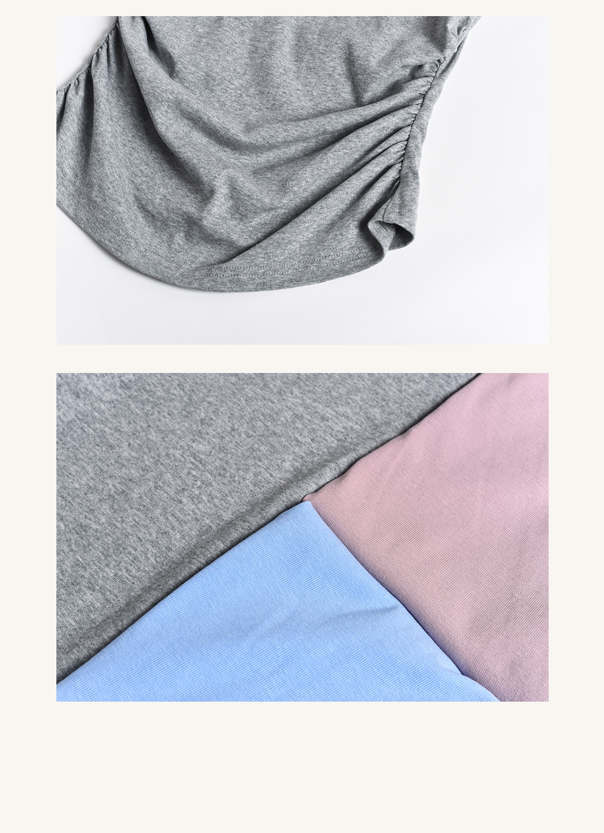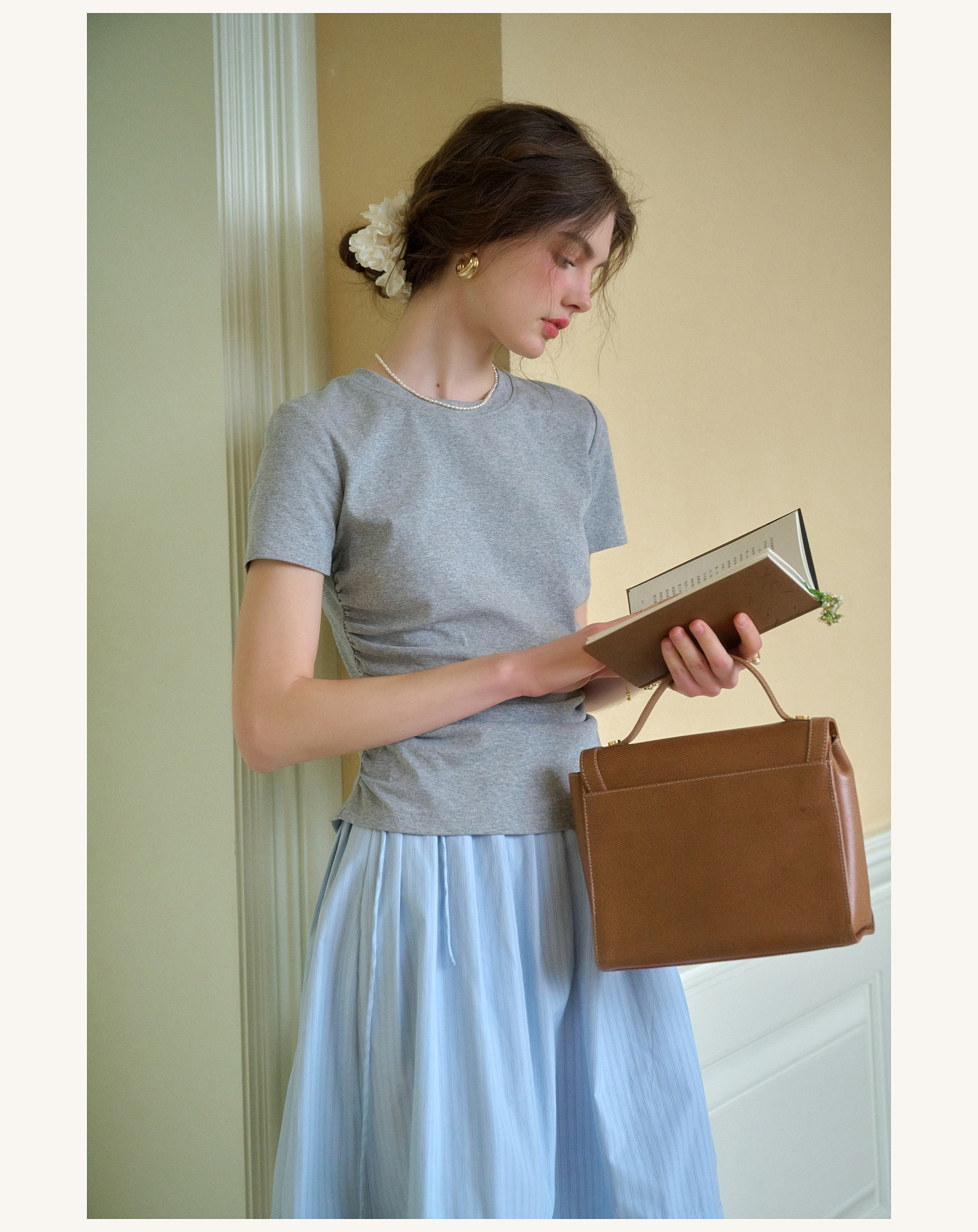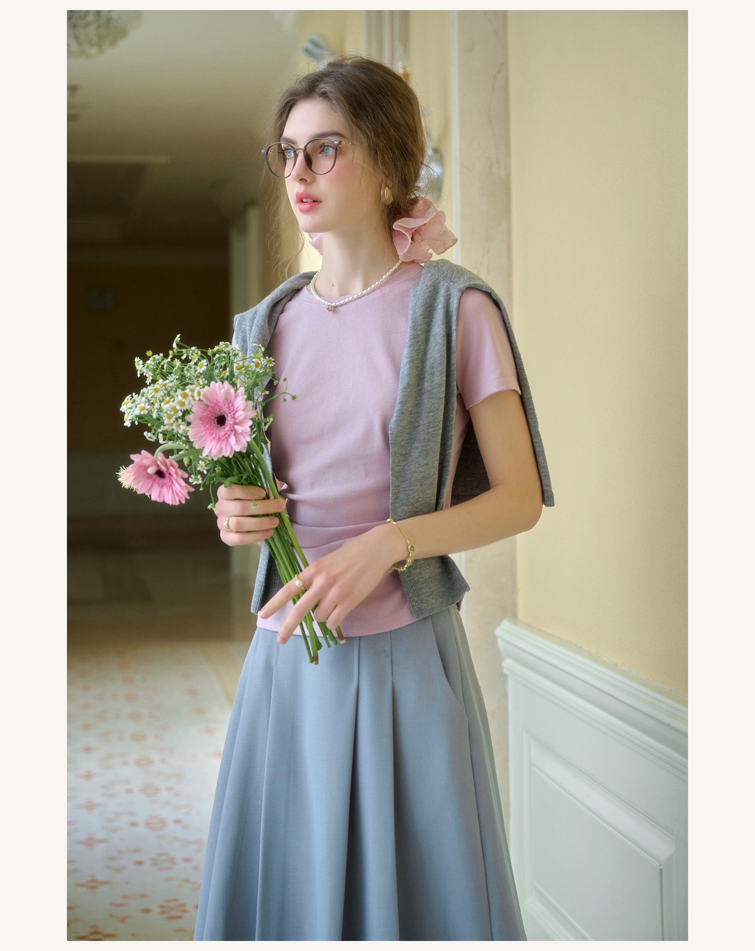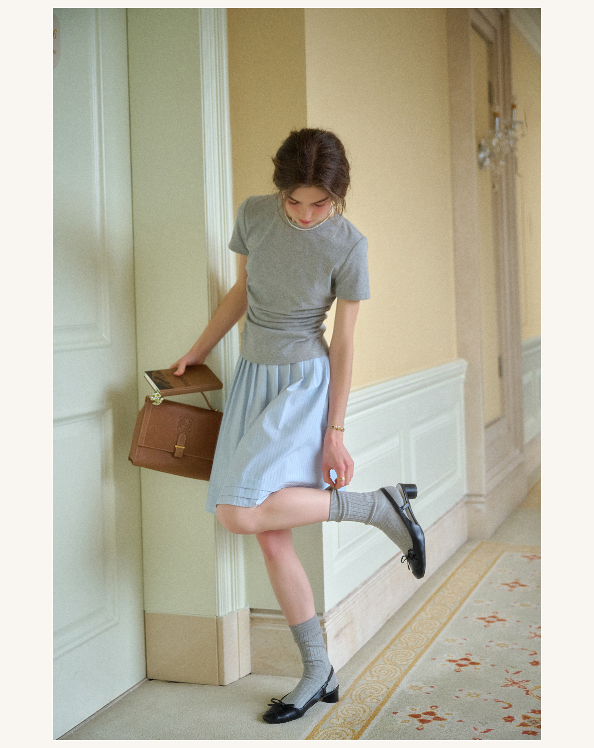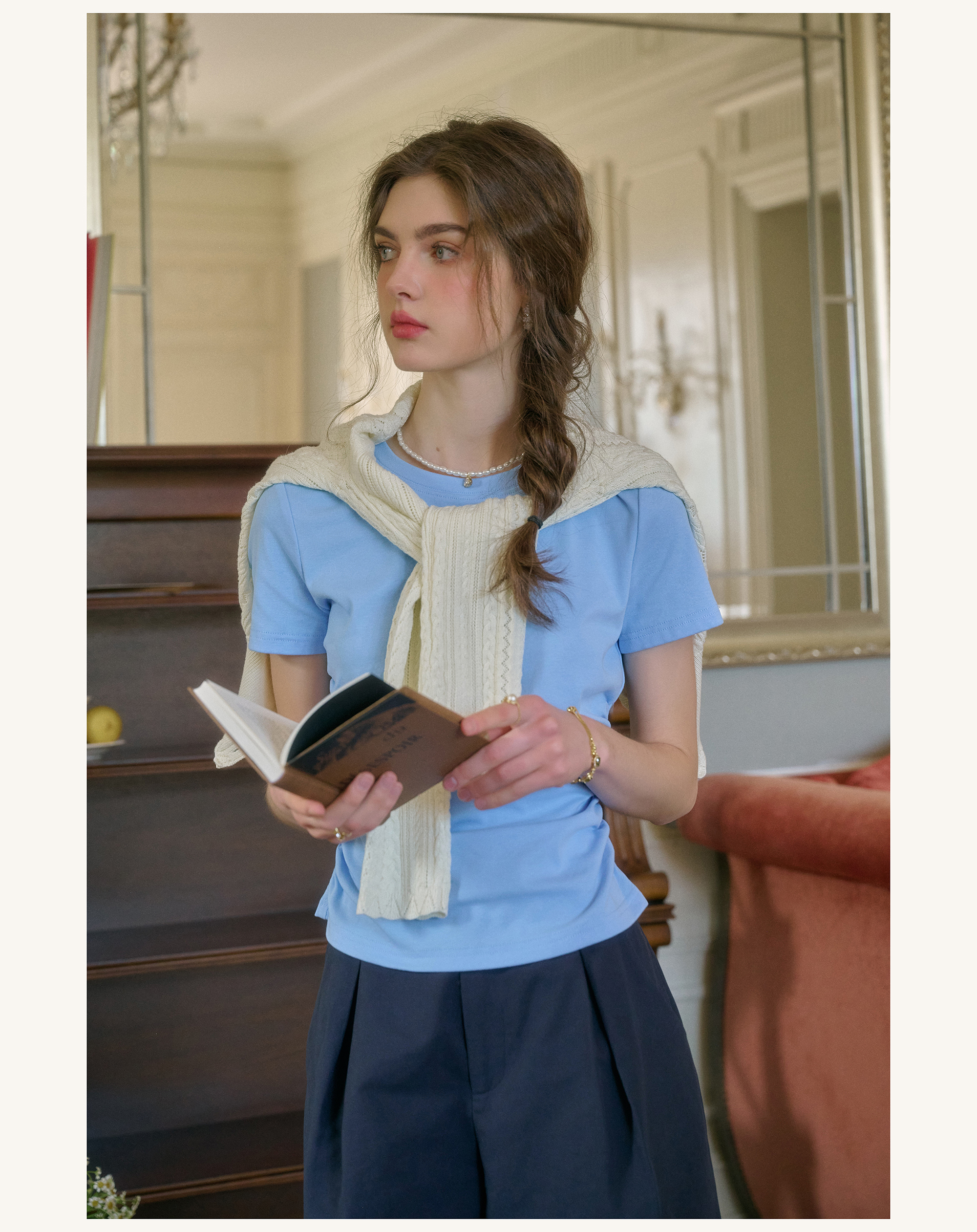 SimpleRetro可可布雷 3色腰部立体收褶短款T恤女圆领百搭显瘦上衣