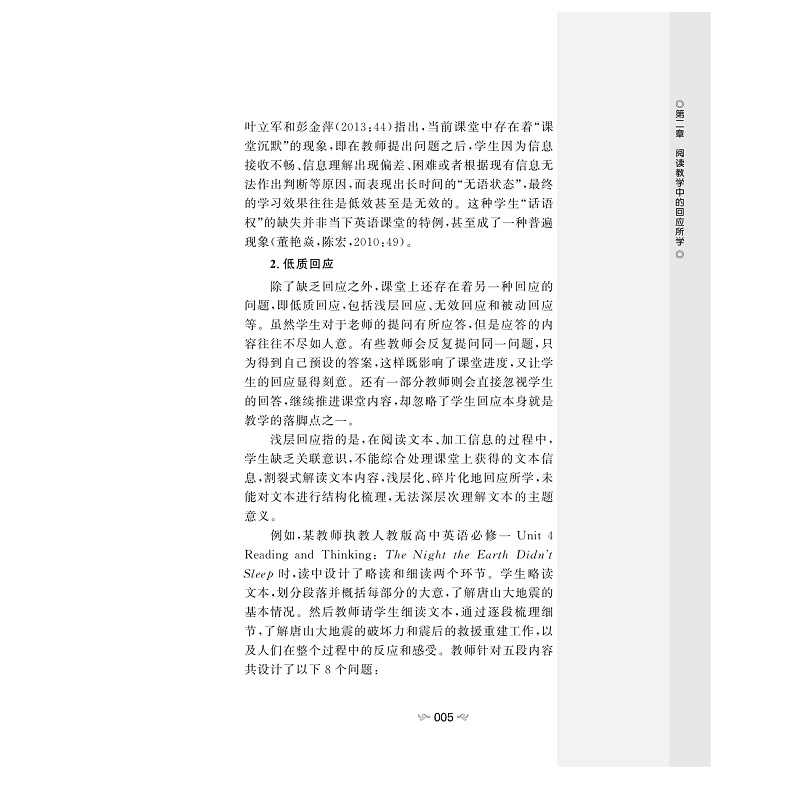 本书基于课例对目前阅读教学中“回应所学”的现状和成因做了简要的分析,并提出了主动学习视阈下的中学外语阅读教学中促进回应所学的关注点,即关联已知、动态交互和指向表达,以活动设计与课堂互动为抓手,从情境创设、交互设计、支架搭建、出口任务、意义协商、情感支持等角度入手,阐述促进回应所学的教学改进策略。书中将通过一个完整的课例,详尽地还原了本课题组几次磨课改进教学以促进学生更好地回应所学的研究过程。细致讨论课例的目标设定、教学环节和设计意图,并由学生回应所学的质量作为切入点反思教学过程,针对性地优化教学设计并总结这些改进措施的成效。最后将总结本次研究过程中的收获和尚存的困惑。