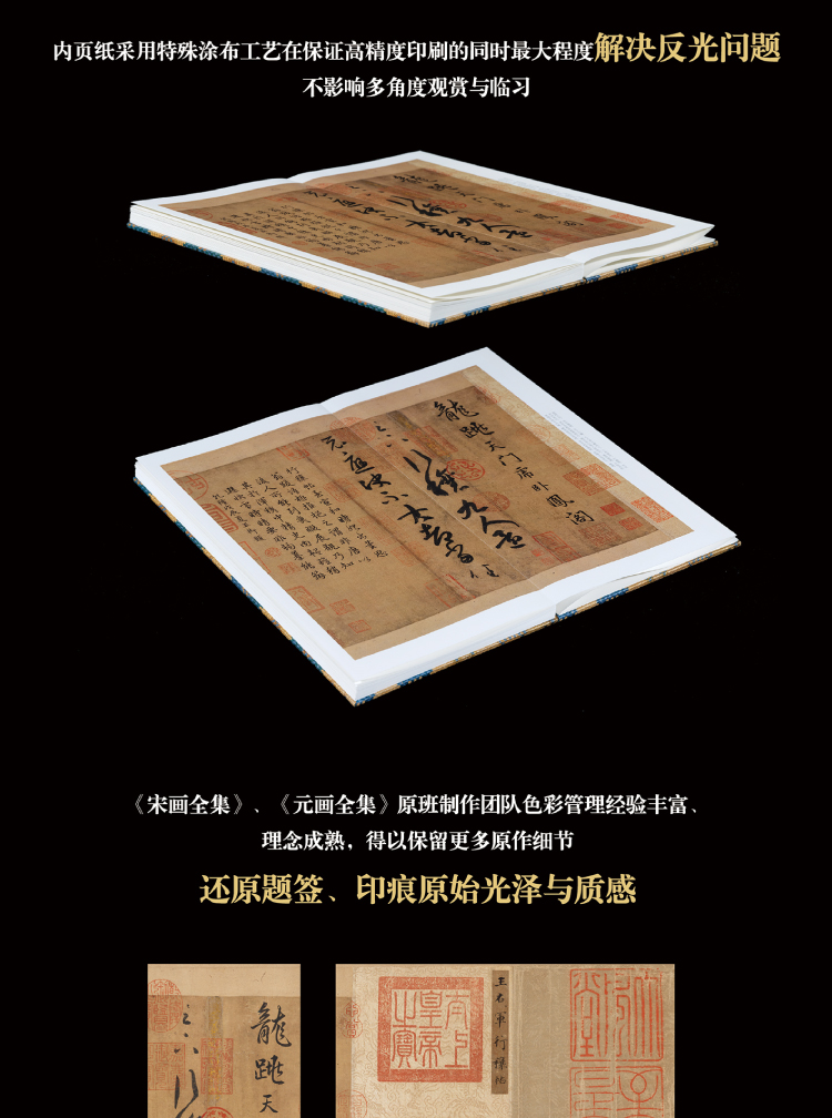 采用与《宋画全集》一致的10微米调频网印刷工艺,挂网数约为680线,是目前普通200线印刷的三倍有余。保证高精度印刷的同时定制纸张的申放达到惊人的50%,即成品1000册,印刷用纸1500册。