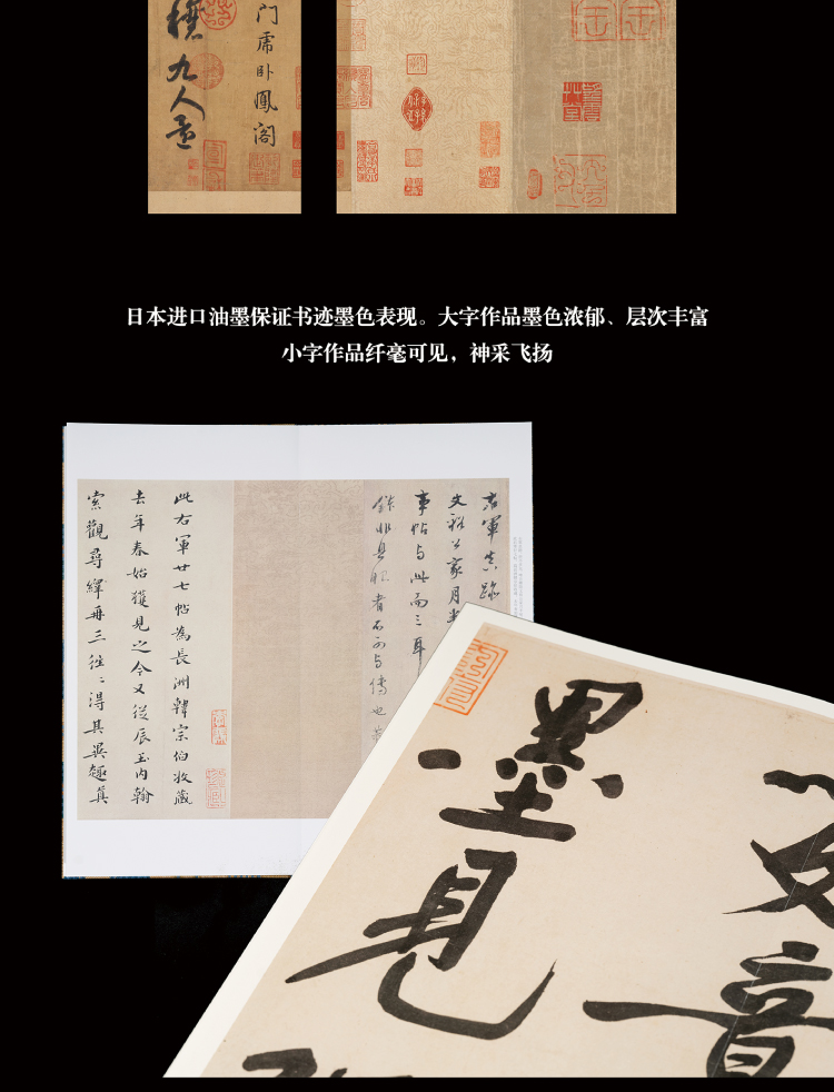 《中国法书》丛帖采用日本涌水高等级油墨,其价格是目前通用油墨的6倍左右,此油墨具有淡墨清亮能见厚度、浓墨通透不失层次的特点,是一款印制书法作品的极上等墨。