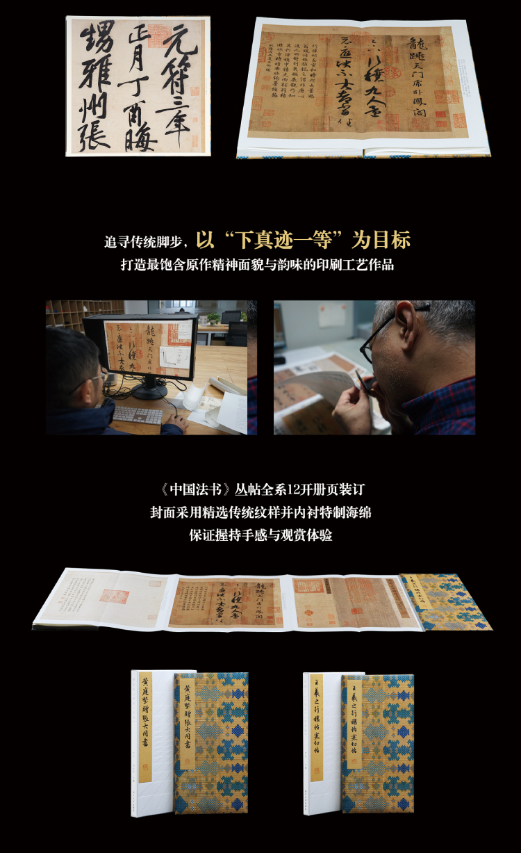 早在2世纪,中国就将书法作为一门艺术来欣赏,出于欣赏的需要,鉴赏家与收藏家们就对书法作品提出了一个复制的要求,因此,在4至5世纪,中国人已经能用手工制出旨在忠实于原作的精确复本(傅申——《海外书迹研究》)。如今由于岁月磨砺、流传散失等原因,许多原作或许早已不存于世,而后人根据原作精神尽力复刻、还原的摹本因其制作者精湛的手法以及对原作神韵的精准把握,即被认定为“下真迹一等”,也是对制作者技艺的zui大认可。浙江大学出版社《宋画全集》《元画全集》副主编、责任编辑李介一先生带领的团队历经五年不断打磨,总结出一套独特的的艺术图书制作经验,以“下真迹一等”为目标匠心打造《中国法书》丛帖,力求在目前的技术工艺上还原原作精神面貌与时代气息。