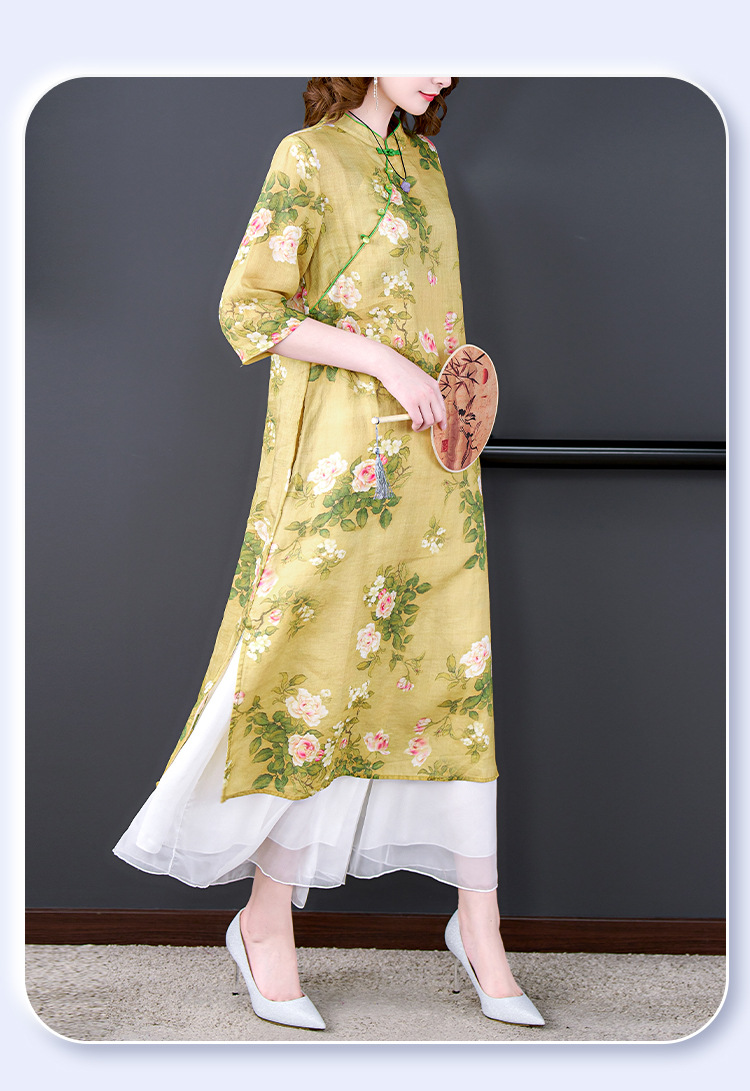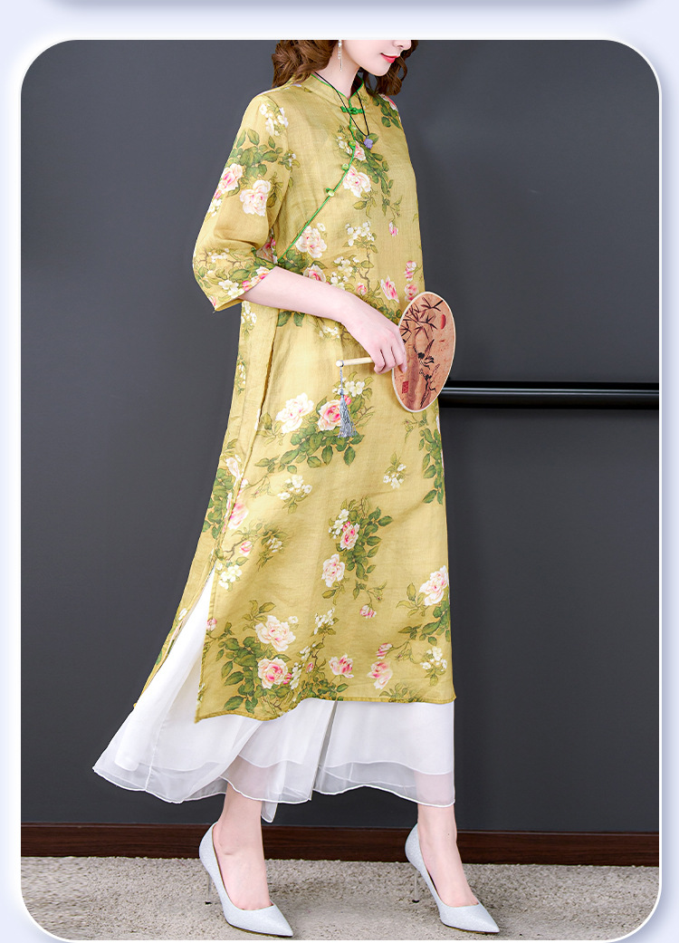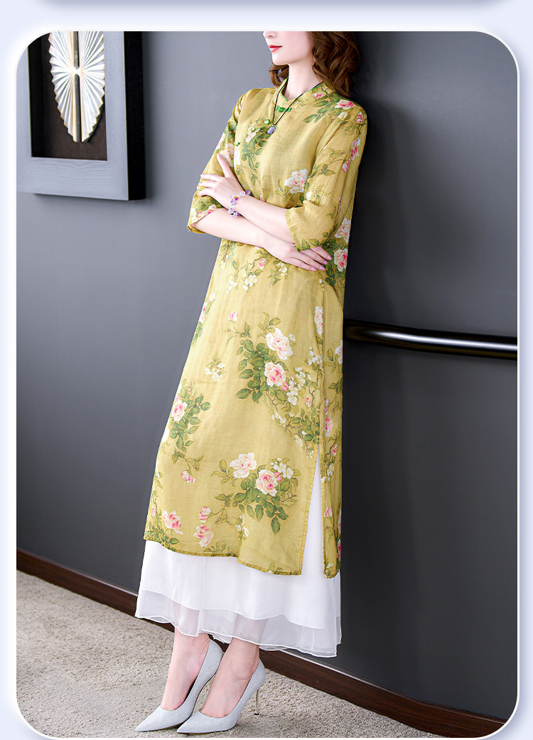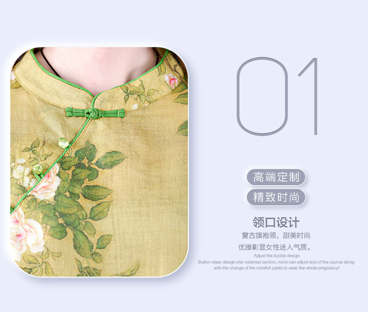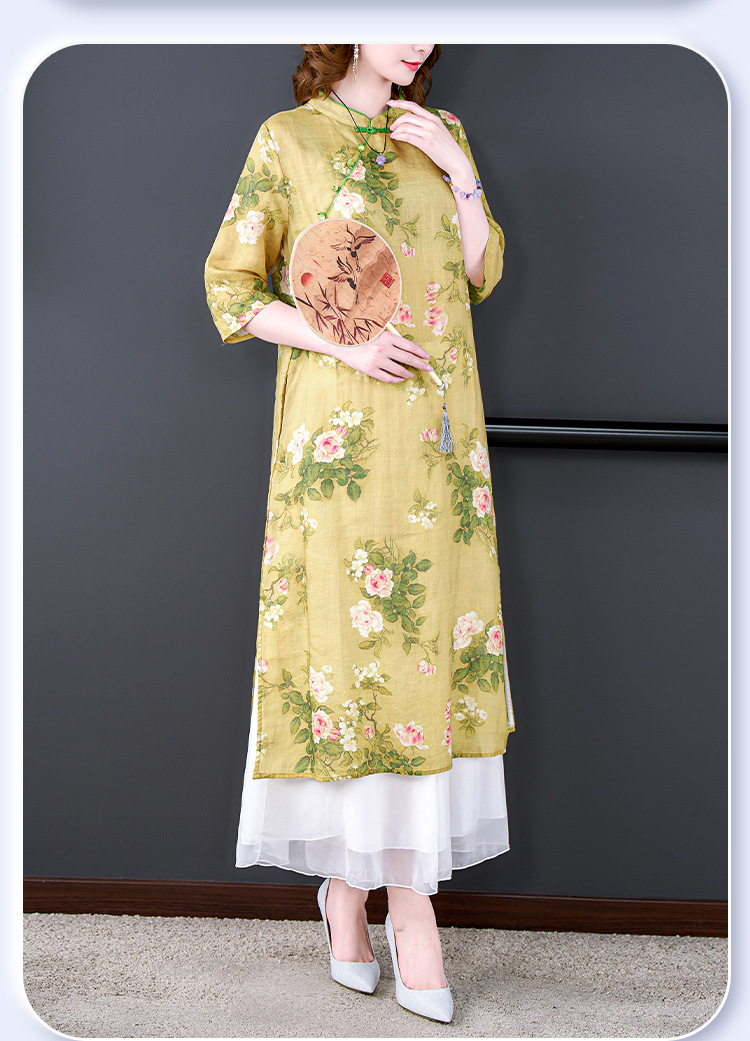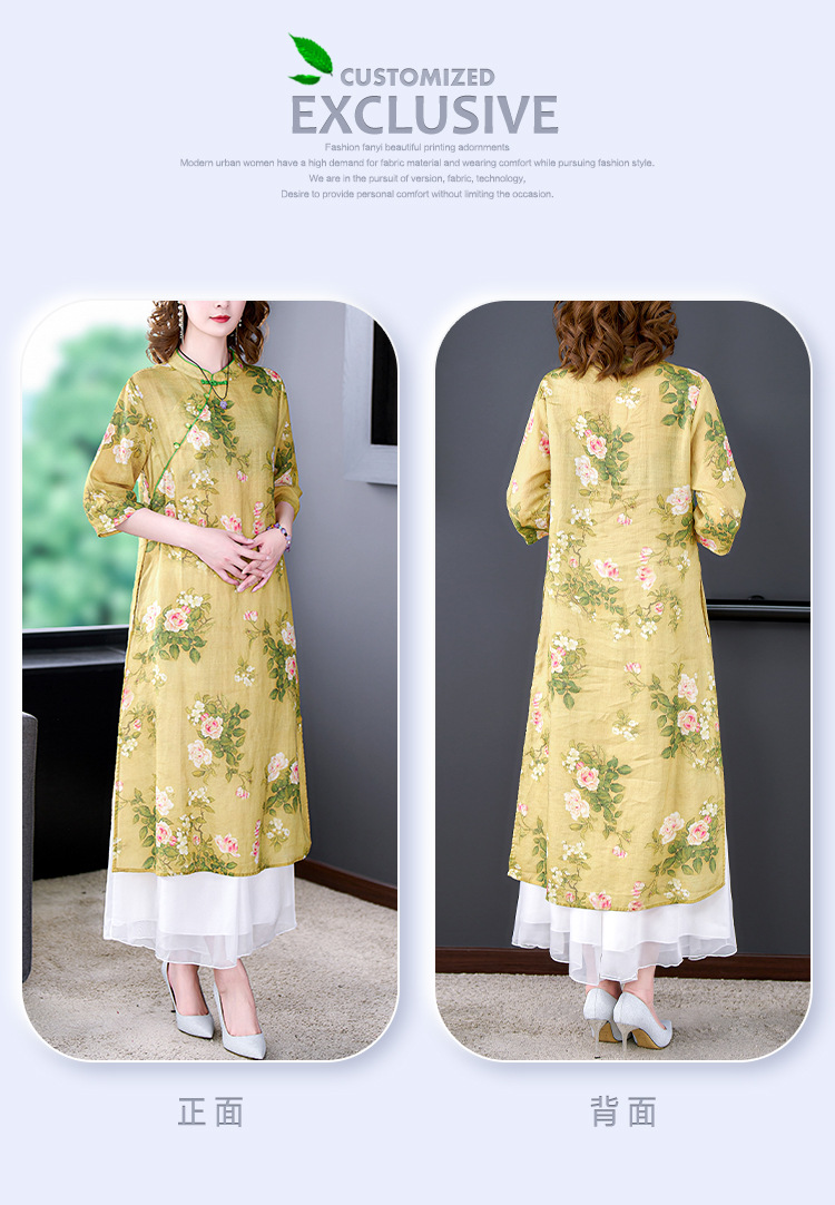 NYL-0023春夏新款时尚文艺立领印花拼接七分袖显瘦改良版旗袍连衣裙
