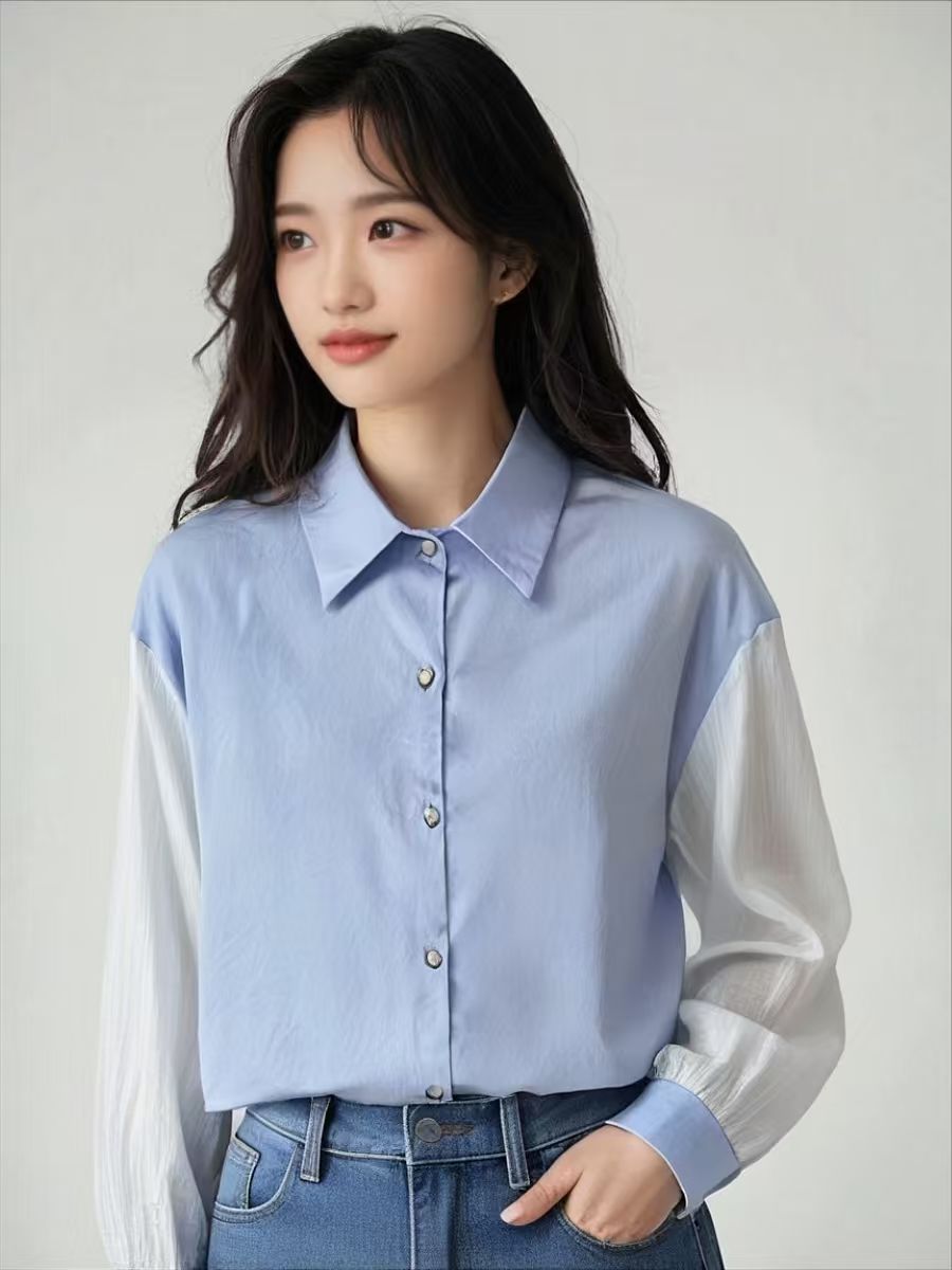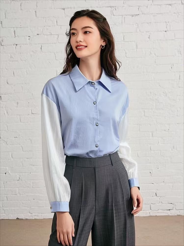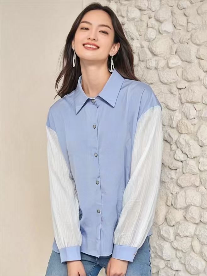 【新品推荐】瑟俪品牌-047A压褶面料拼色袖衬衫-喜出