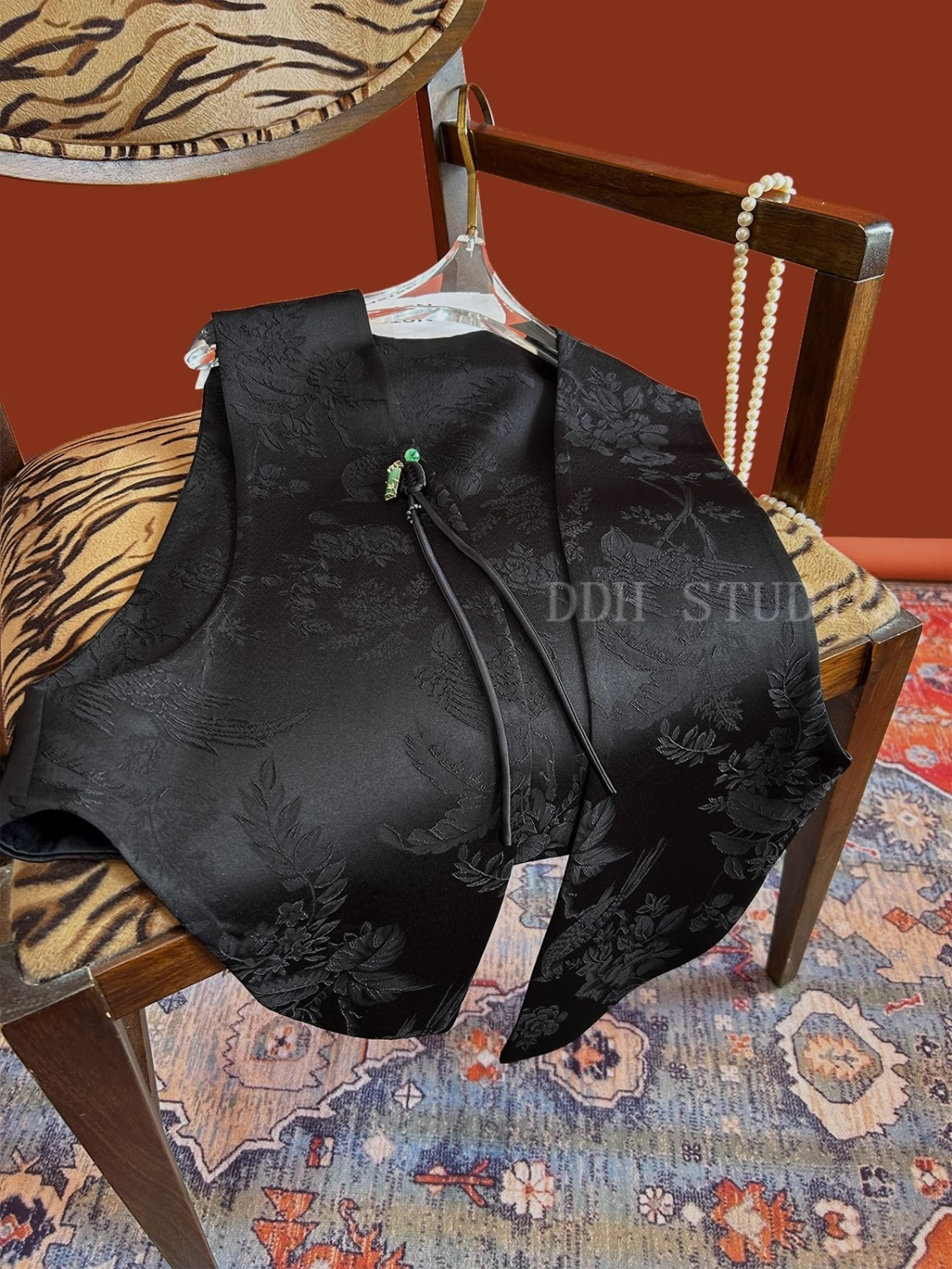 丁摩中式国风玉石流苏扣不规则马甲V领暗纹提花时尚马夹上衣女5ZF- 6813