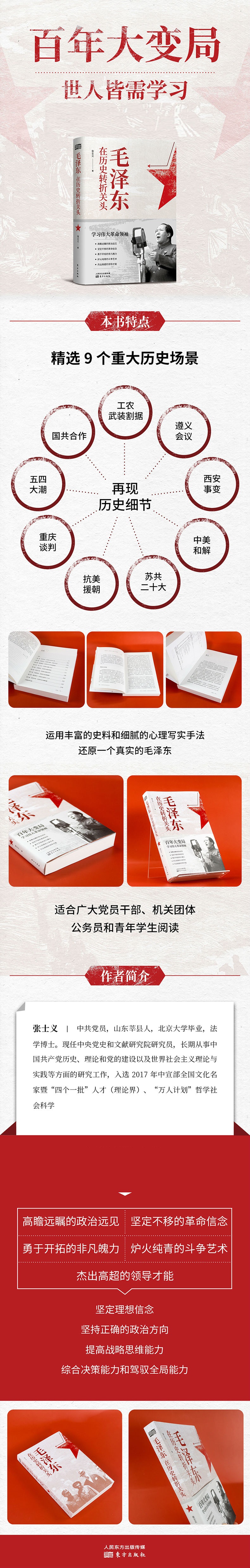 本书选择五四运动、国共合作、工农武装割据、遵义会议、西安事变、重庆谈判、抗美援朝等9个重大历史场景,运用丰富的史料和细腻的心理写实手法,对毛泽东同志在非常时期的心路历程进行深入探寻和剖析,再现历史细节,全面展现他高瞻远瞩的政治远见、坚定不移的革命信念、勇于开拓的非凡魄力、炉火纯青的斗争艺术、杰出高超的领导才能,有利于读者在百年大变局时代下提高政治素质,提升自身能力。