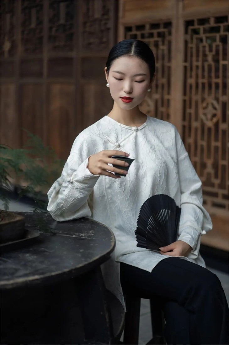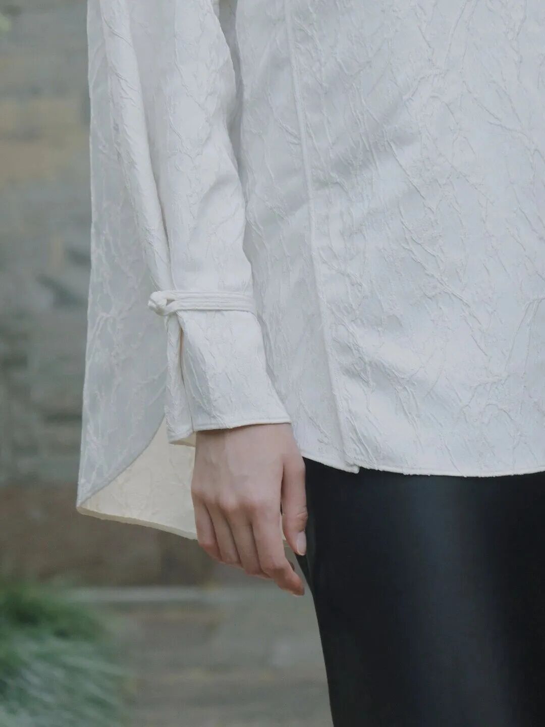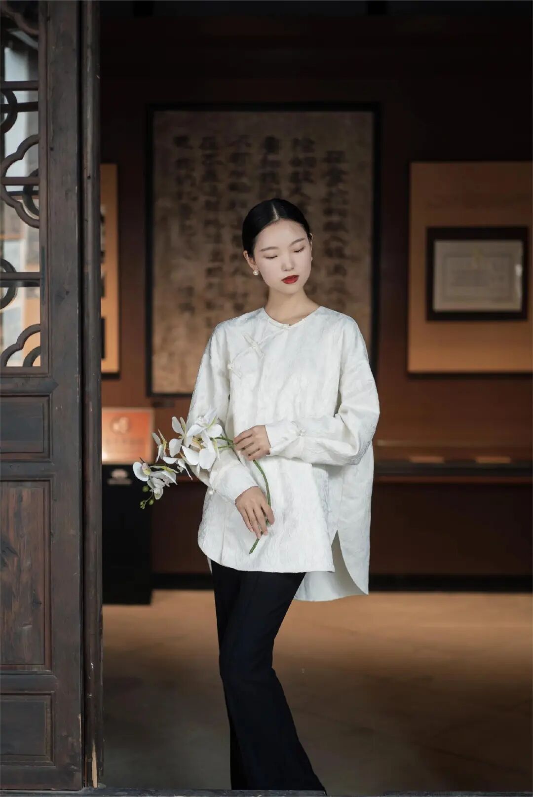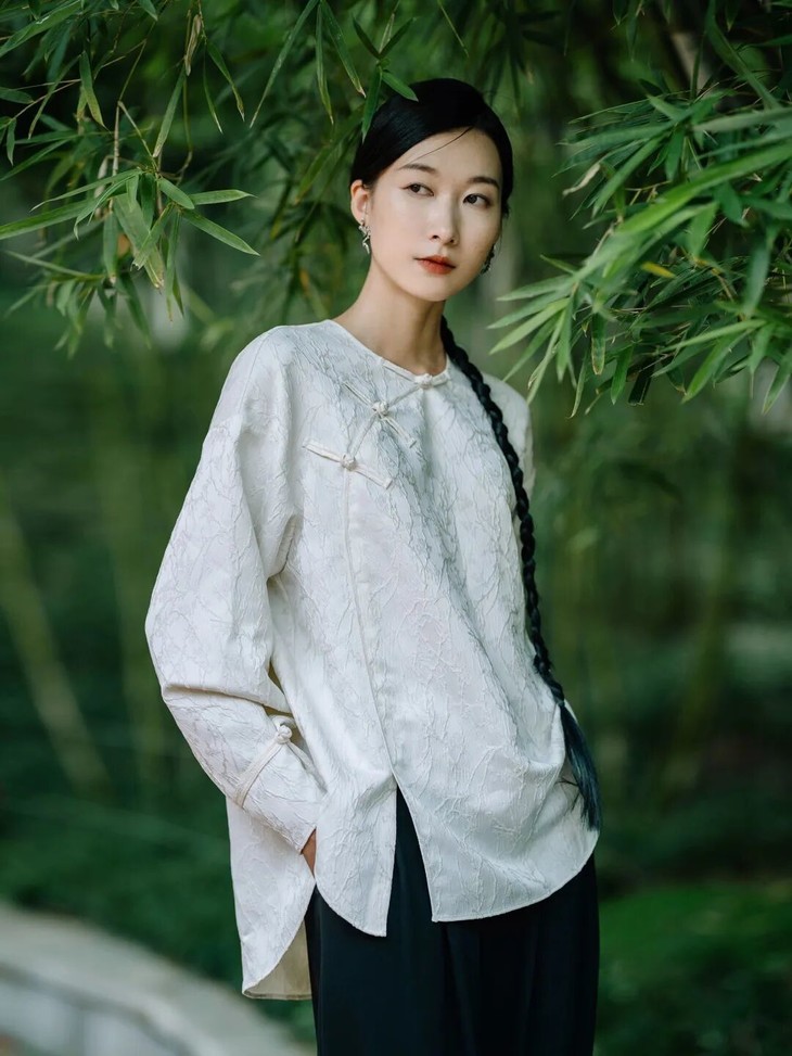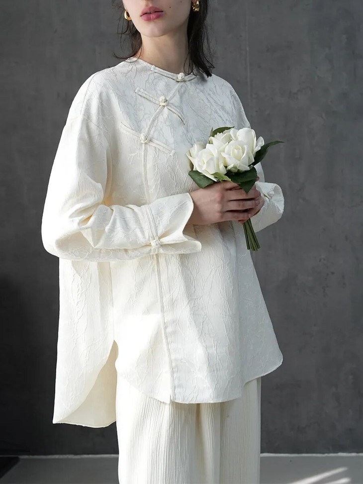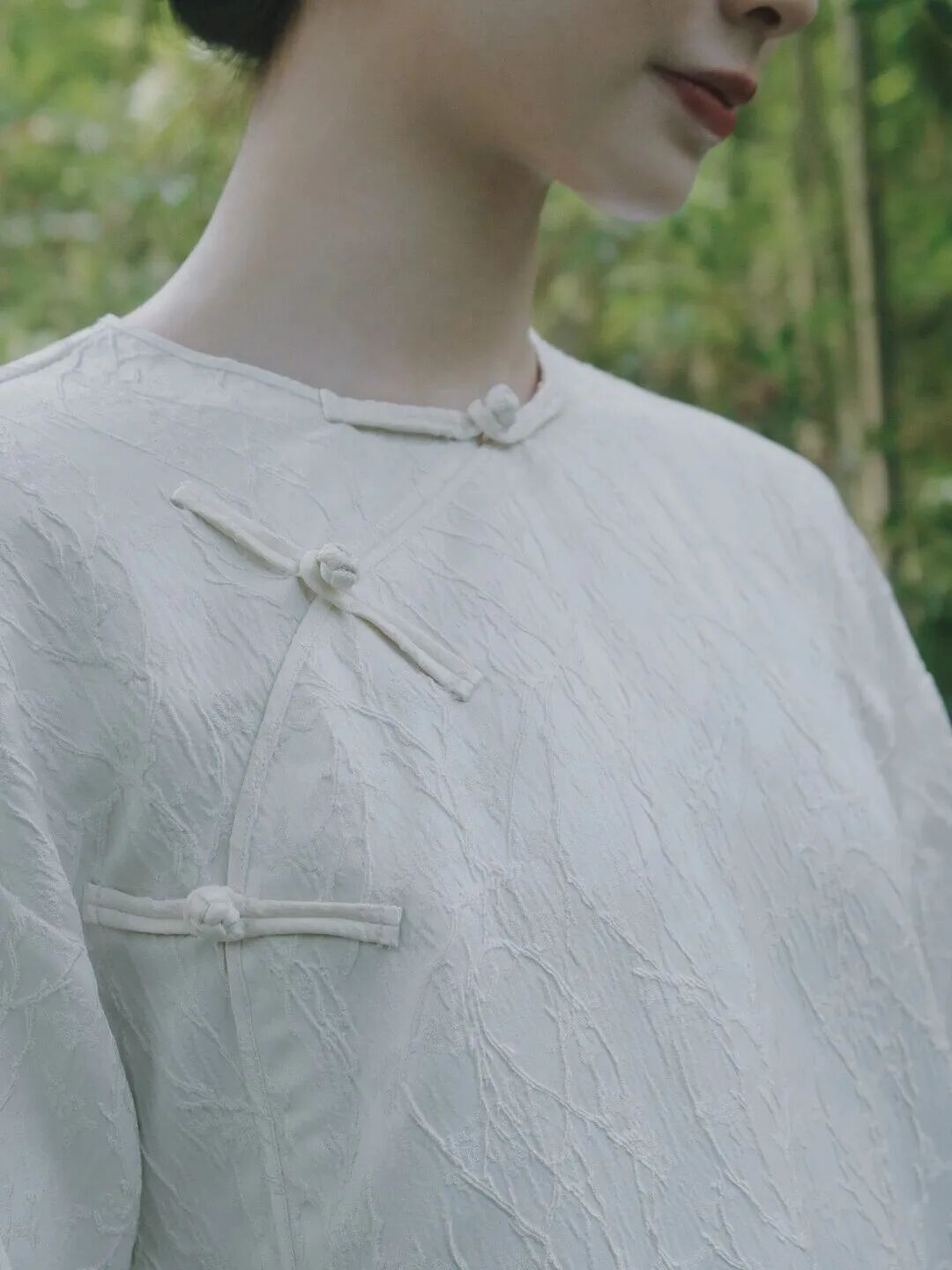 (3-5天发货)枯笔提花新中式衬衫,圆领中式右衽开襟,团云扣富有格调,重工浮雕提花,定制客供提花面料!