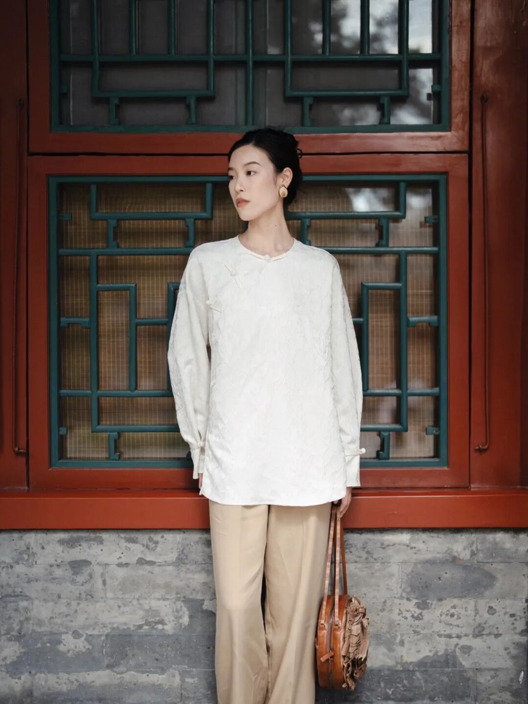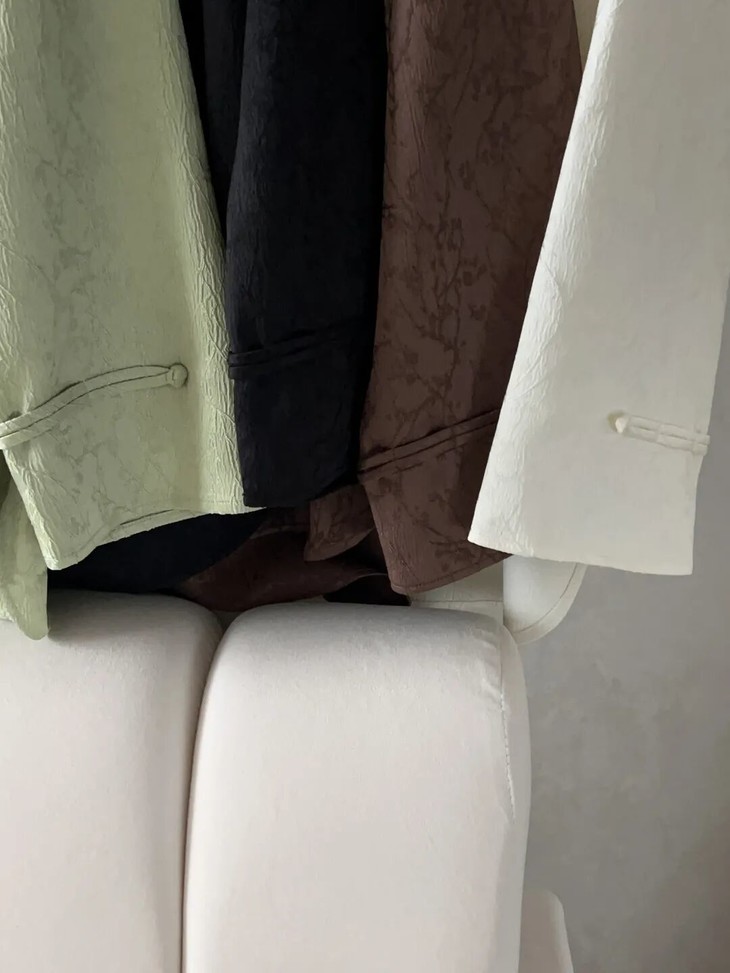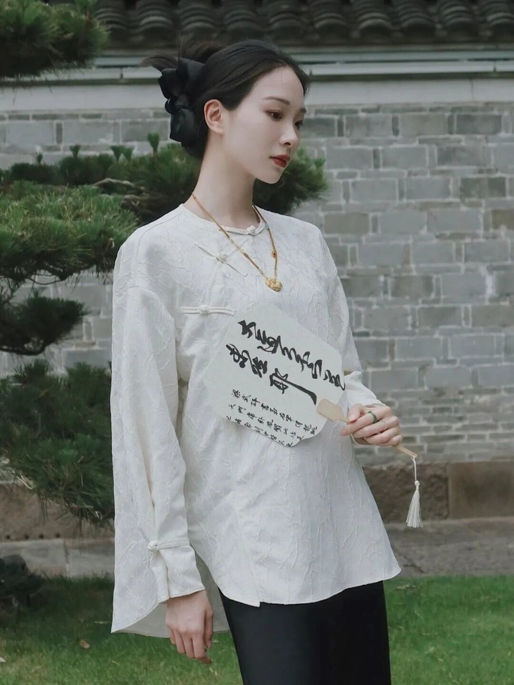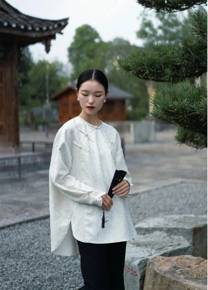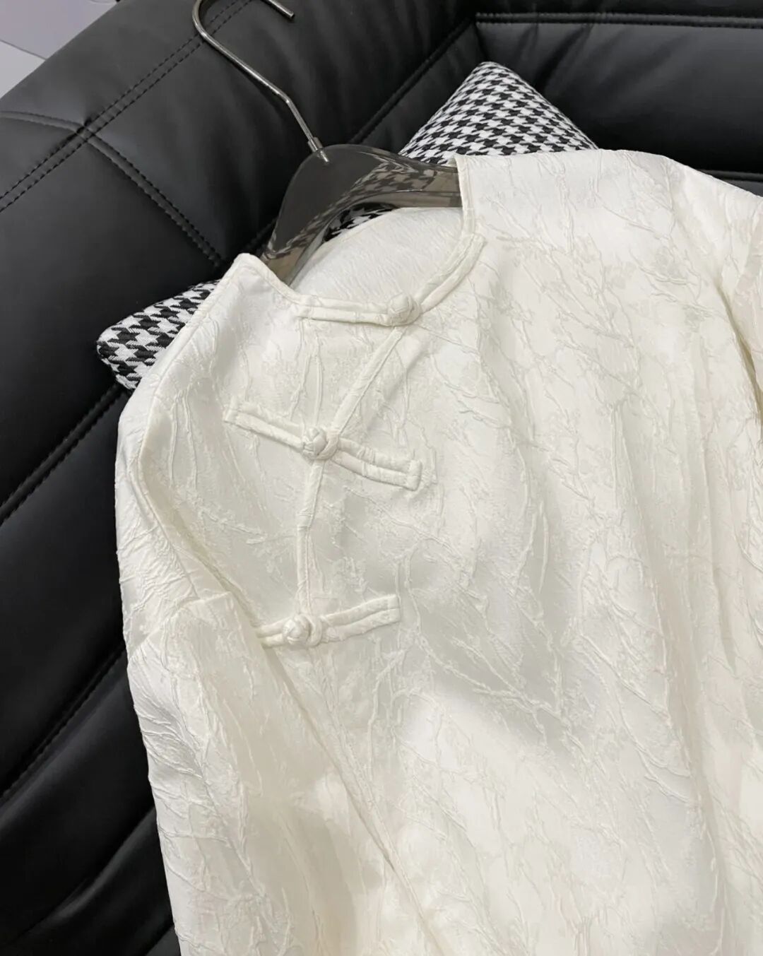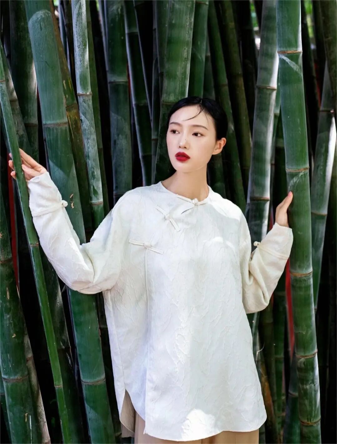 (3-5天发货)枯笔提花新中式衬衫,圆领中式右衽开襟,团云扣富有格调,重工浮雕提花,定制客供提花面料!