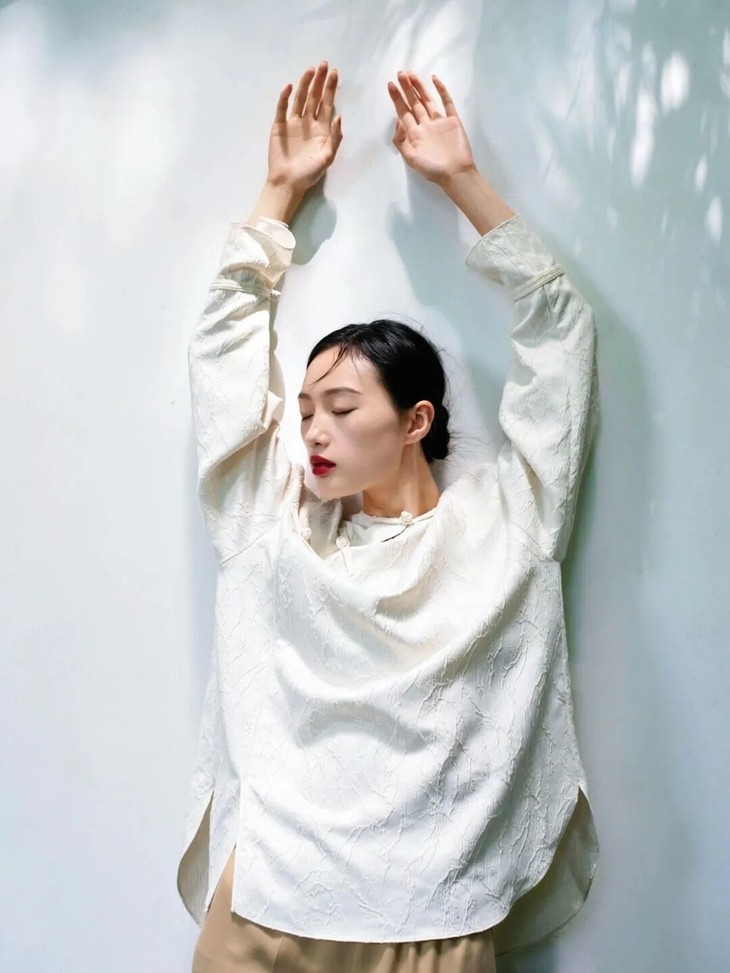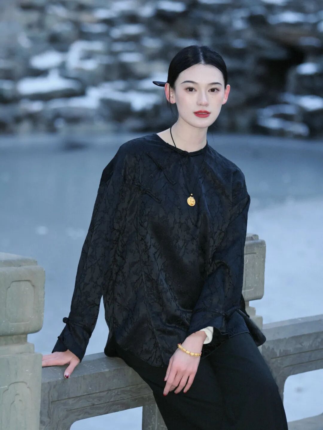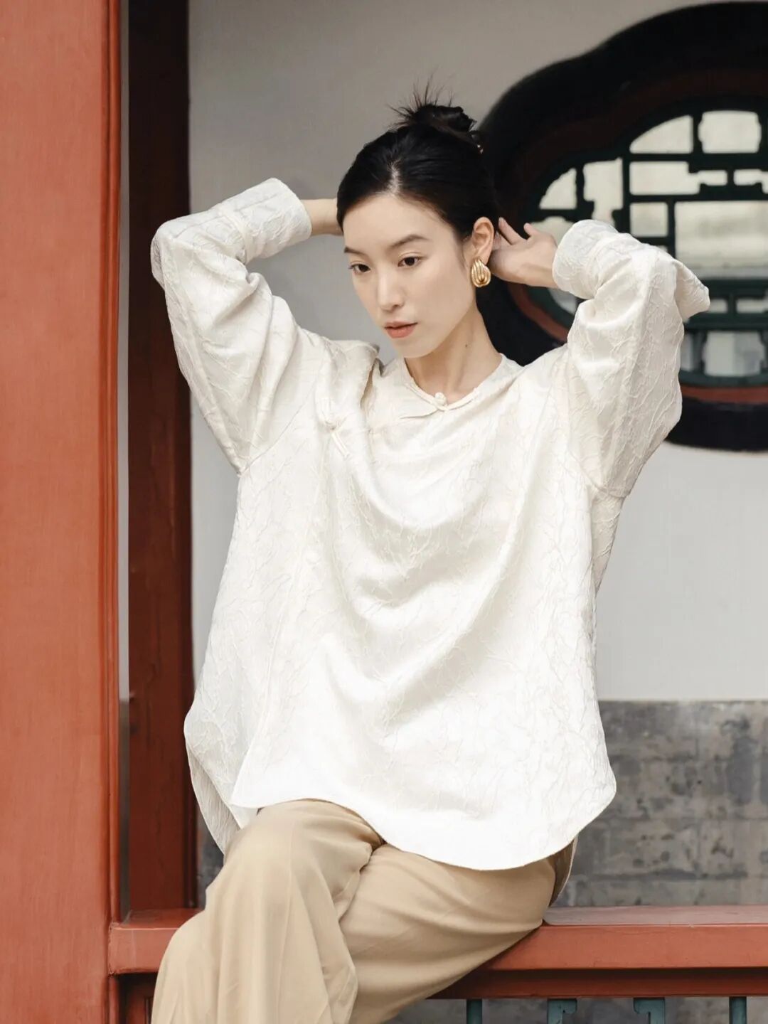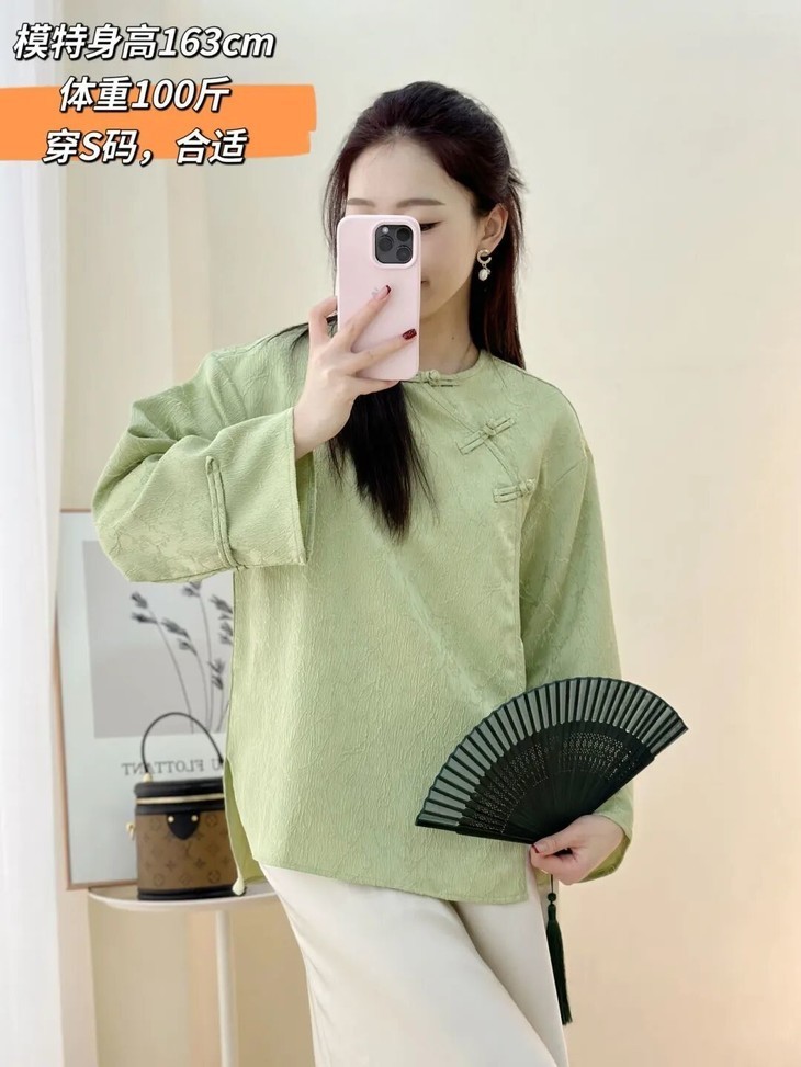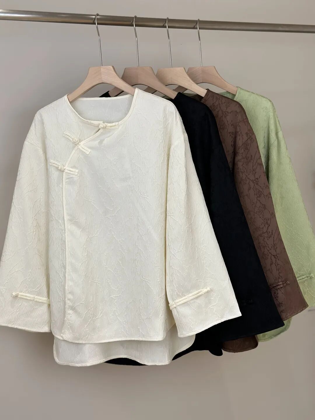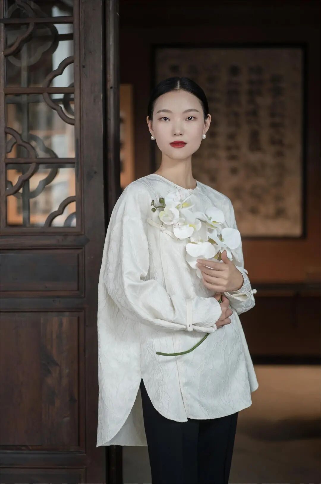 (3-5天发货)枯笔提花新中式衬衫,圆领中式右衽开襟,团云扣富有格调,重工浮雕提花,定制客供提花面料!