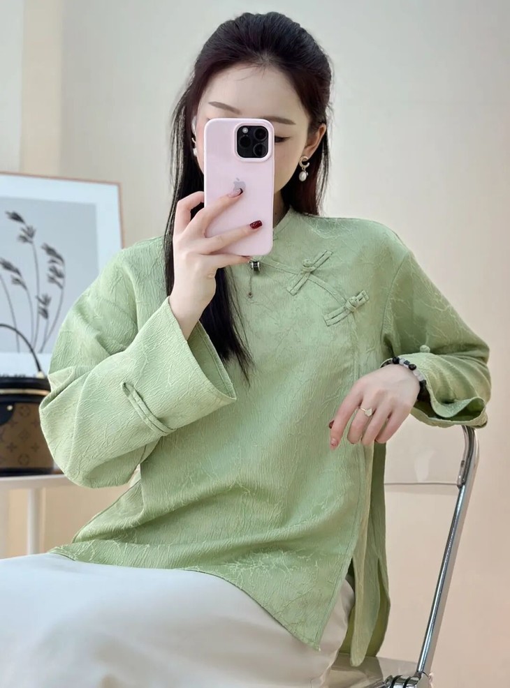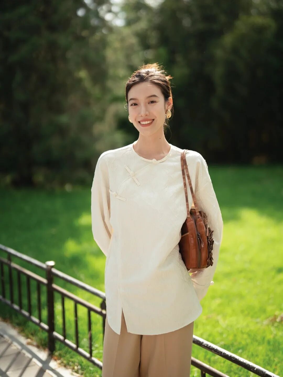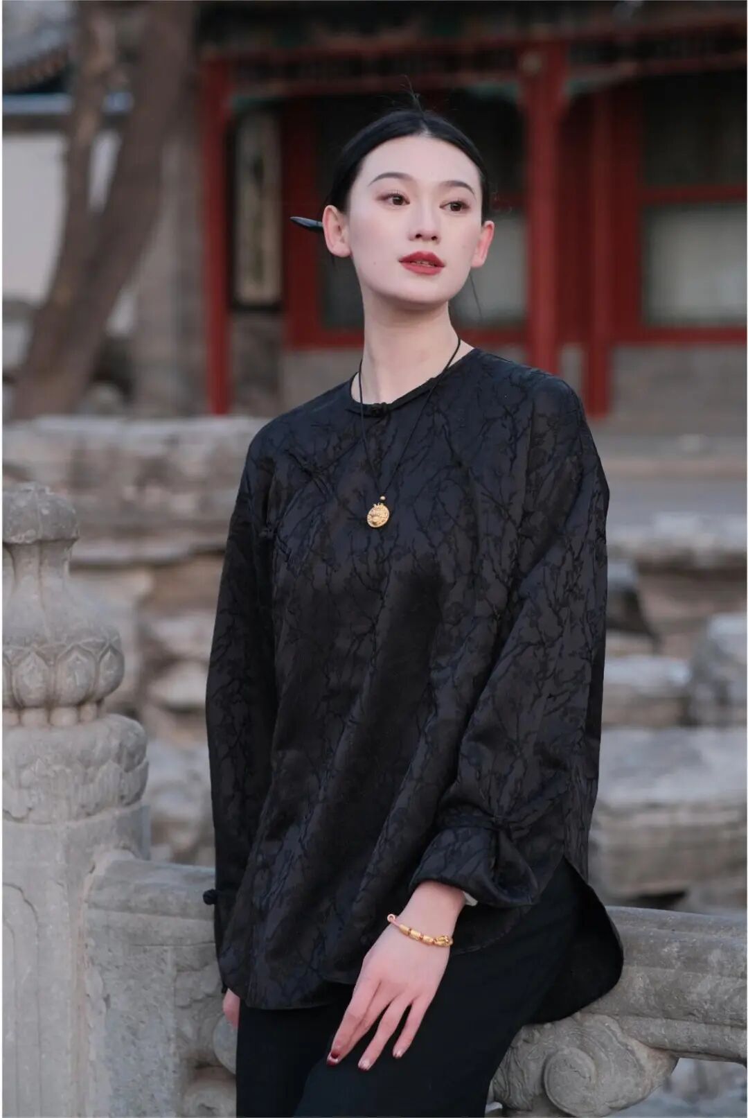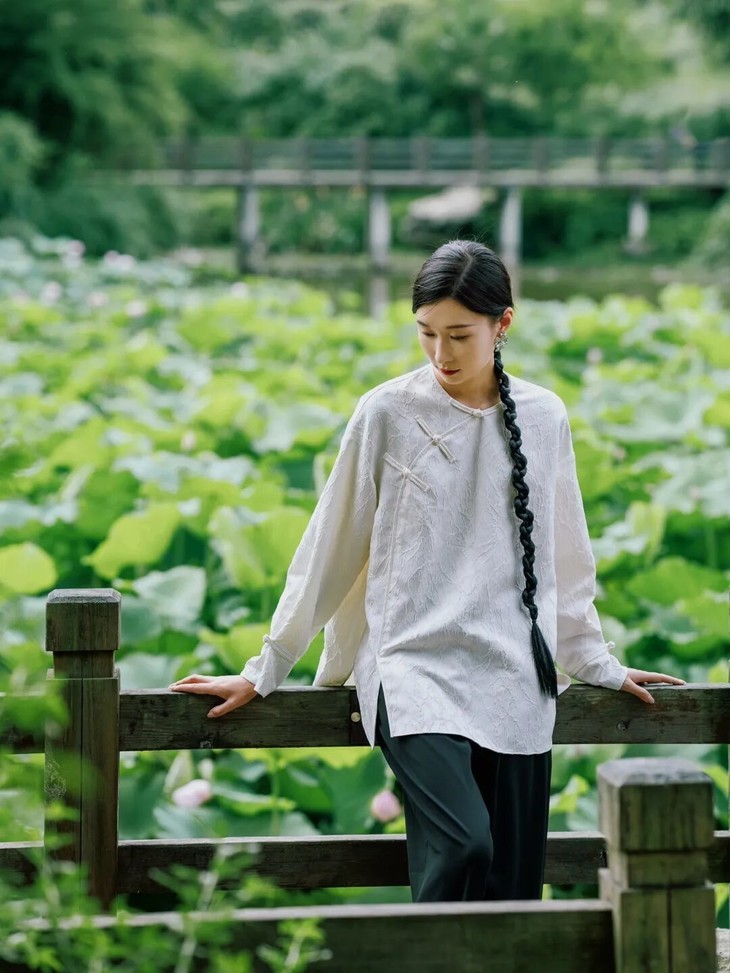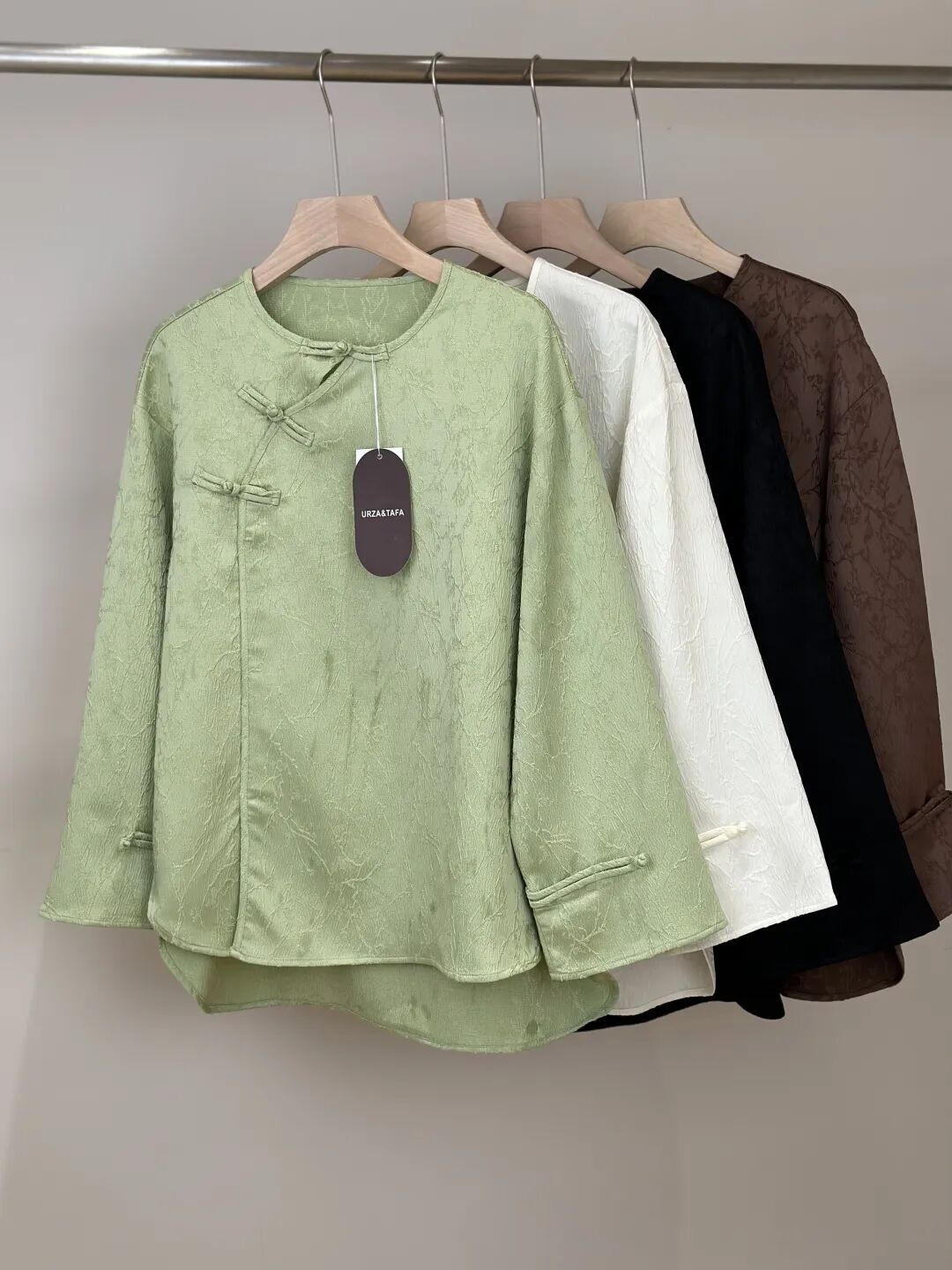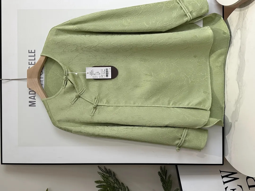 (3-5天发货)枯笔提花新中式衬衫,圆领中式右衽开襟,团云扣富有格调,重工浮雕提花,定制客供提花面料!