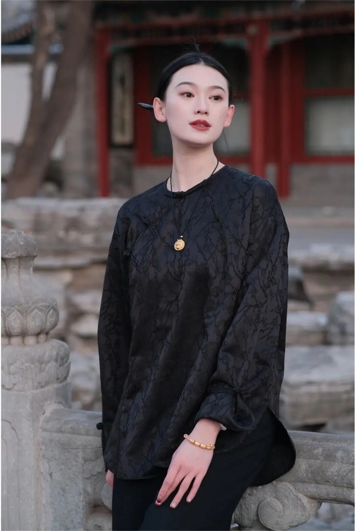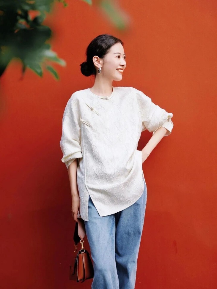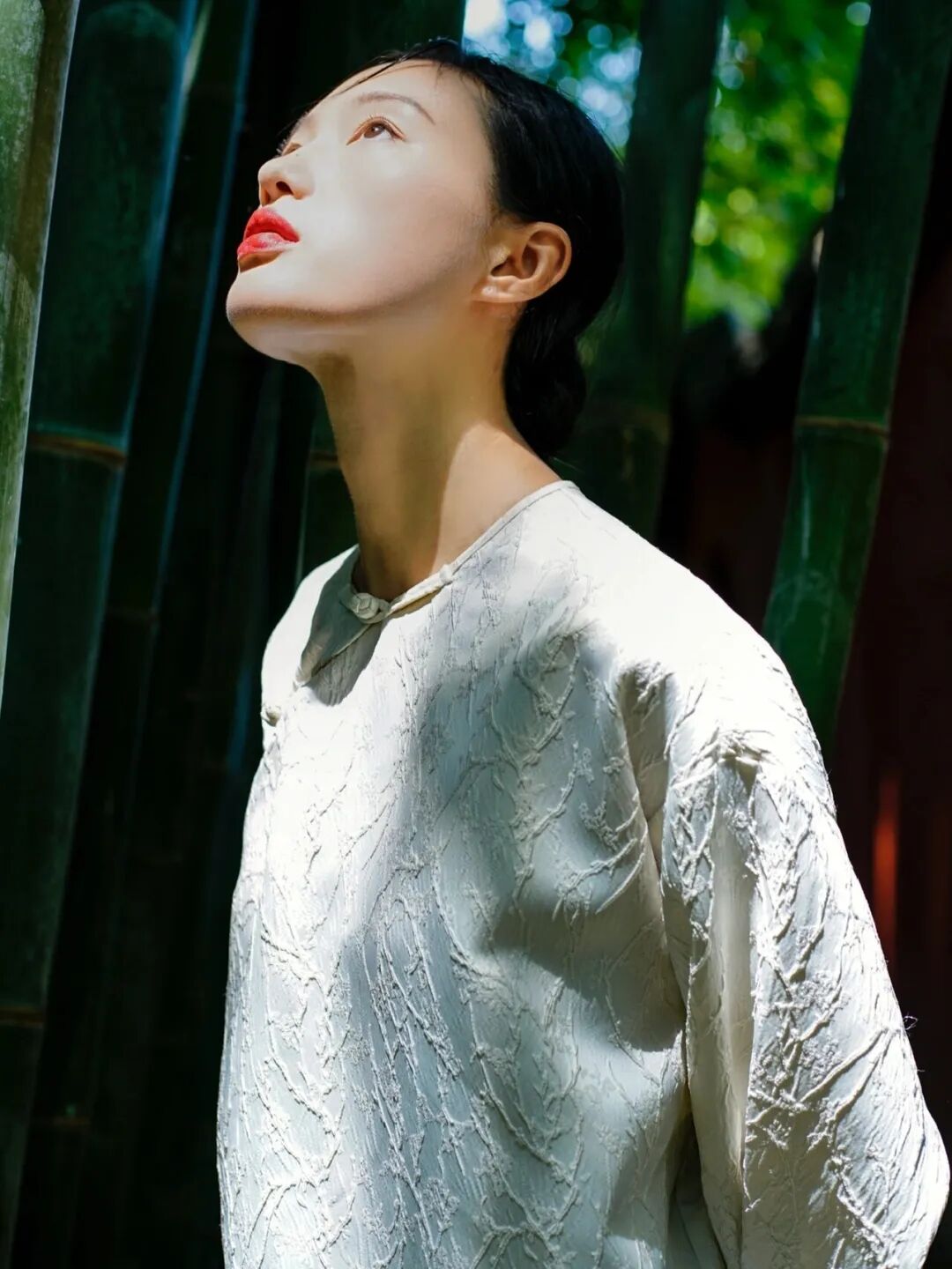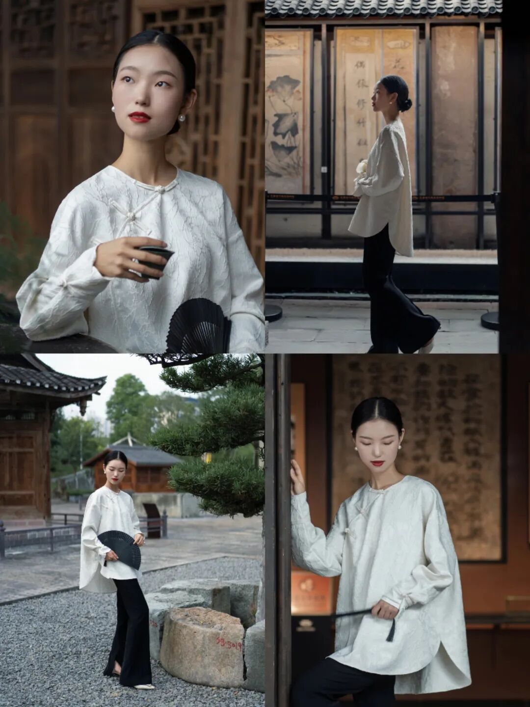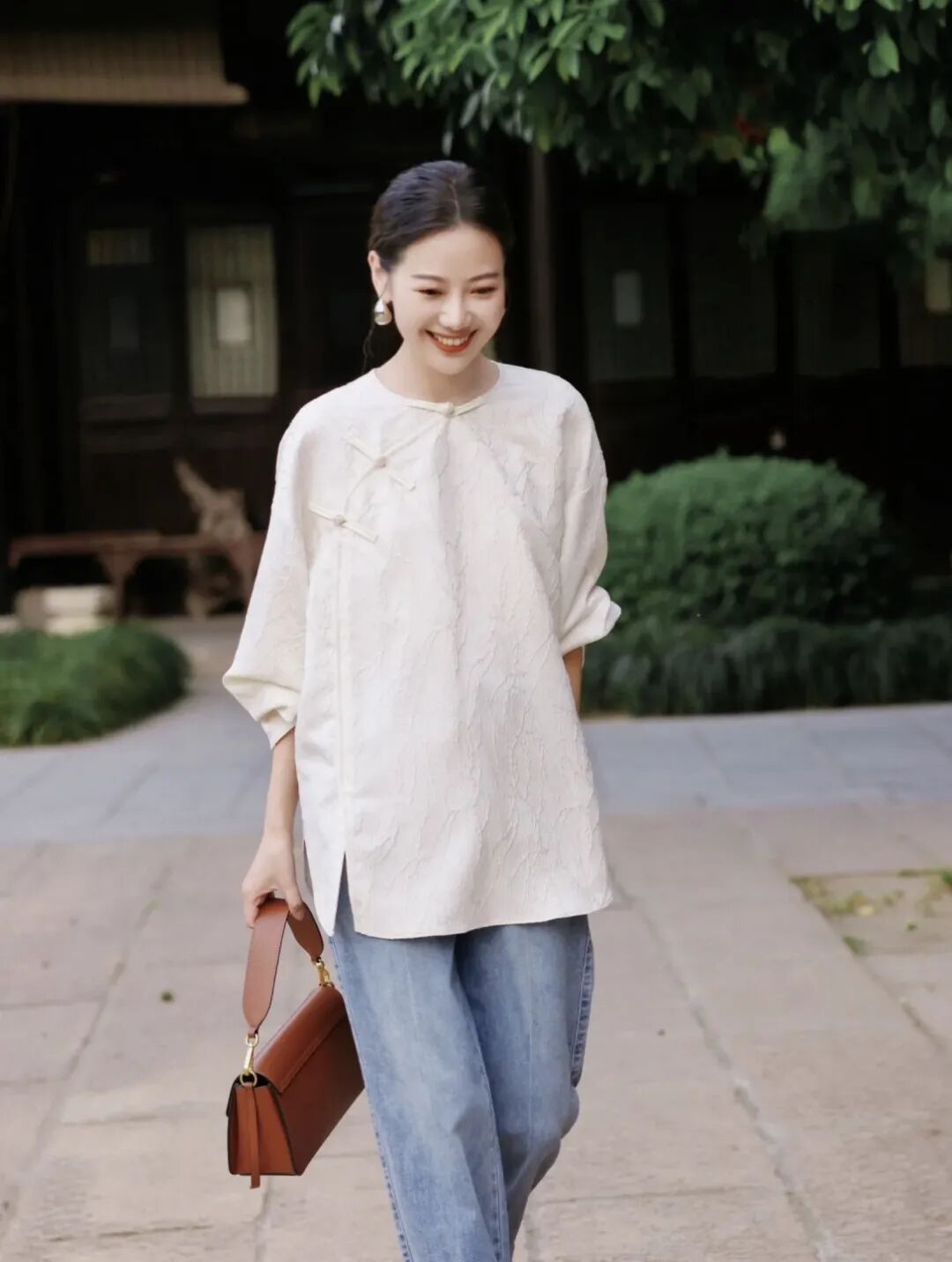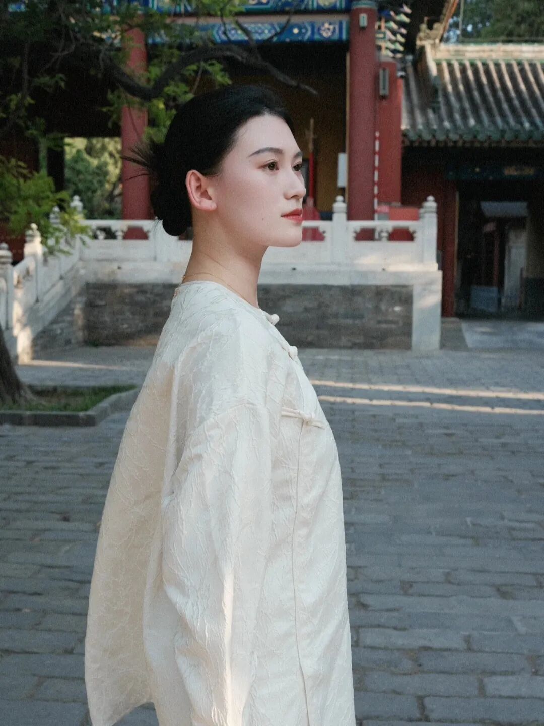 (3-5天发货)枯笔提花新中式衬衫,圆领中式右衽开襟,团云扣富有格调,重工浮雕提花,定制客供提花面料!