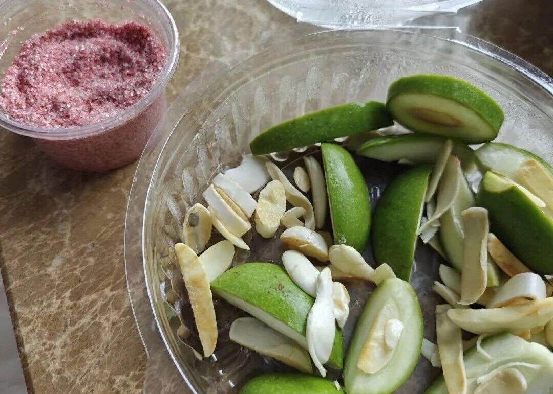 蘸椒盐没有成熟的枇杷芒也可以吃噢,切成片状蘸椒盐或者酸梅粉,就像广西的酸野。