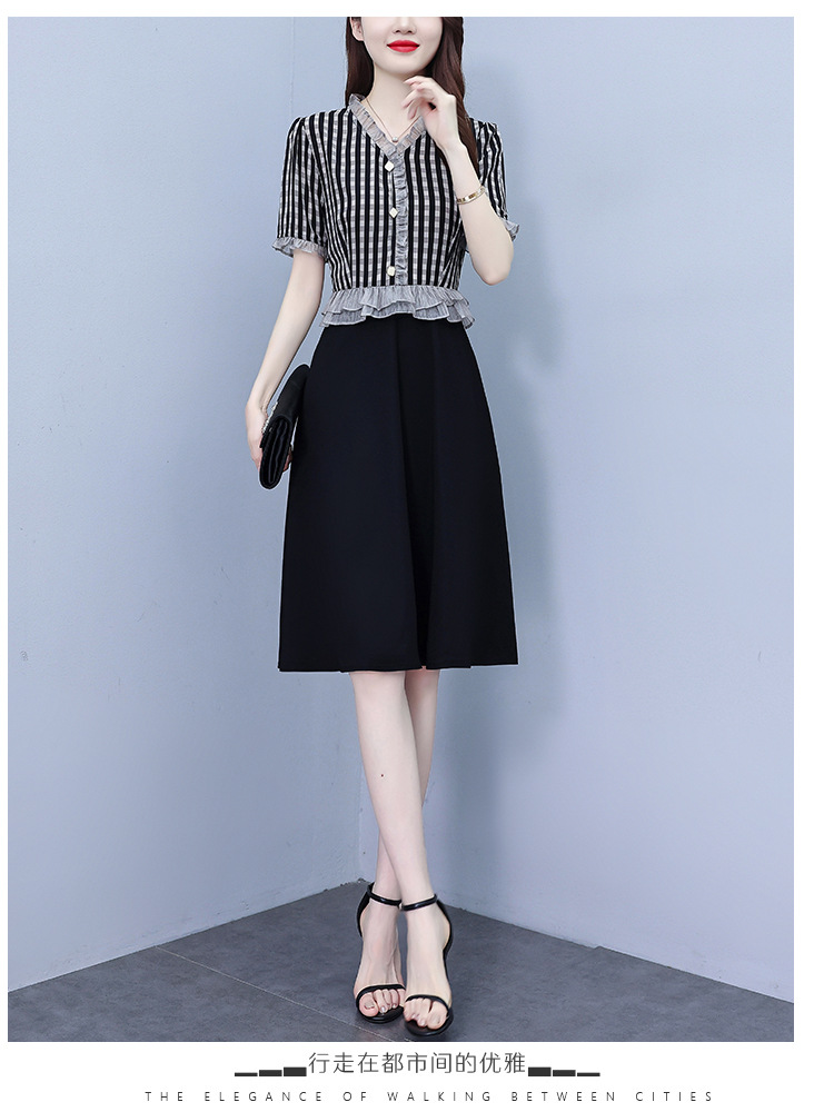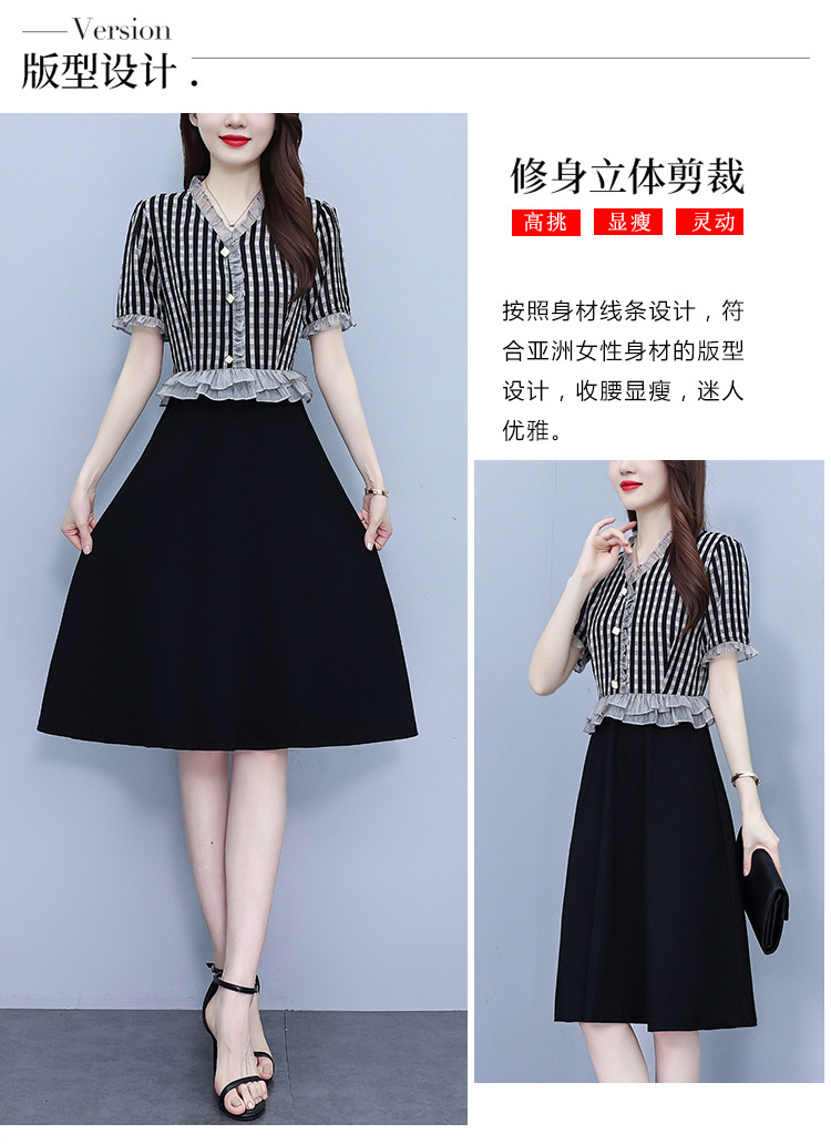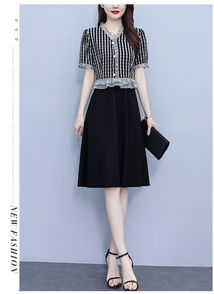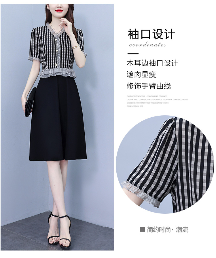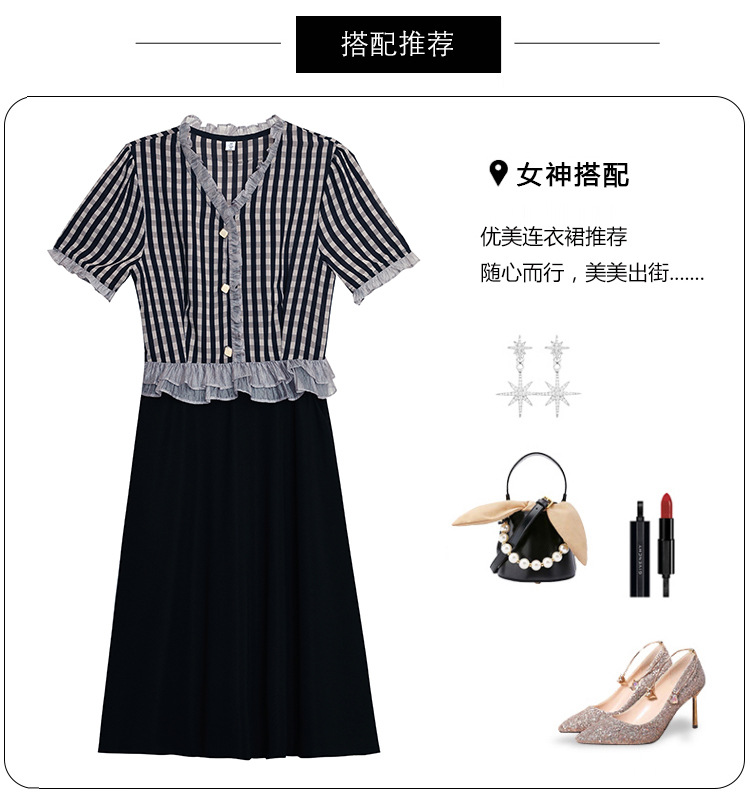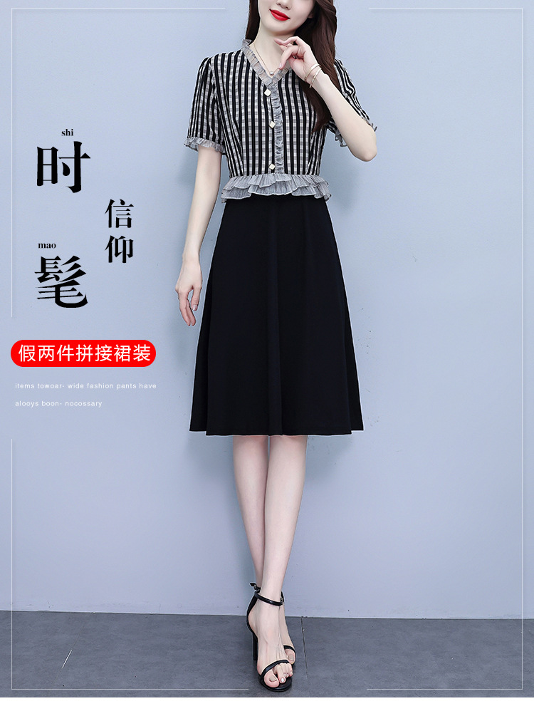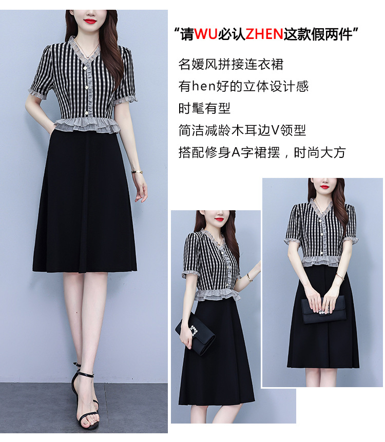 雀说条纹连衣裙新款时尚洋气V领拼接假两件胖MM显瘦中长裙AL8533