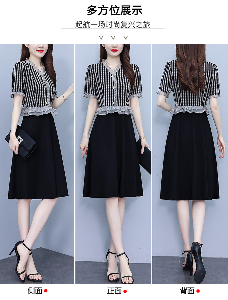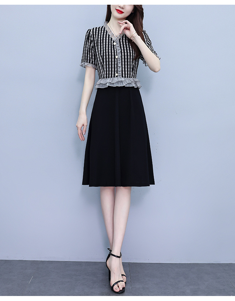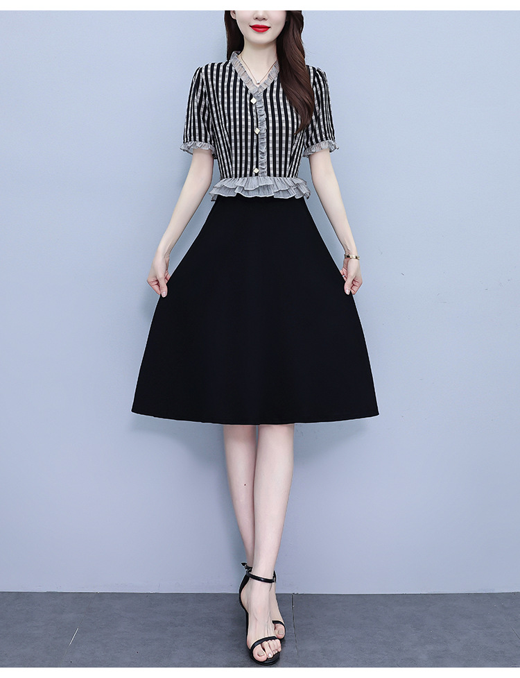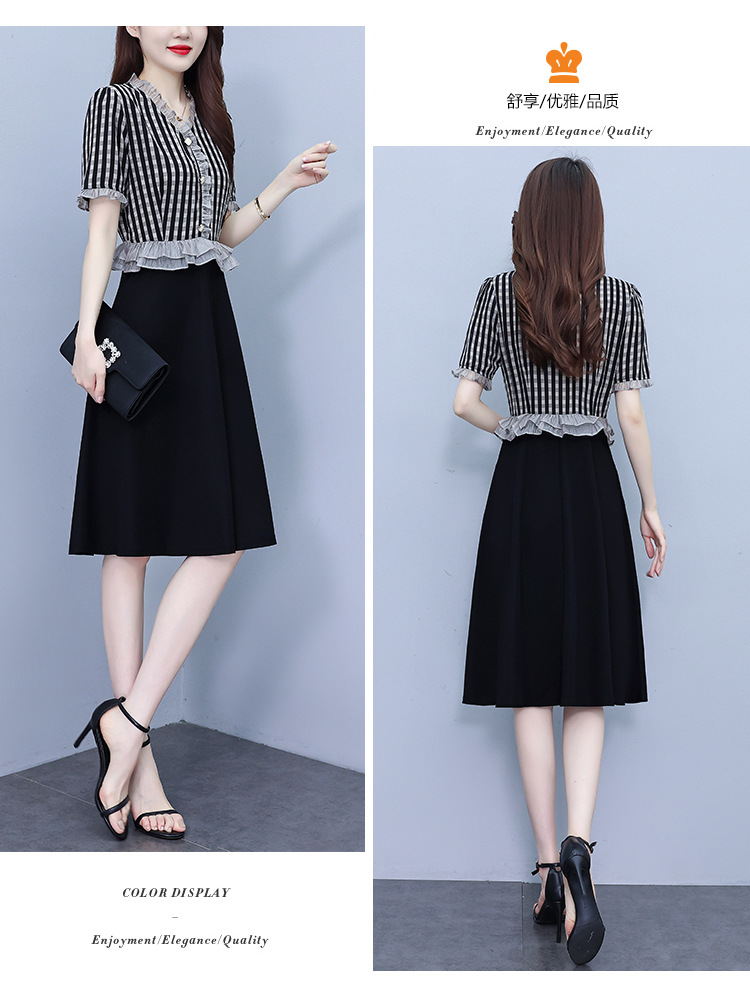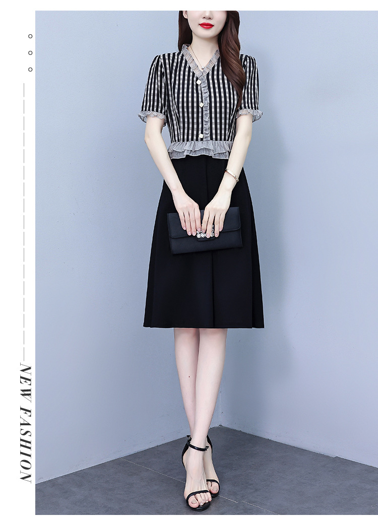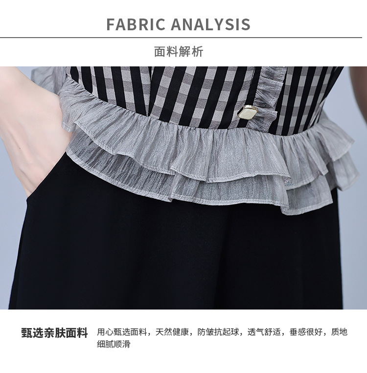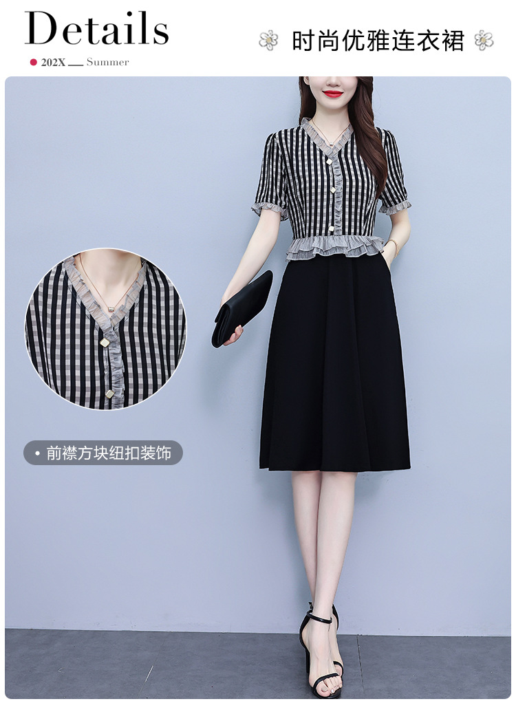 雀说条纹连衣裙新款时尚洋气V领拼接假两件胖MM显瘦中长裙AL8533