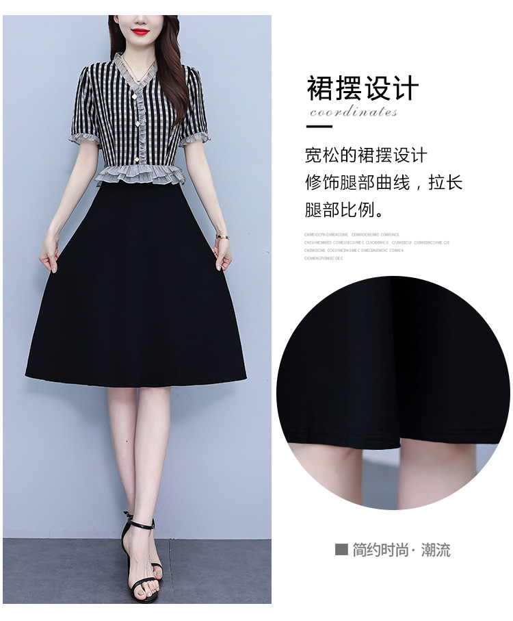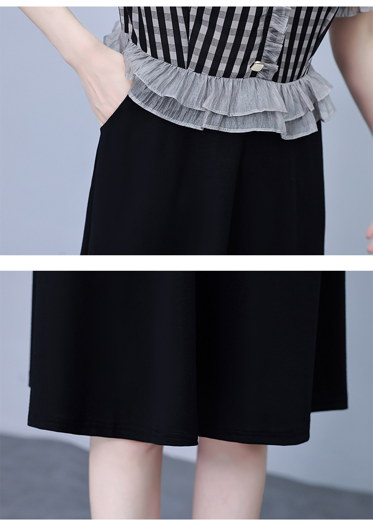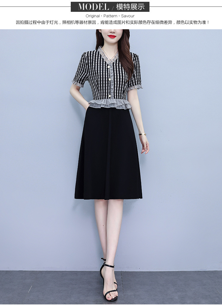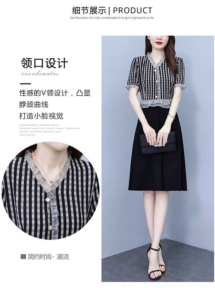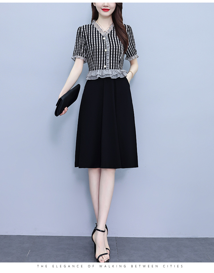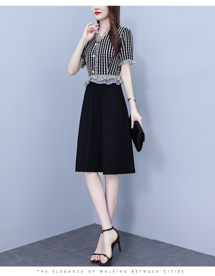 雀说条纹连衣裙新款时尚洋气V领拼接假两件胖MM显瘦中长裙AL8533