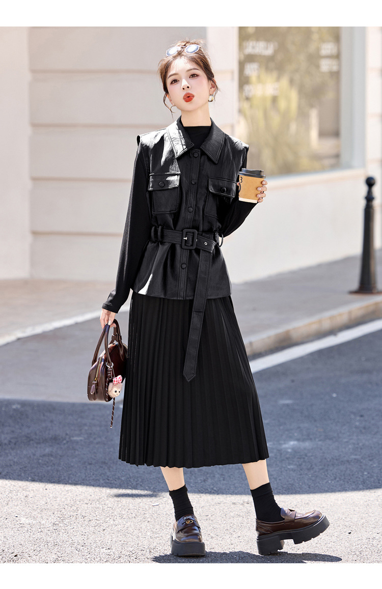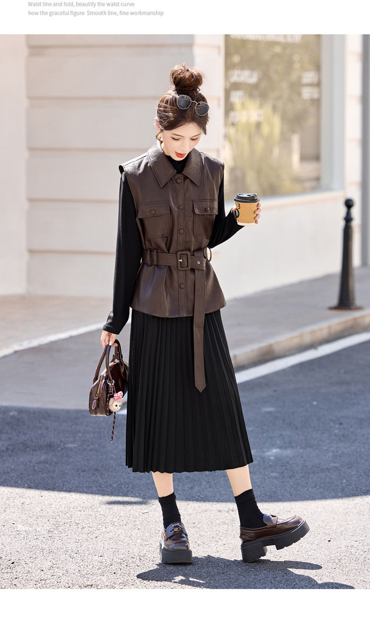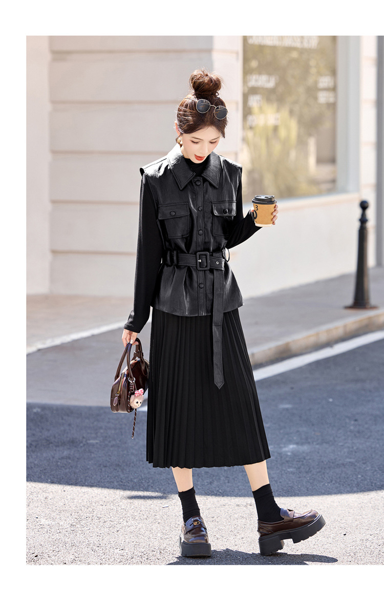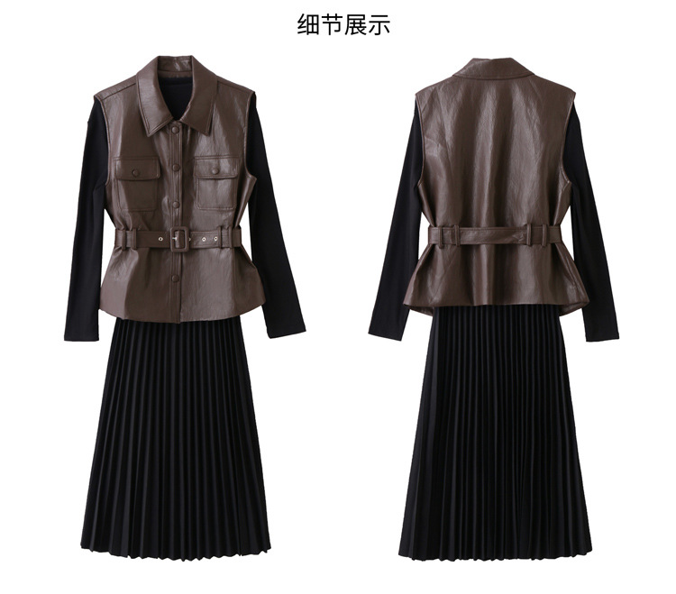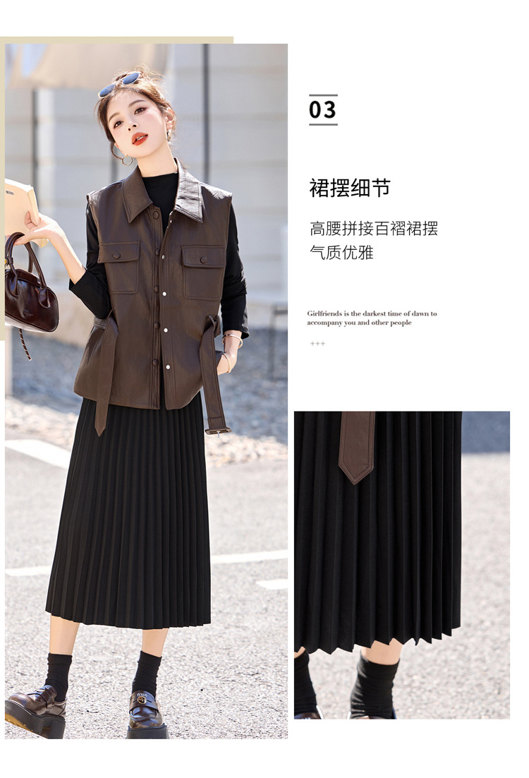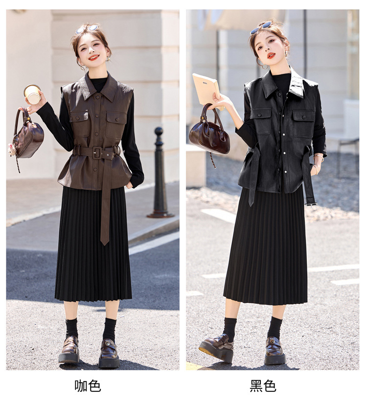 HR YF2620韩系气质PU皮马甲套装裙系带收腰显瘦百褶裙两件套 商品图4