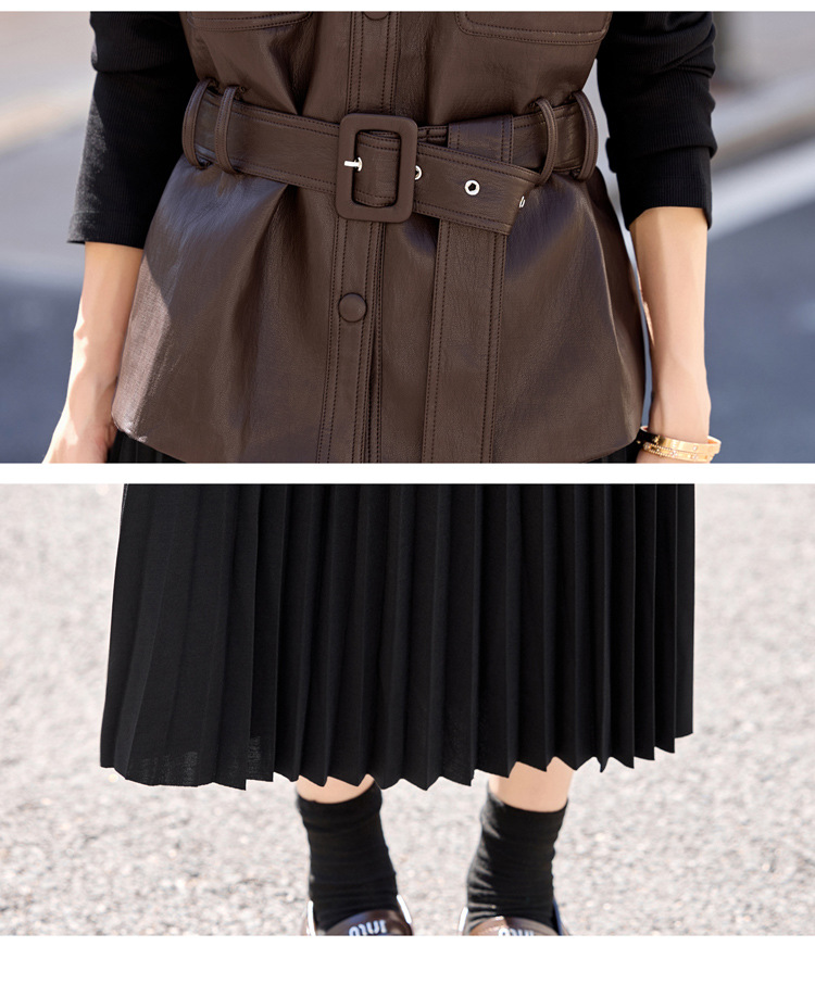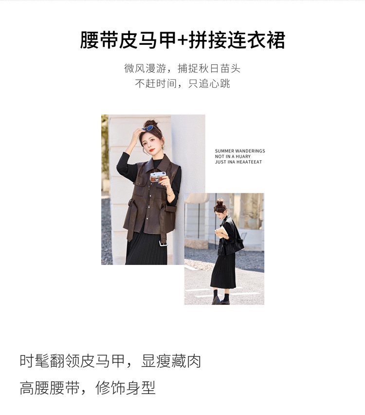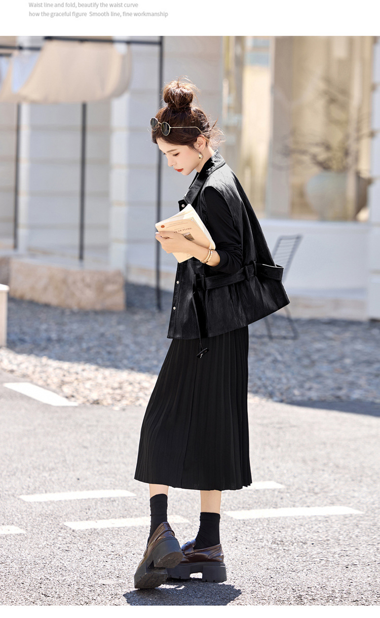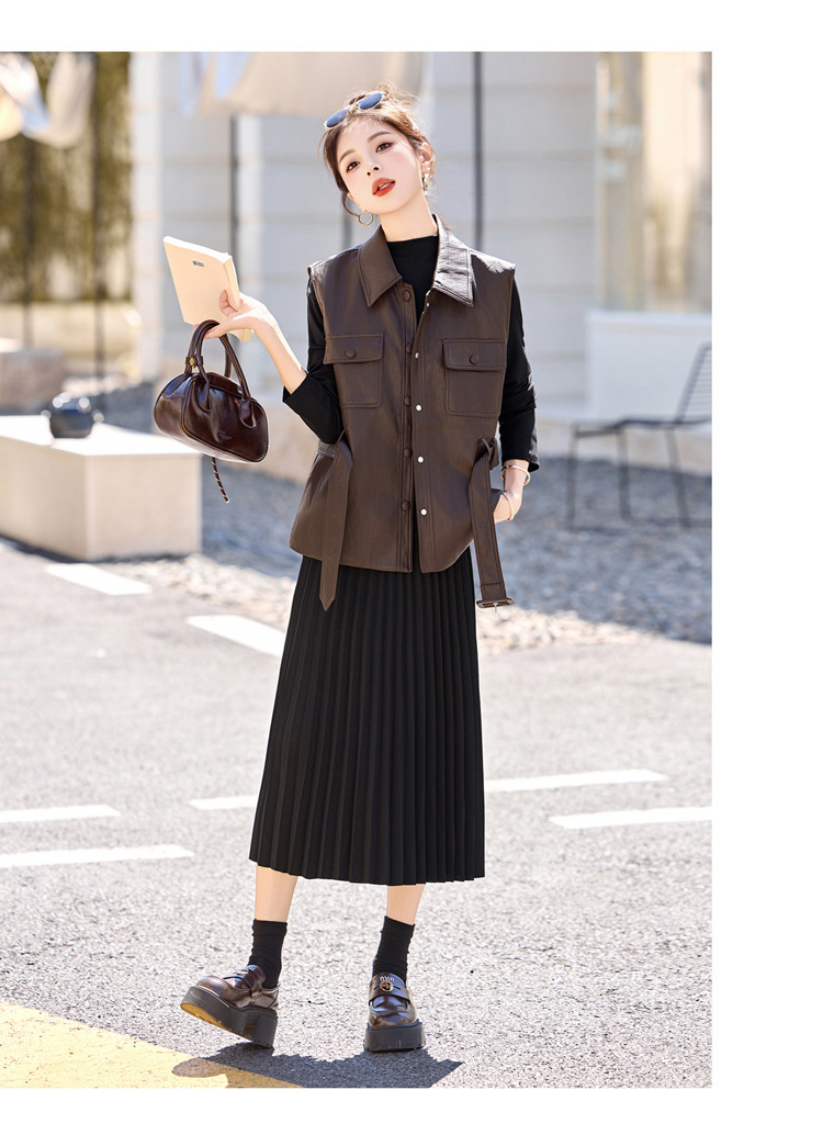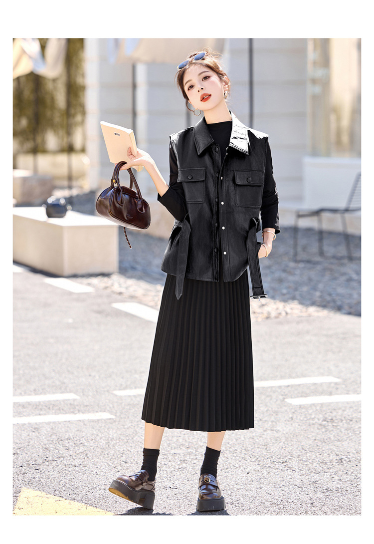 HR YF2620韩系气质PU皮马甲套装裙系带收腰显瘦百褶裙两件套 商品图4