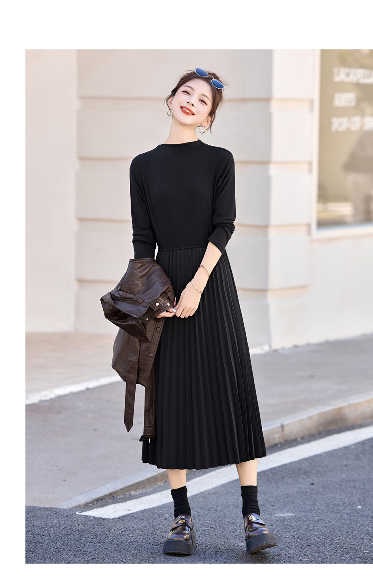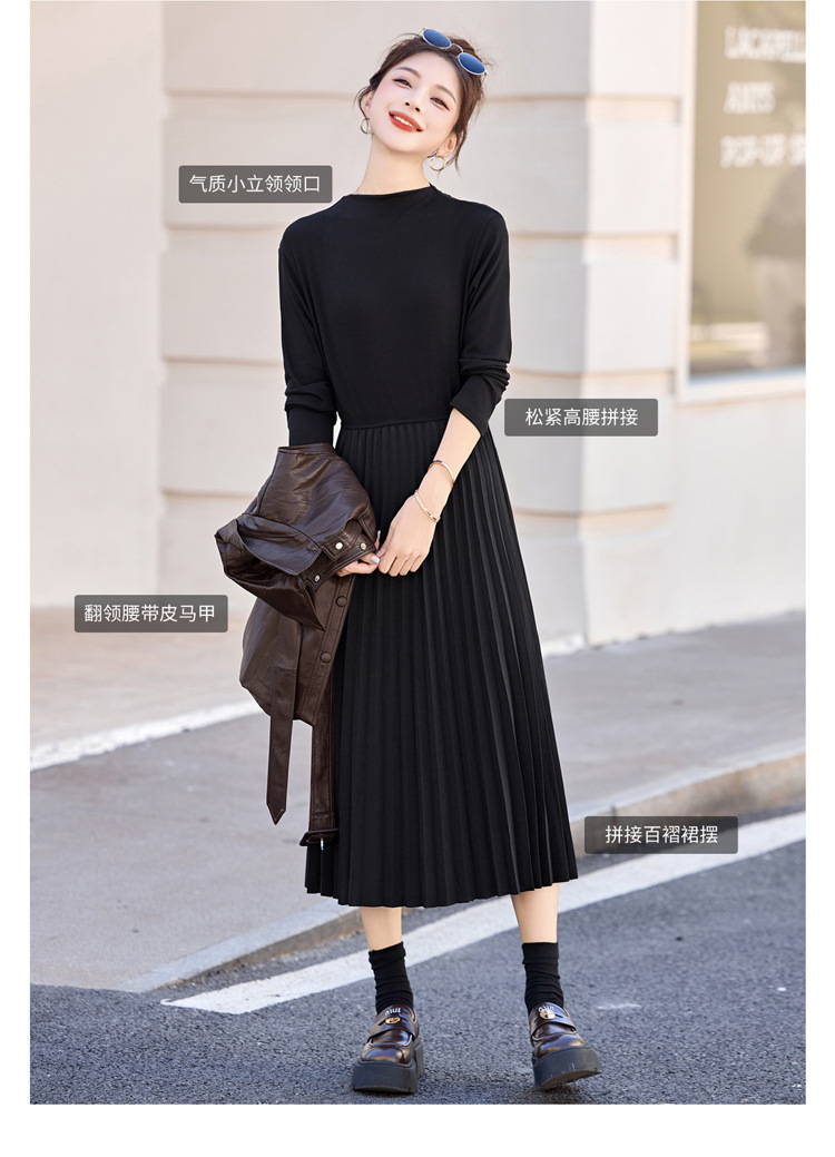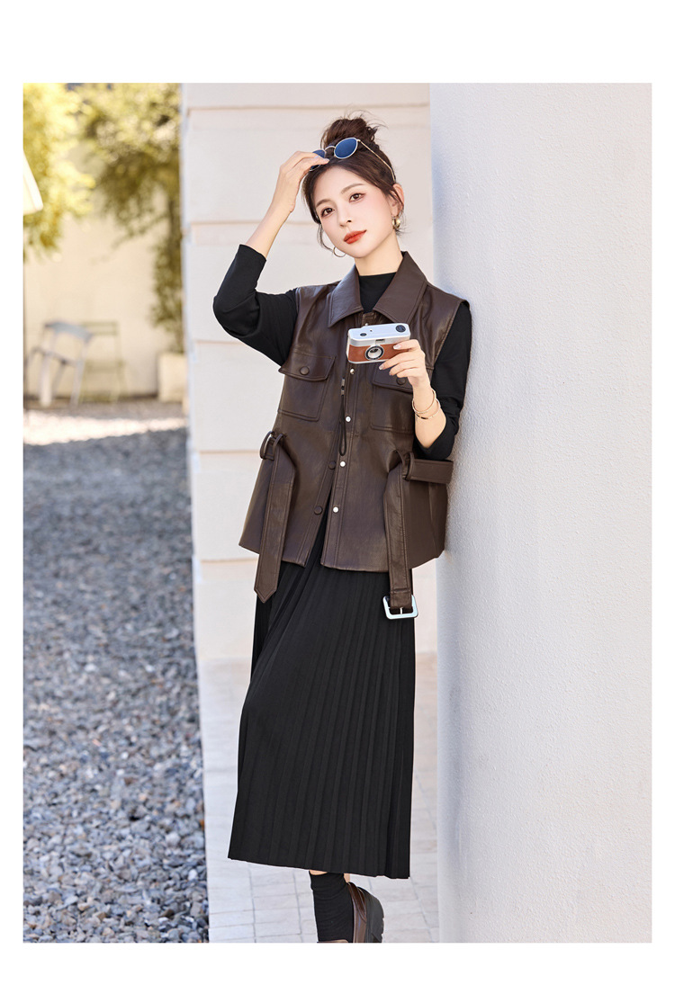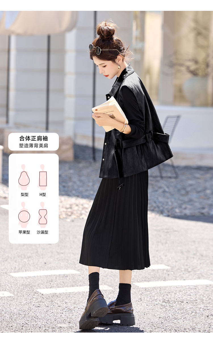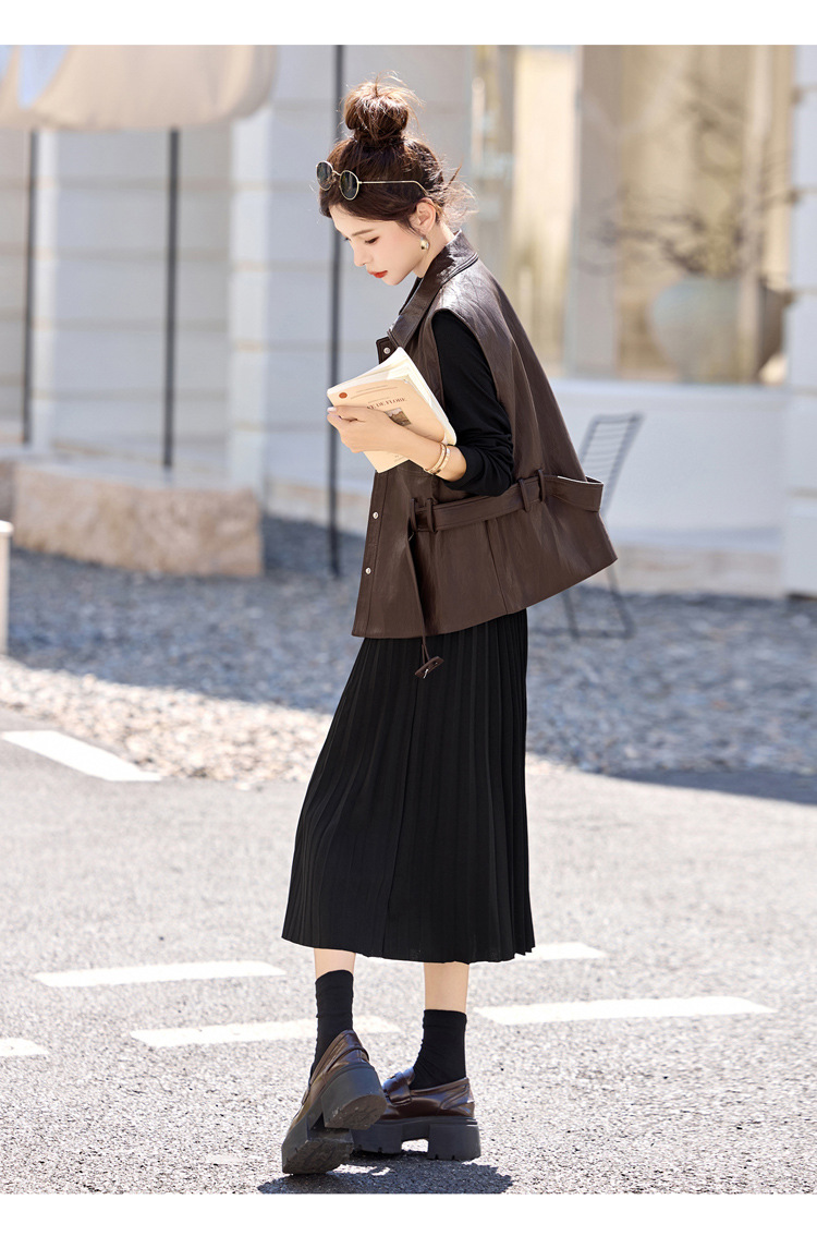 HR YF2620韩系气质PU皮马甲套装裙系带收腰显瘦百褶裙两件套 商品图4