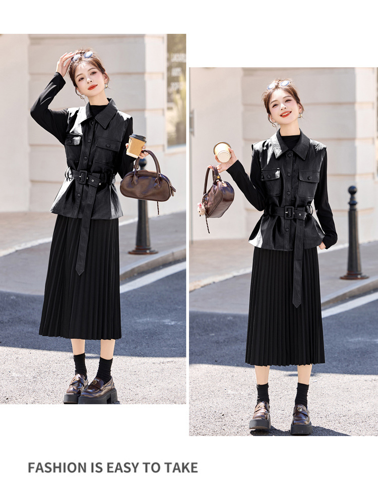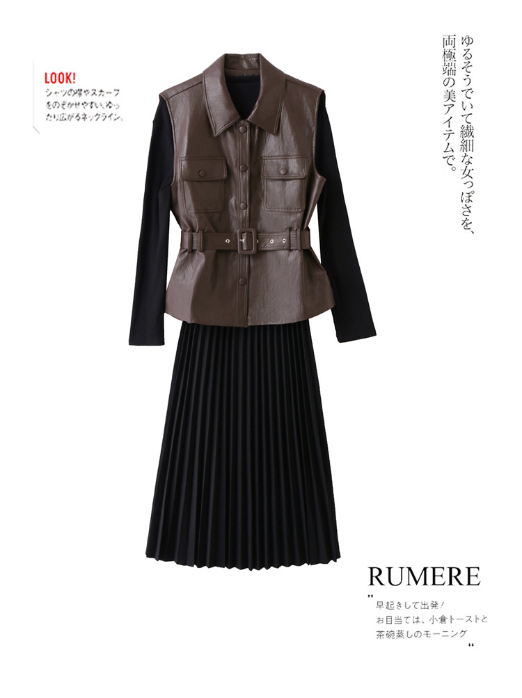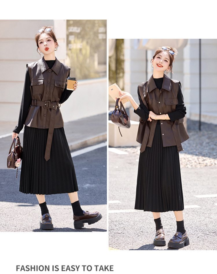 HR YF2620韩系气质PU皮马甲套装裙系带收腰显瘦百褶裙两件套 商品图0