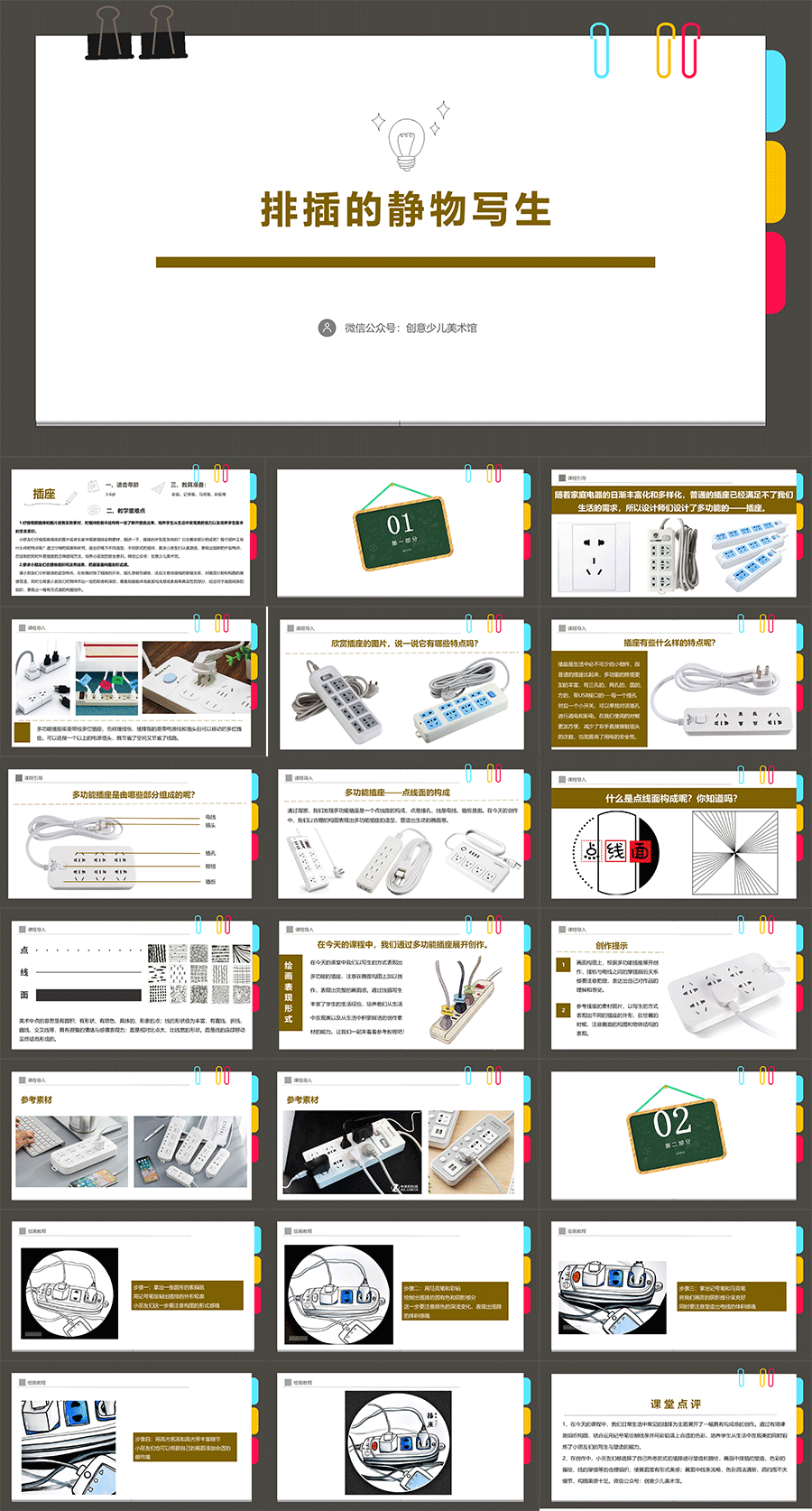 小朋友们仔细观察插排的图片或者在家中观察插排实物素材,描述一下,插排的外型是怎样的?它由哪些部分组成呢?每个部件又有什么样的特点呢?通过仔细的观察和研究,画出你笔下不同造型、不同款式的插排,要求小朋友们认真塑造,表现出插排的外型特点;在绘制的同时科普插座的正确使用方法,培养小朋友的安全意识。微信公众号:创意少儿美术馆。