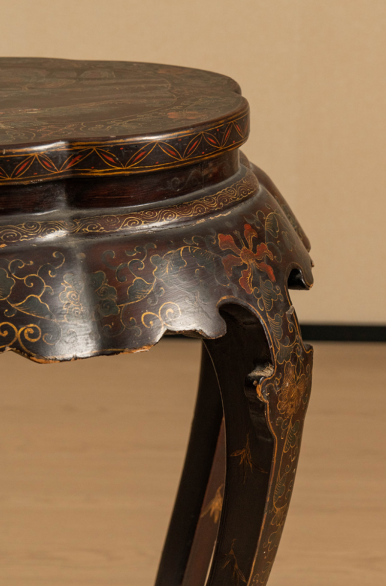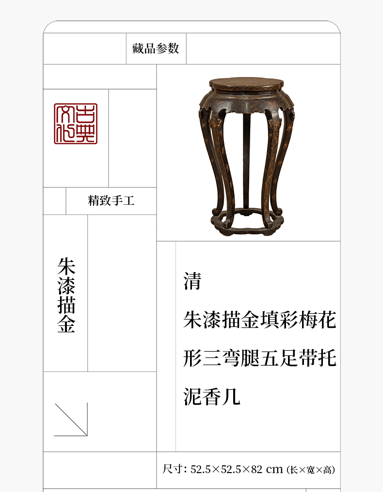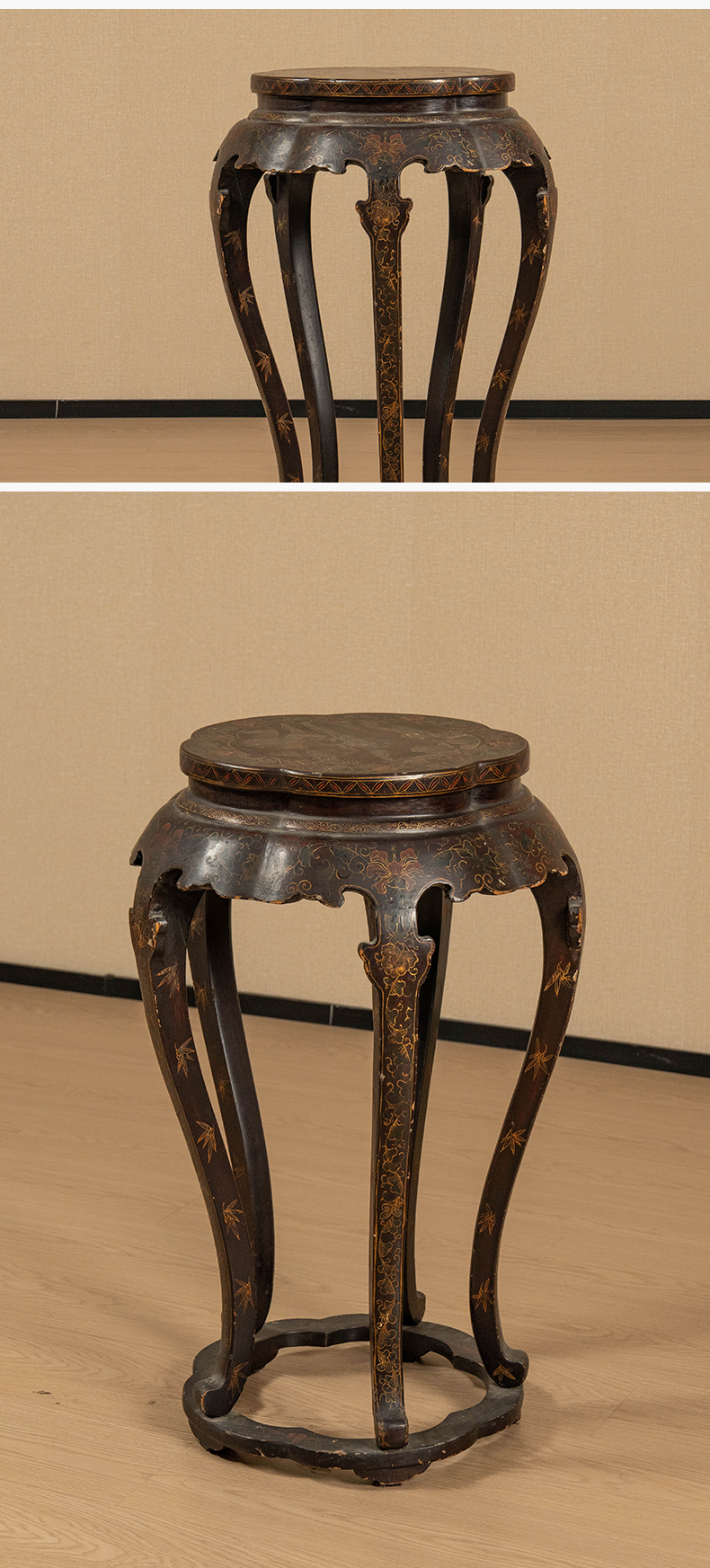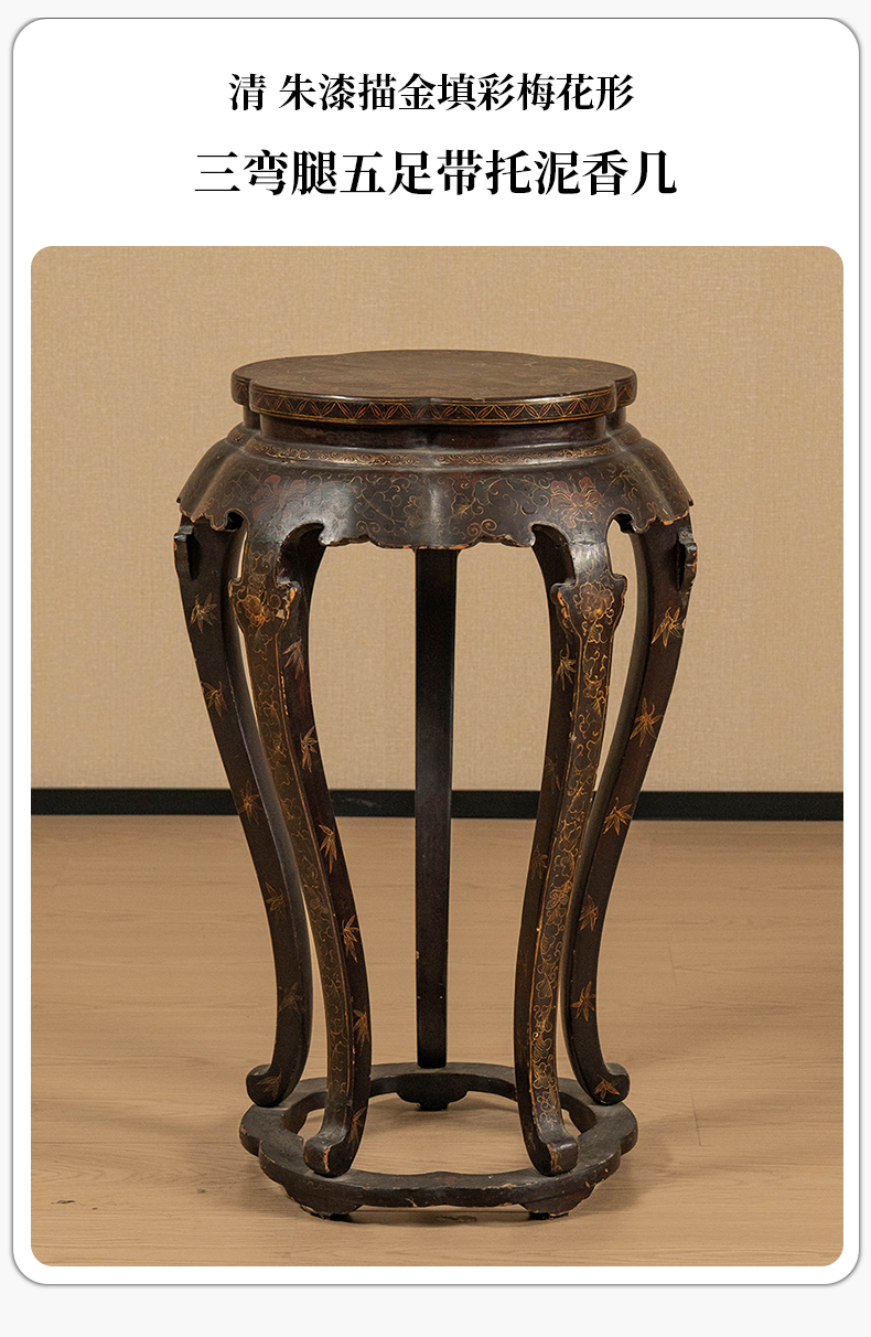 清 朱漆描金填彩梅花形三弯腿五足带托泥香几