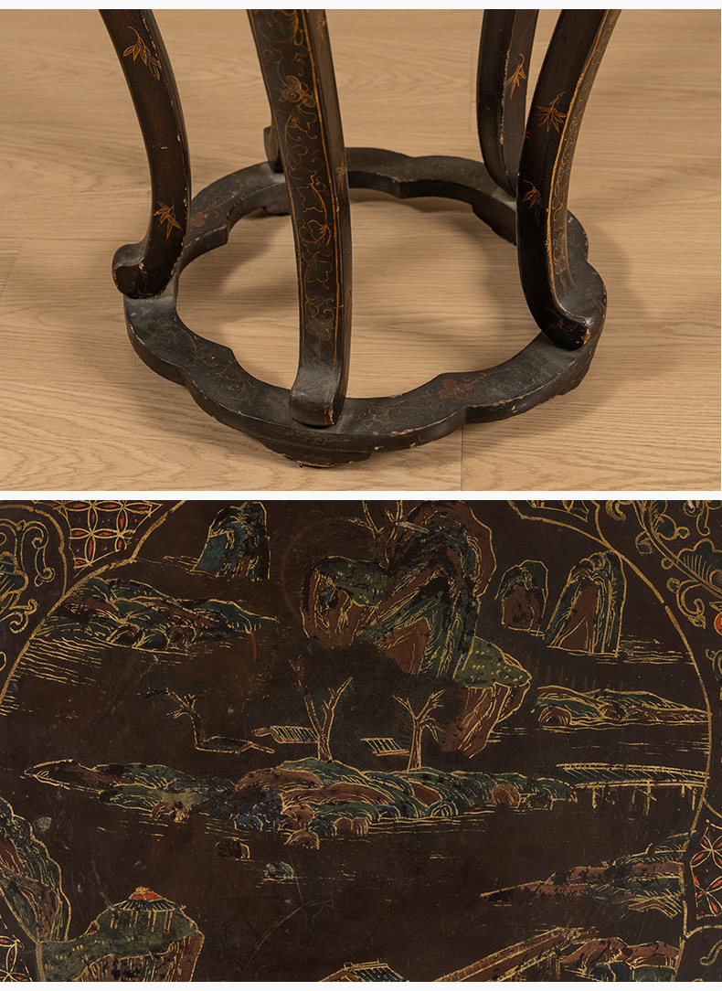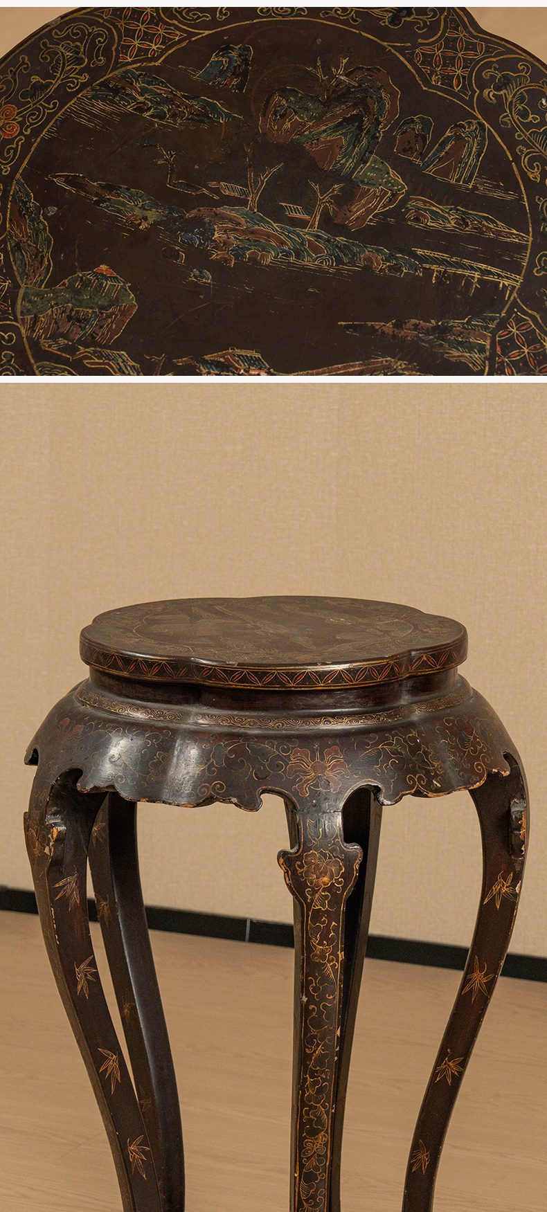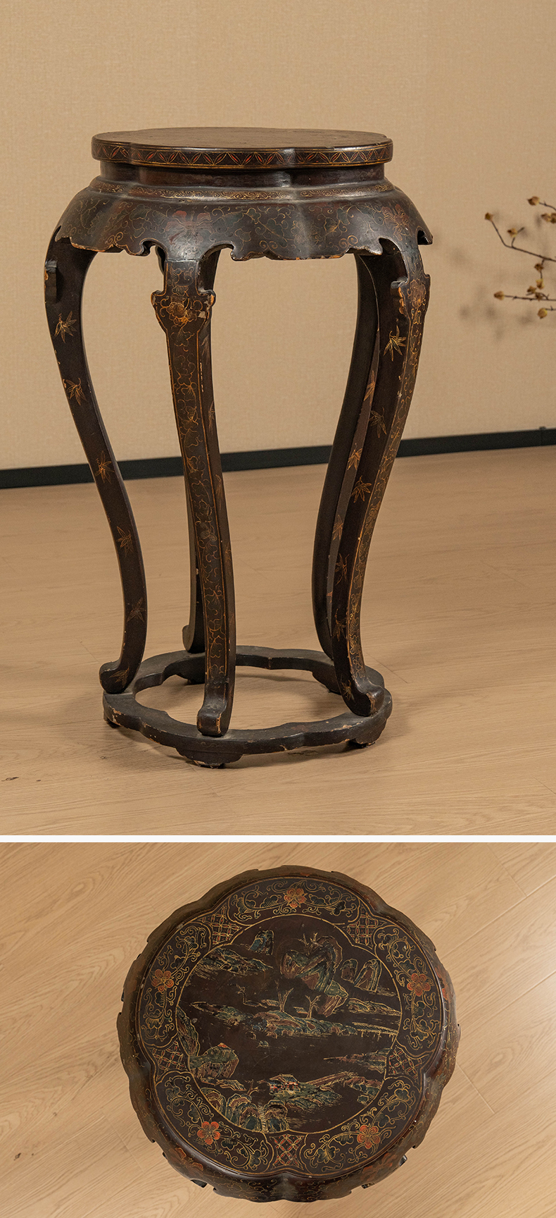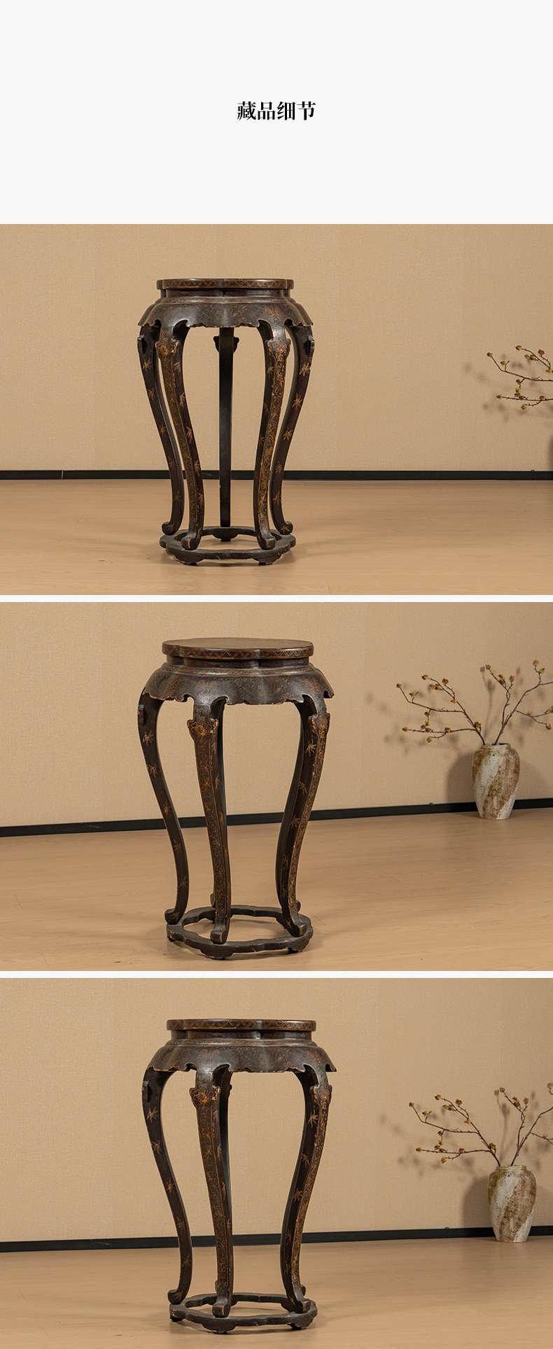 清 朱漆描金填彩梅花形三弯腿五足带托泥香几