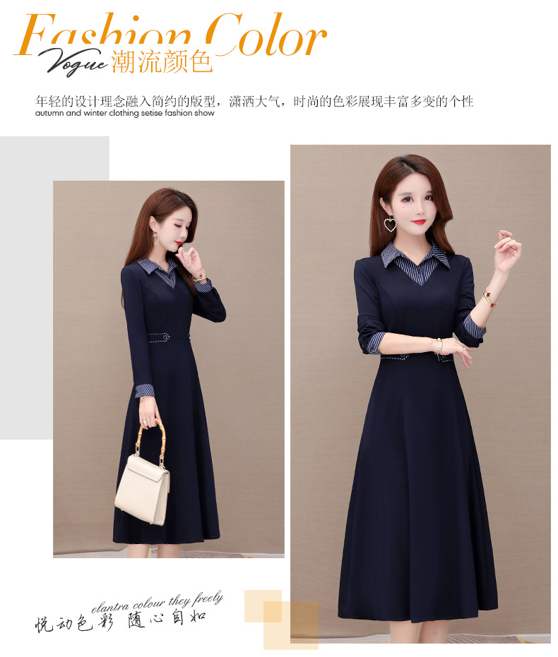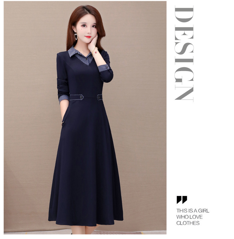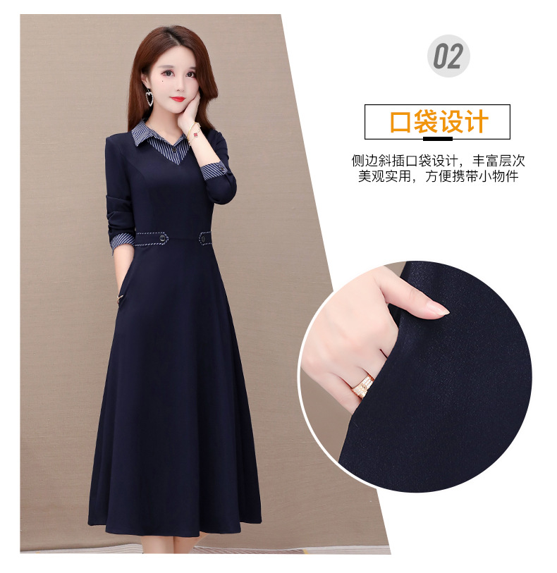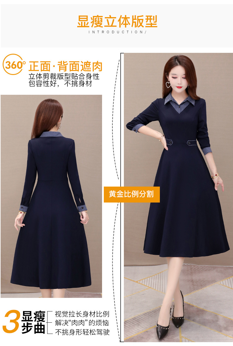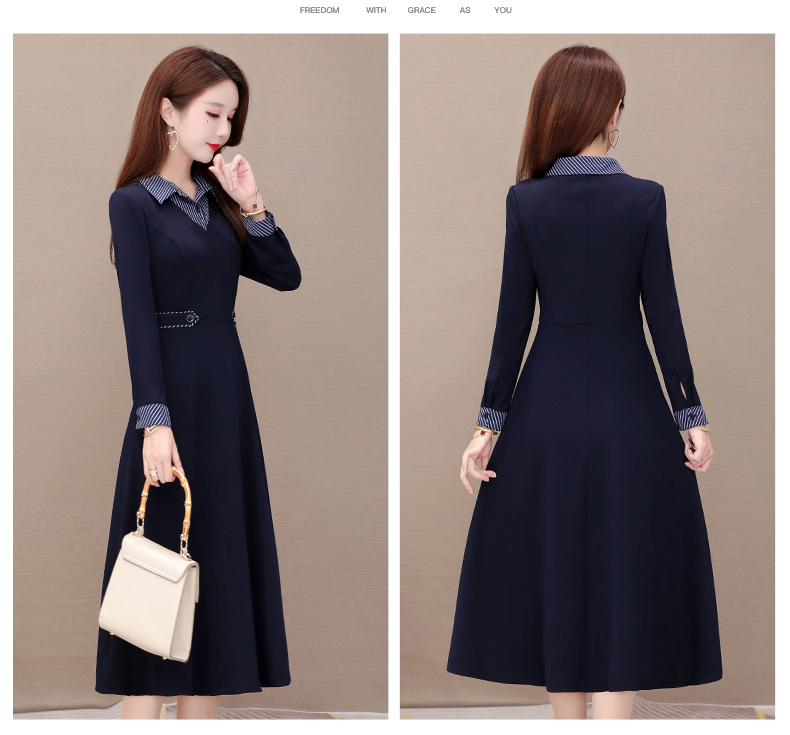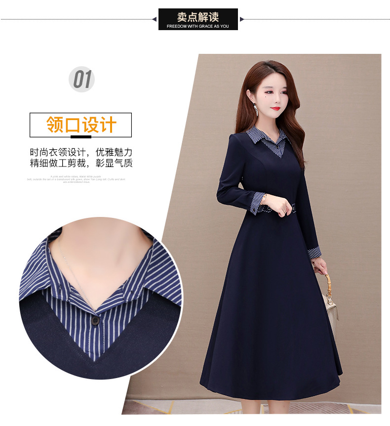 YWE-KED91317衬衣领条纹连衣裙女2020秋新款修身气质减龄长袖中长款过膝a字裙