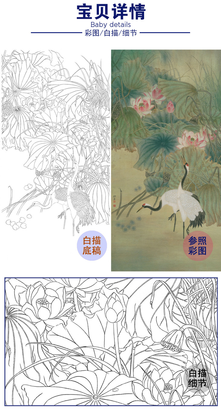 竖幅工笔花鸟白描底稿-荷花仙鹤-李科宏-A136