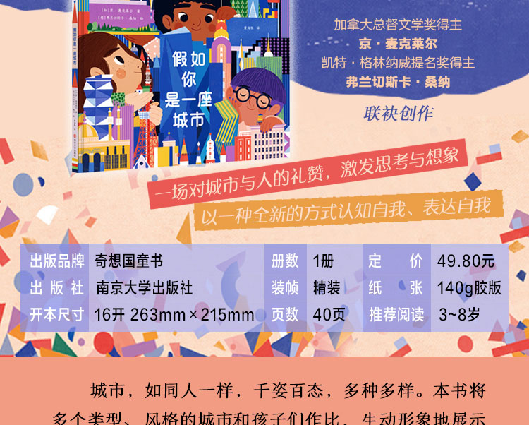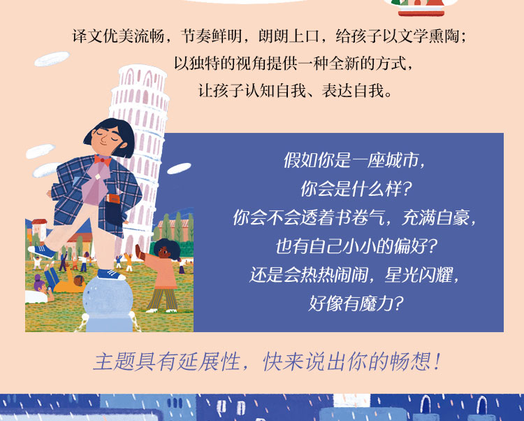这本书将吸引读者探索不同城市之间的异同,感受城市中的多彩生活,看到世界的多样性,在发问中思考人与城市的关系,以及人与人的关系。同时,孩子们将开拓思维,以一种全新的方式来认知自我、表达自我。亲爱的小孩,假如你是一座城市,你会是什么样?